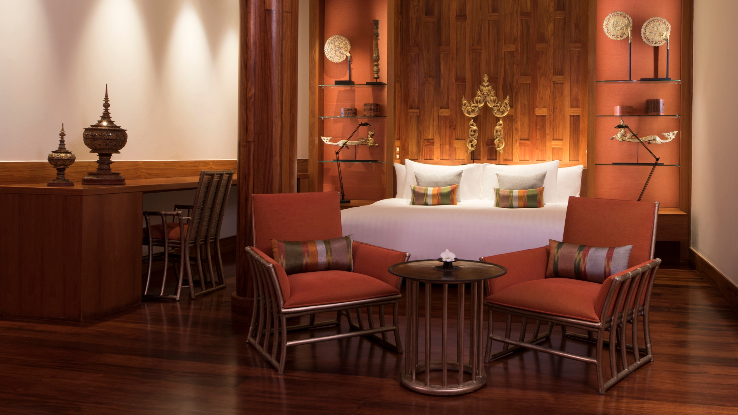The forty elegant pavilions and villas are designed with traditional Thai architecture in mind sit amidst an exotic coconut plantation. Each has a sun deck, dining terrace, King sized bed and an oversized bathroom.