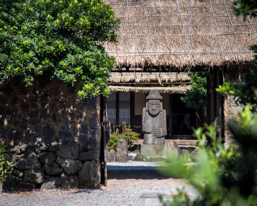 Seongeup Folk Village embodies the distinctive culture and traits of Jeju Island, featuring iconic elements like the black lava rock walls, strategically designed alleys that are both straight and curvy to shield against the wind, and the ubiquitous stone grandfather statues known as Harubang.