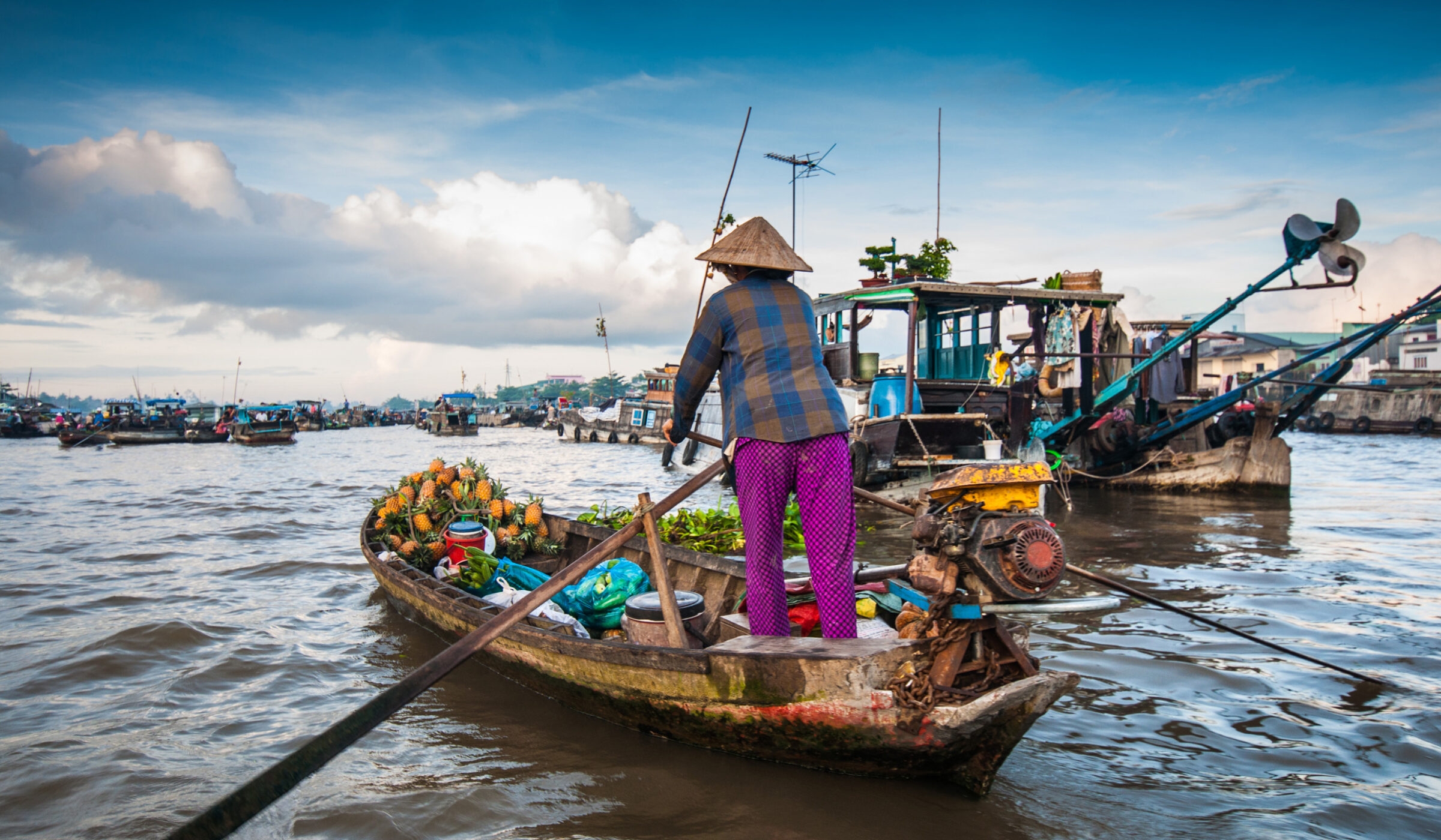The buzzing cultural and commercial centre of the Mekong Delta, Can Tho sits on the southern bank of the Hua River, one of the Mekong’s main distributaries as it flows out past endless paddy fields into the South China Sea. At the heart of an incredibly fertile region known as the ‘rice basket of Vietnam’, Can Tho is famous for its floating markets where people trade all sorts of fresh produce from traditional sampan boats. A seemingly unchanged aspect of rural life down here, they are a fascinating contrast to the modern development of the city encapsulated by the vast Can Tho cable stay bridge which spans the river.