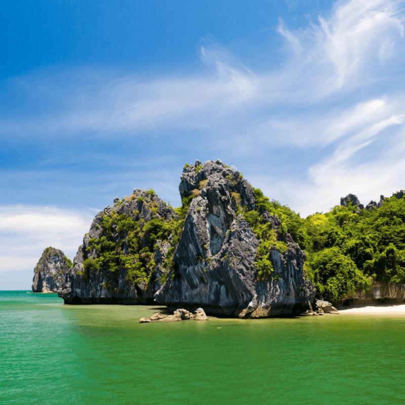 Limestone outcrops blanketed in lush vegetation rise up from the still, jade coloured water. Your boat glides smoothly across the glassy surface, the shapes and shadows of the islets changing as you navigate this watery paradise. This is La Ha Bay, the smaller, quieter and altogether more serene neighbour of Halong Bay.