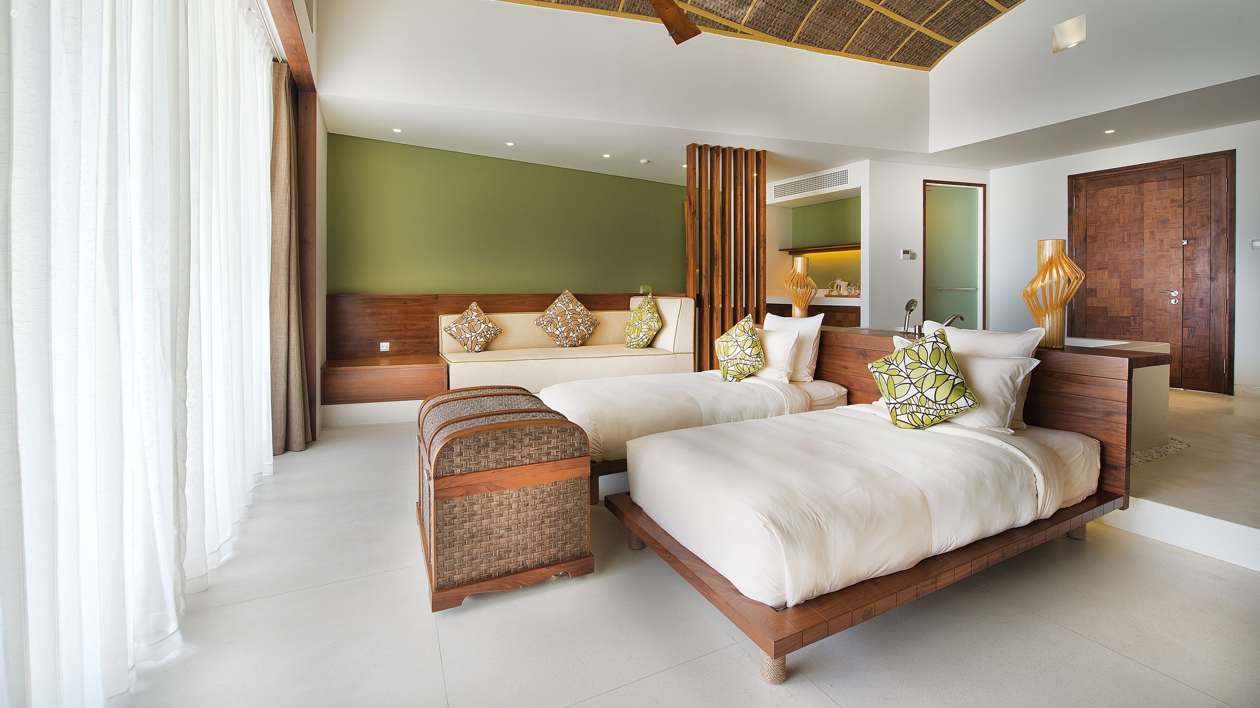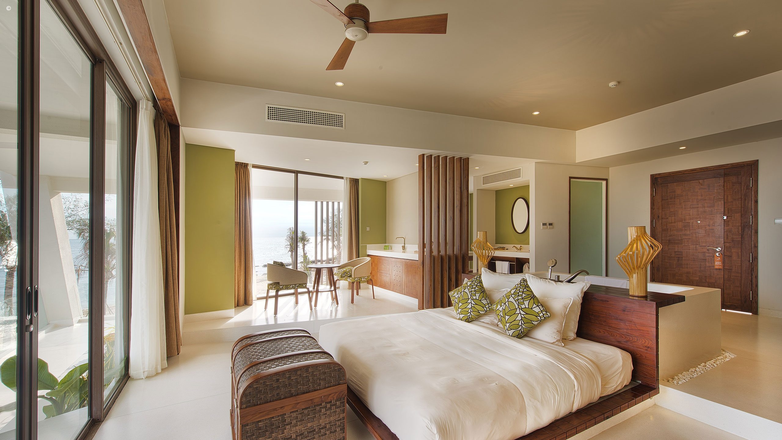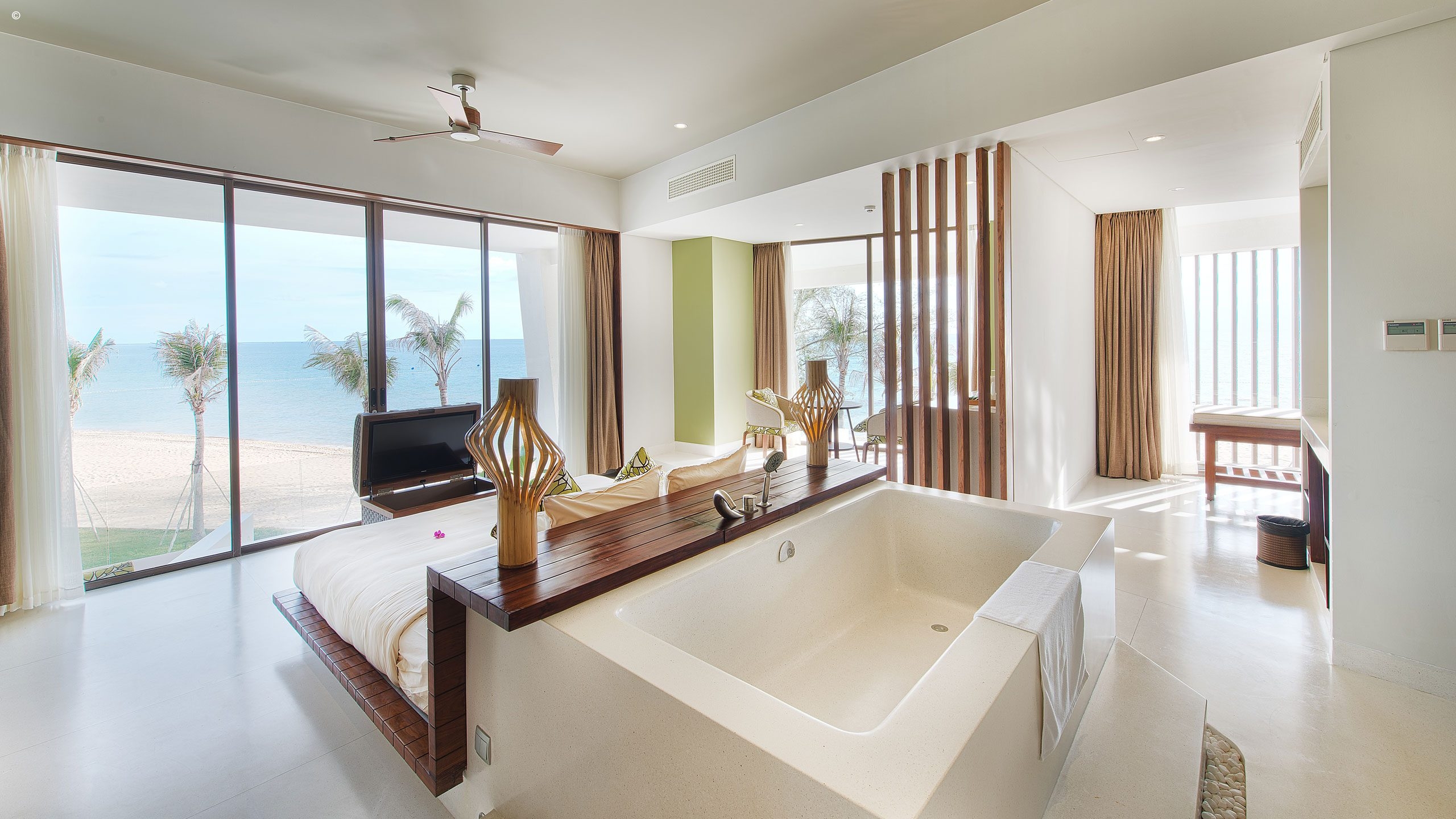 Every room and suite here features indulgent spa treatments and is decked out with deluxe fittings. Here you can look forward to soaking in your marble bath and soaking up the tempting Gulf of Thailand views from your floor-to-ceiling glass windows and private balcony.