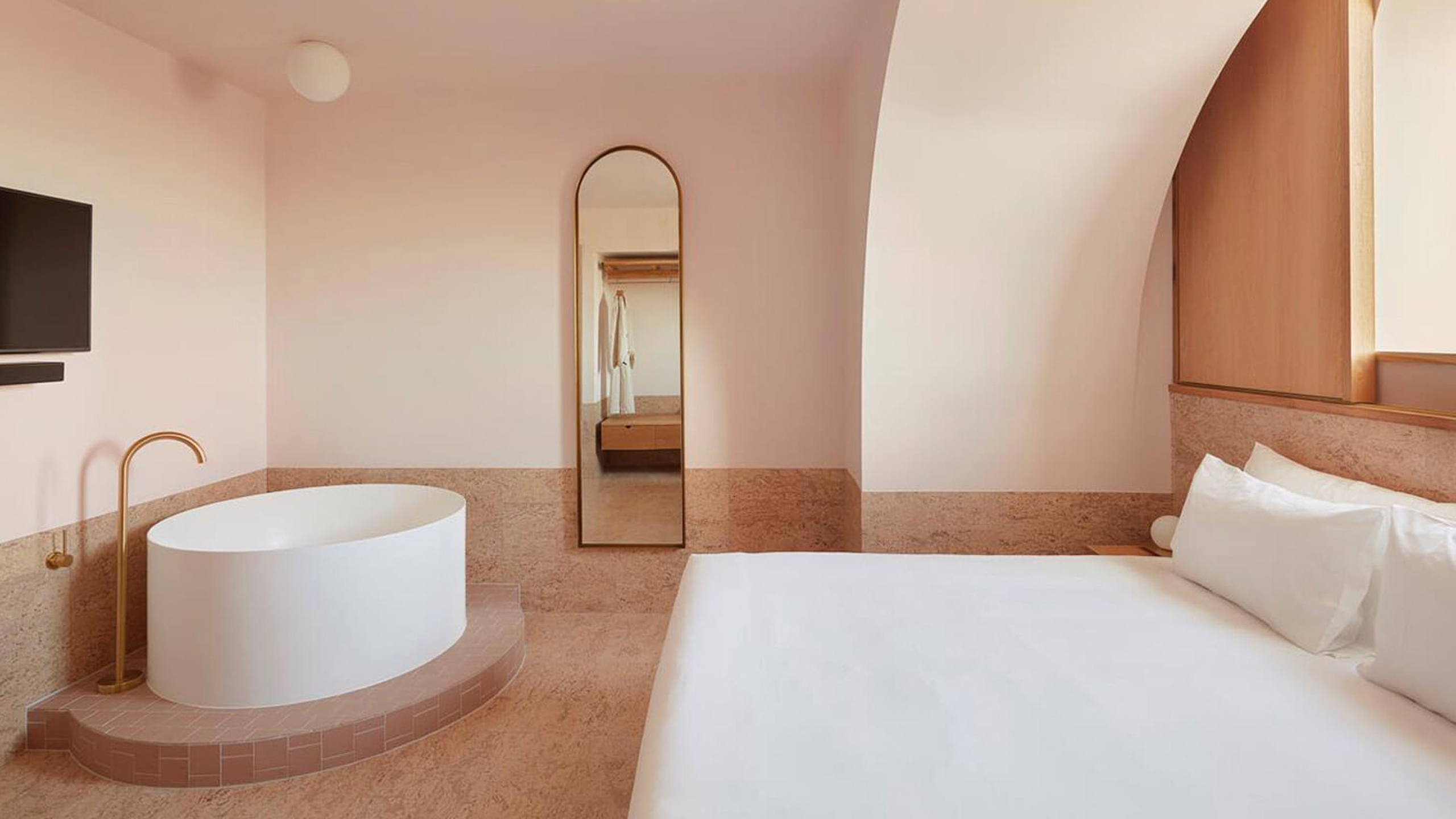The pool and spacious deck serve as the main highlight, encircled by striped cabanas, which you can dine and drink in. The lobby bar, with playful fabrics, curved arches and low-hanging lights is where breakfast is served, as well as tipples and light snacks throughout the day. Hellenika, the hotel’s main restaurant, facing the pool, promises a menu of small authentic Greek dishes, ideal for sharing. To work out post-feasting, a fully-equipped fitness centre is positioned on the ground floor, and for further indulgence, a coral-coloured spa will have you breathing easy.