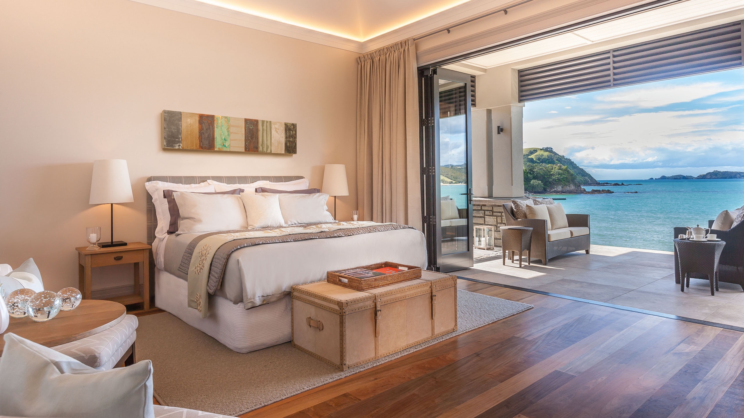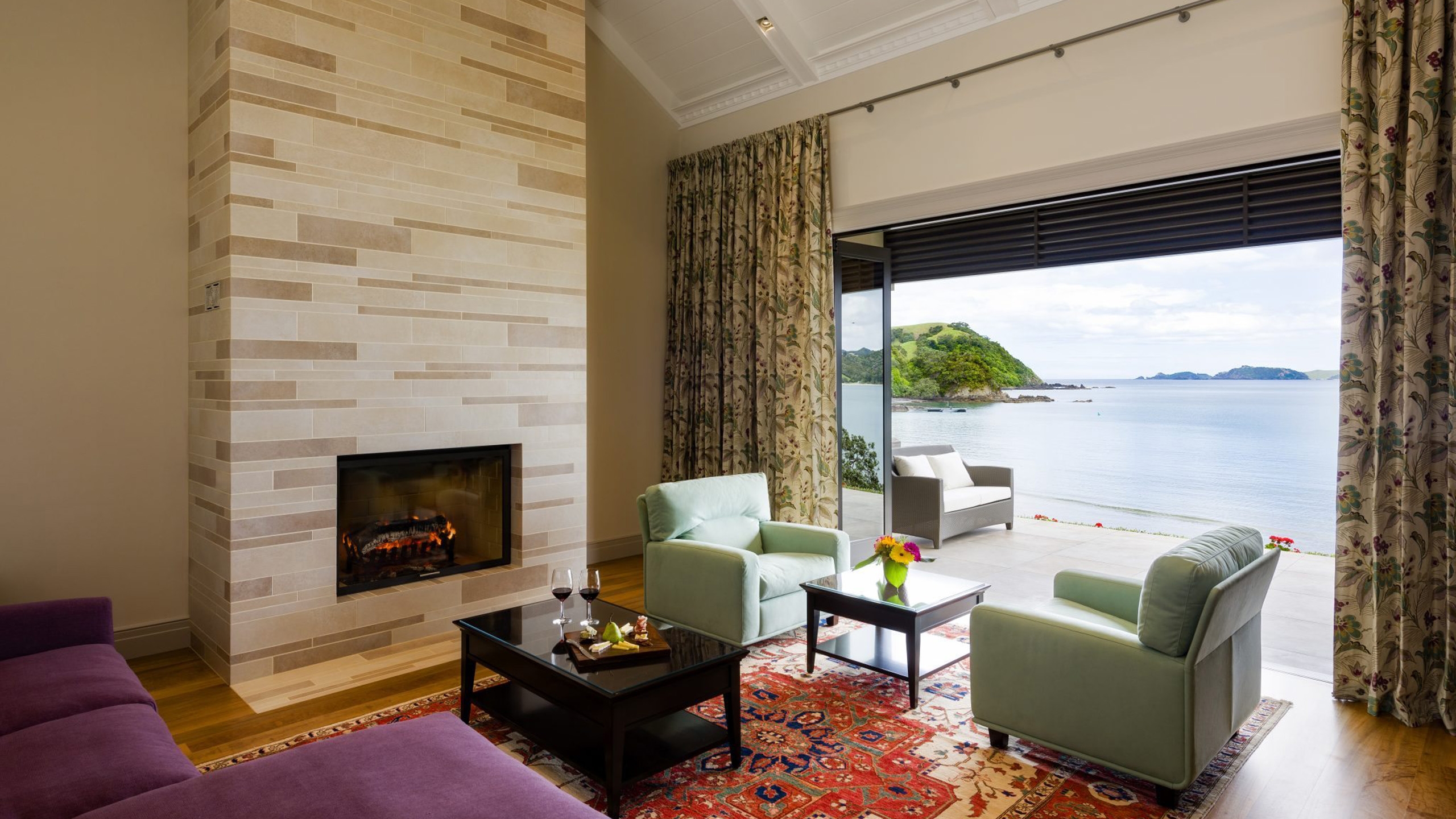 There are just five individual suites, each named after native birds, with balconies and views to the South Pacific Ocean. The two larger villas have their own fireplaces and bathtubs. Leica binoculars are provided for the opportunity to spot visiting whales and dolphins.