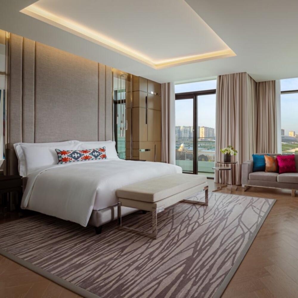 Close to the historical Sherq Bazaar and the strikingly modern Heydar Aliyev Cultural Centre, the sky-scraping Ritz-Carlton is bright and airy with a soothing neutral colour scheme with pops of bold colour. The furnishings are all clean lines and contemporary elegance, and the large picture windows in every room, suite and apartment offer incredible birds eye city views. Bathrooms are opulent: marble floors, walk-in showers and standalone bathtubs.
