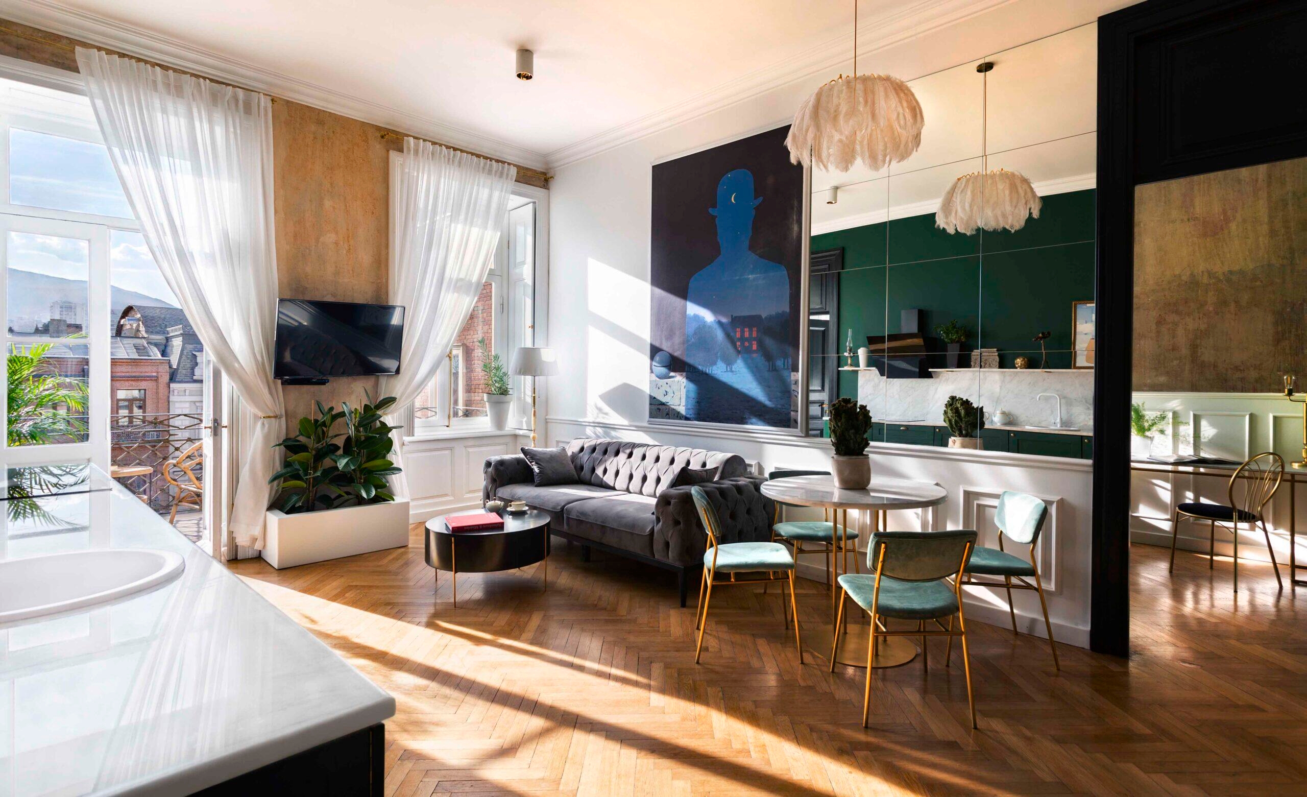 Rooms and suites have high ceilings and vintage lighting, and you can enjoy home comforts, like window seats, armchairs and rattan outdoor furniture on balconies. In the stylish bathrooms you can enjoy walk-in showers with water-efficient rainfall shower heads. The ground floor is home to the Unfound Door gastro-bar where Georgian-European cuisine is served using locally sourced produce, and vegetarian and vegan options are available. At the end of a long day, settle into a tall chair at the low-lit bar and enjoy a hand-mixed cocktail or glass of wine from the curated list.
