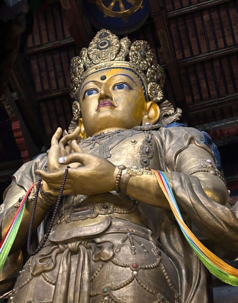 Visit the magnificent statue of Migjid Janraisig, ‘the lord who looks in every direction’, gilded in pure gold and clothed in silk and precious stones