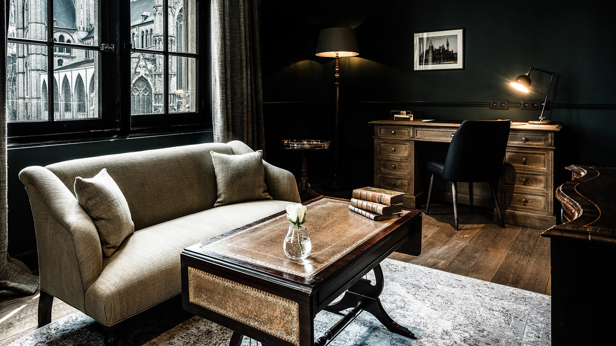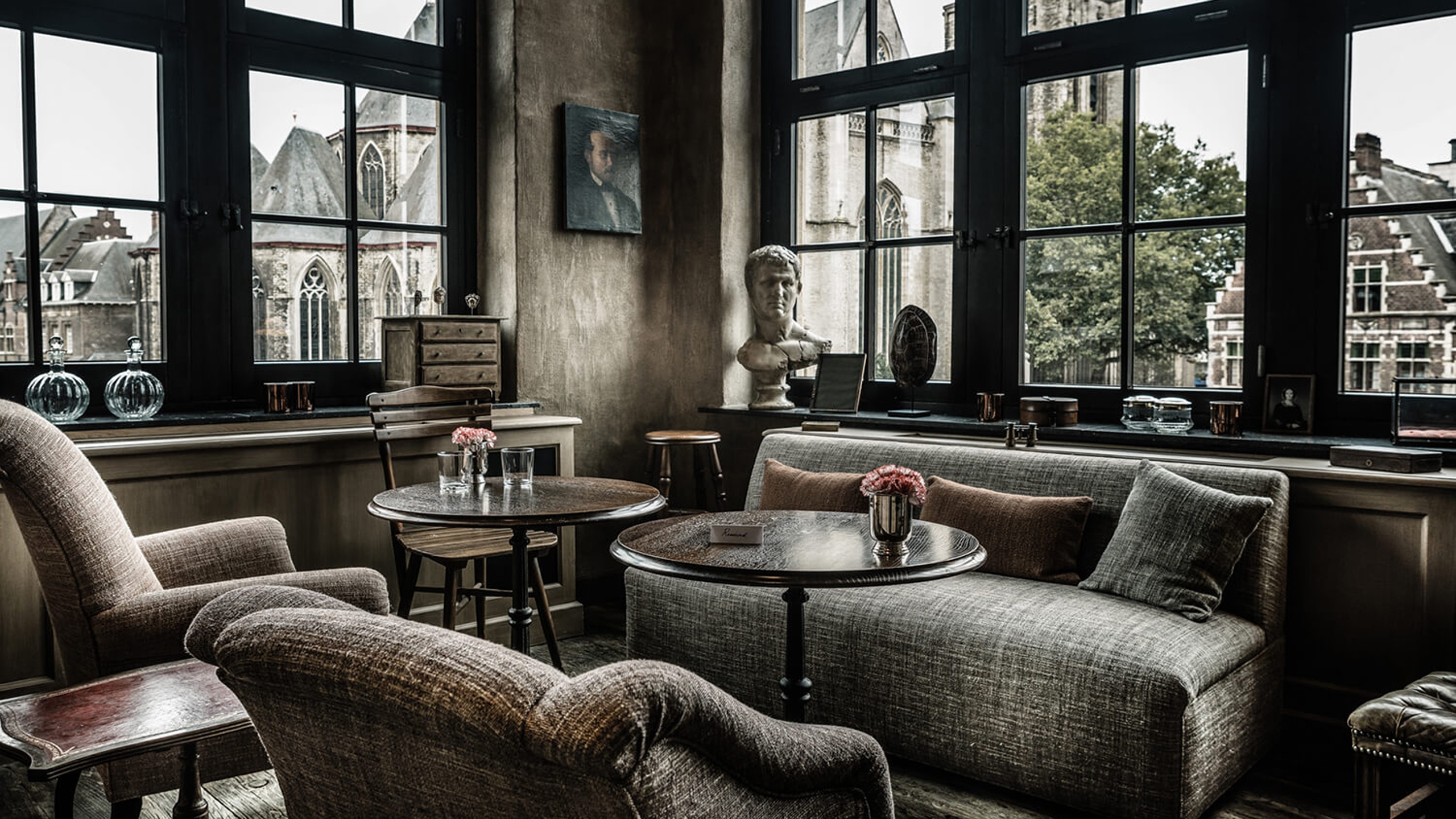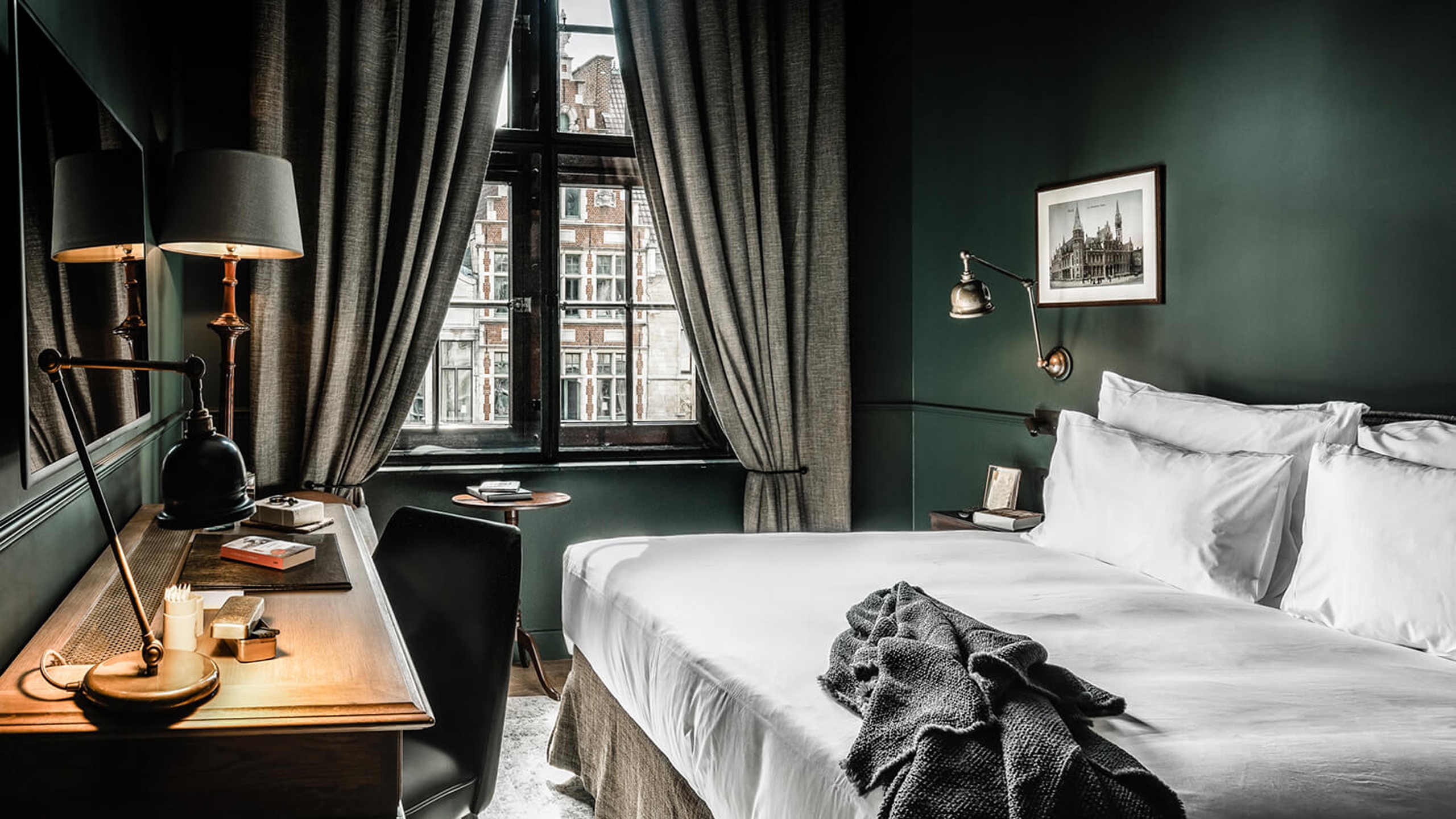 Housed on the upper floors of Ghent’s old post office building, this intimate hotel boasts 37 luxurious rooms. The rooms have been designed to highlight the building’s dramatic 19th-century architecture, with dark green walls, antique furniture, high ceilings and restored wood elements. The elegant and inviting rooms have been named to fit the theme of the old post office, and offer arresting views of the city.