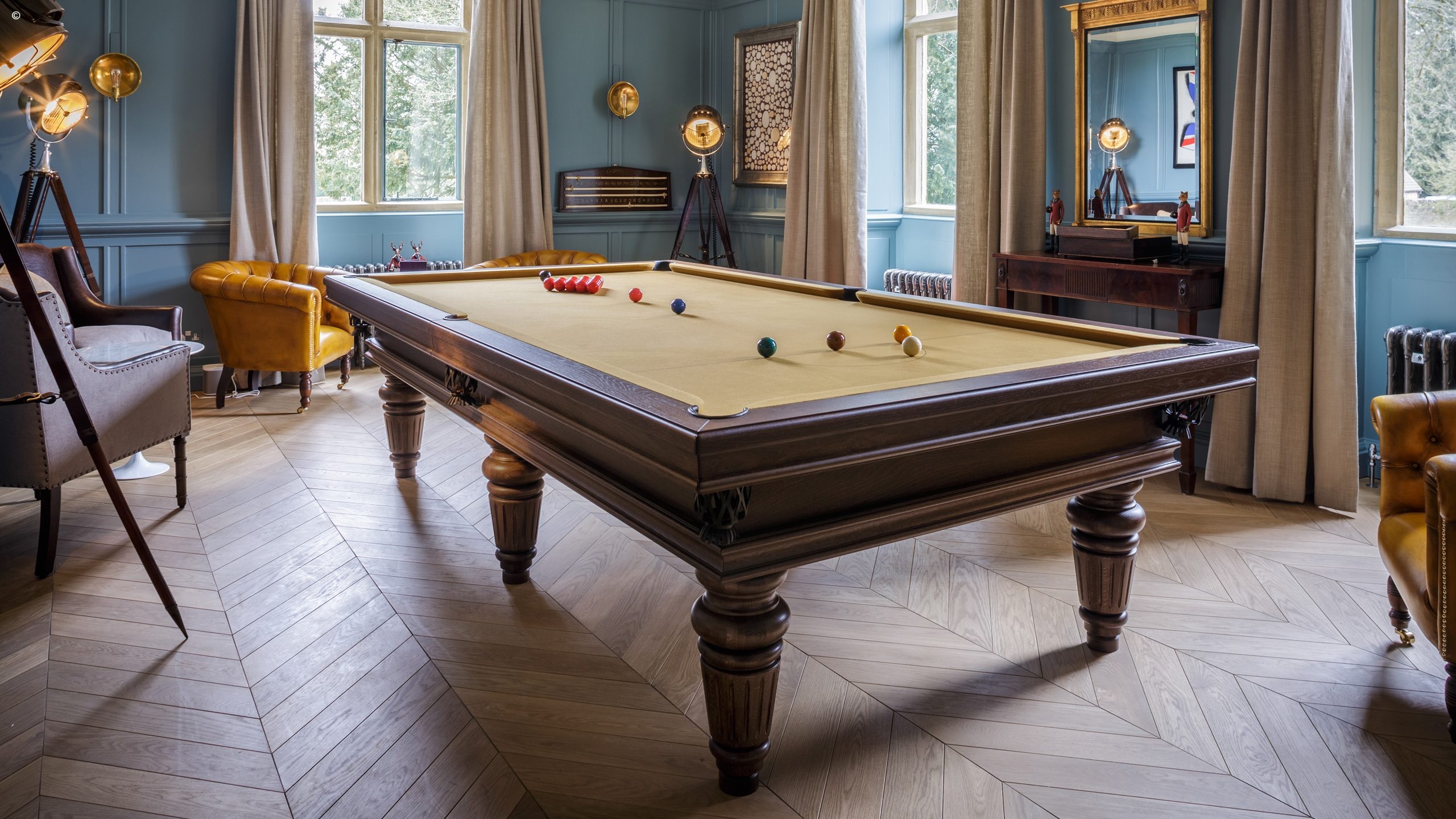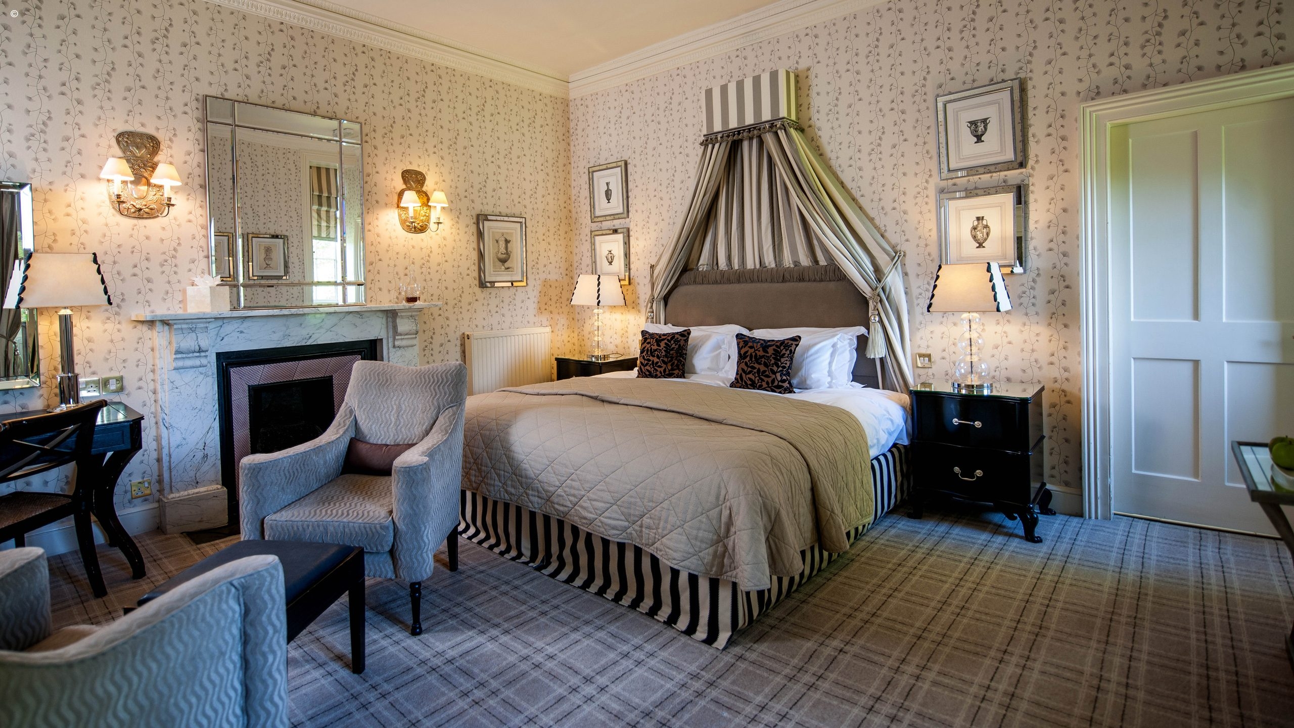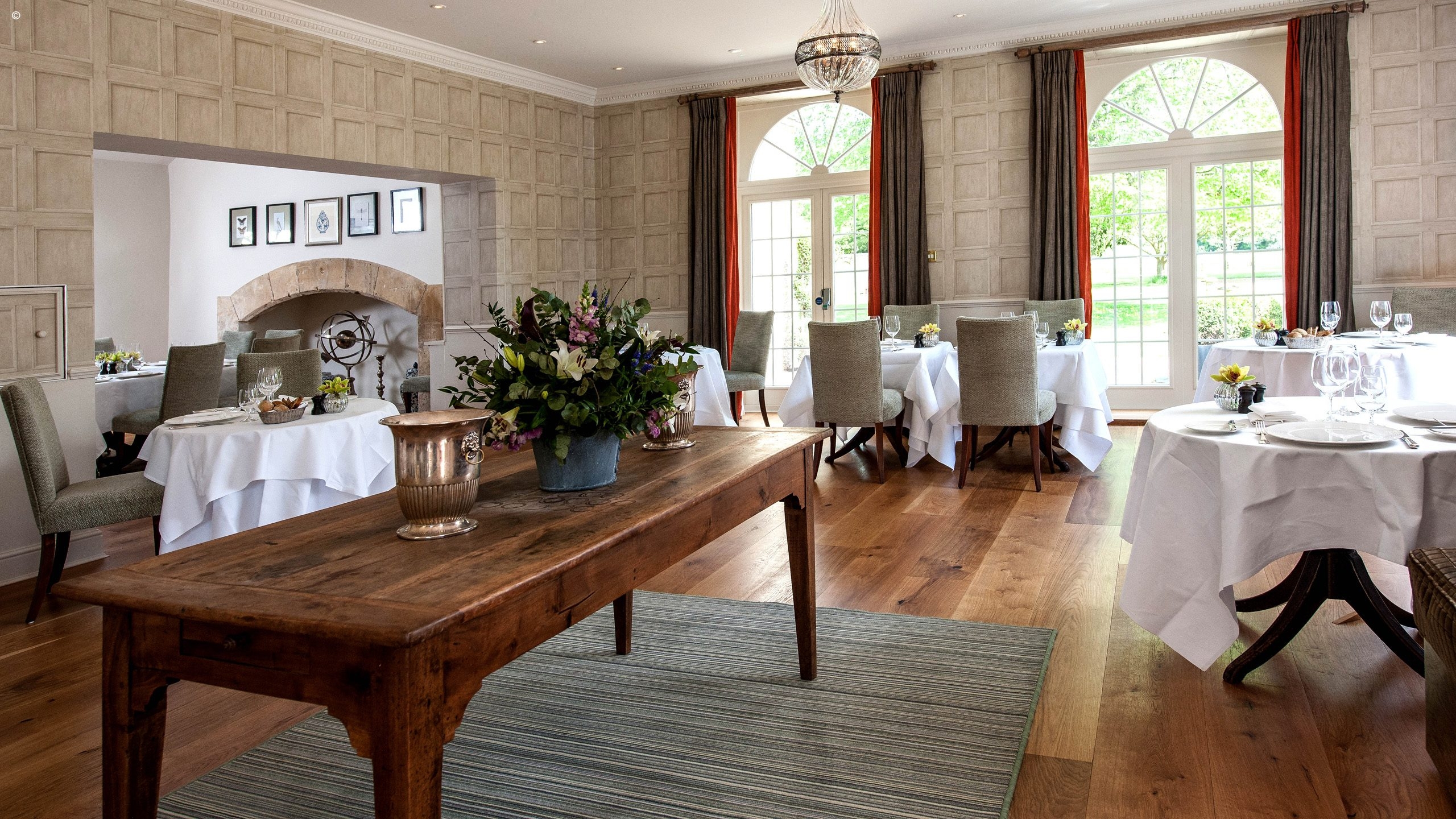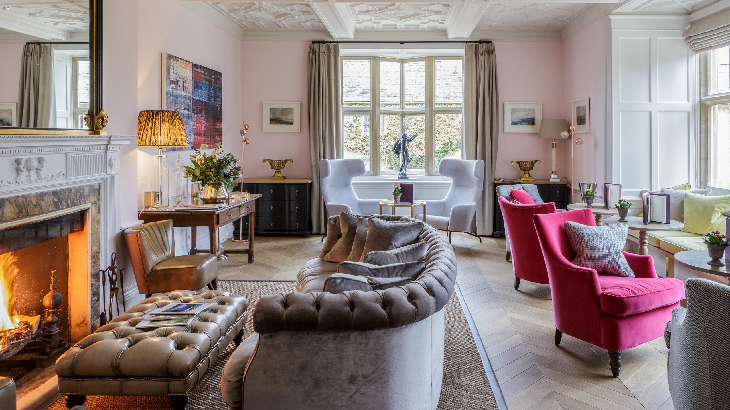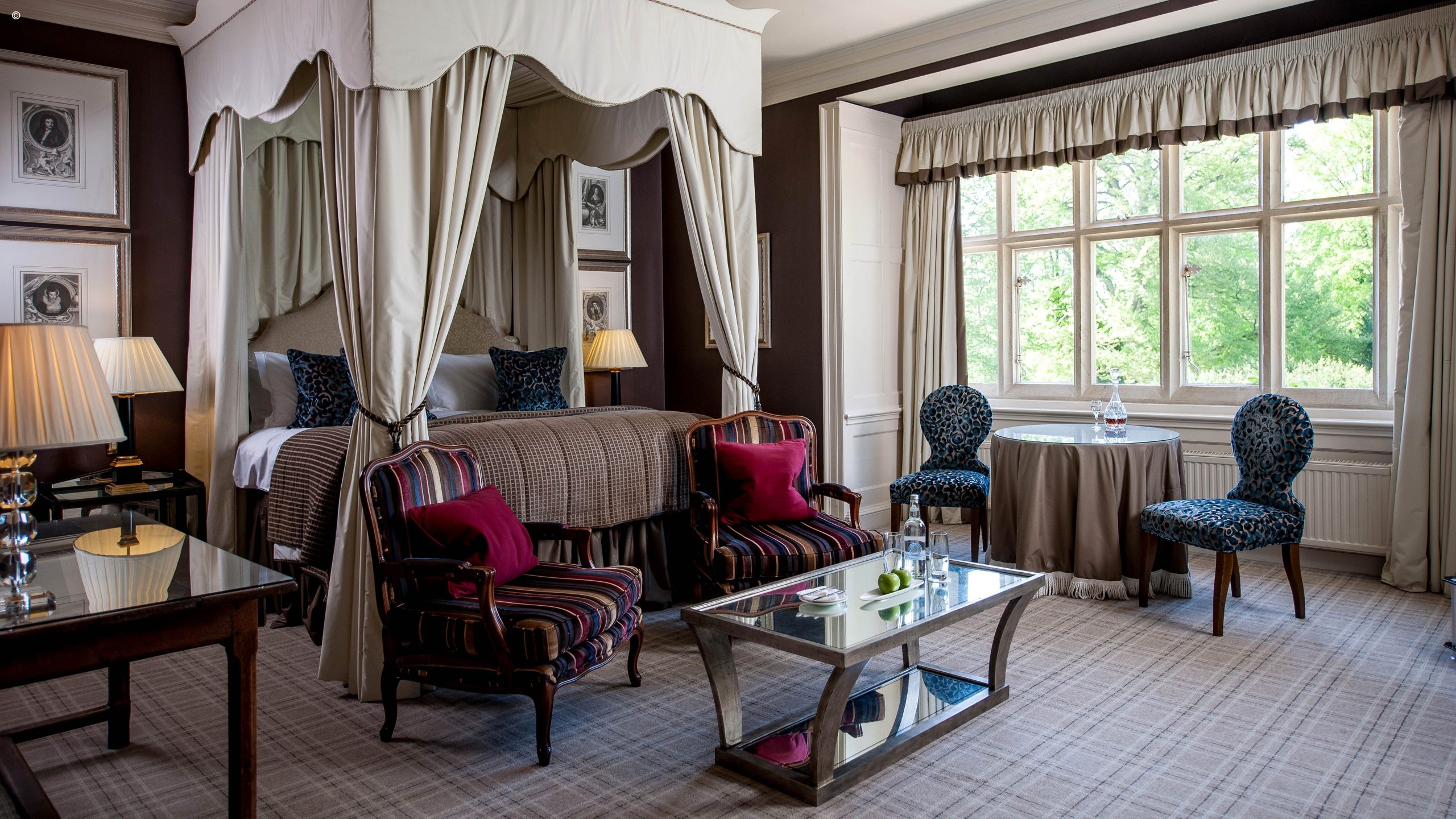 The hotel sits in five acres of landscaped gardens, filled with roses, fragrant lavender and tinkling fountains. There is a croquet lawn and a tennis court for those who want to partake in these most British of sports. When you want to relax, sit back with the papers in the lounge, take a seat in front of the crackling fire in the library or retire to the billiards room.