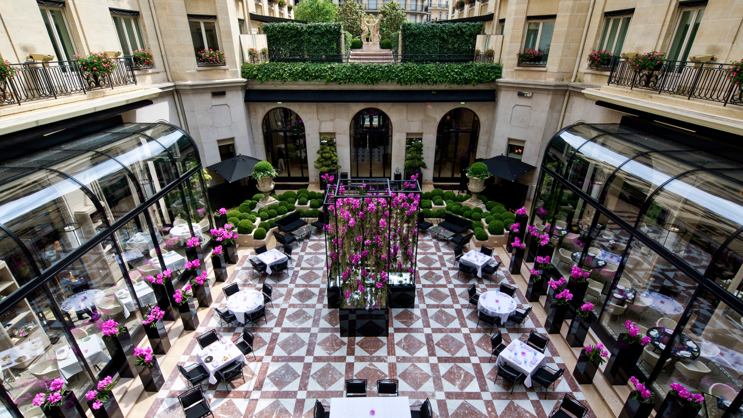 This is the first hotel in Europe to offer five Michelin stars across three restaurants. The menu at Le Cinq draws upon classic French culinary techniques using fresh regional ingredients. Savour light and modern Mediterranean-style dishes at Le George in Paris. An extension of the chic bar La Galerie, L’Orangerie serves contemporary French cuisine.