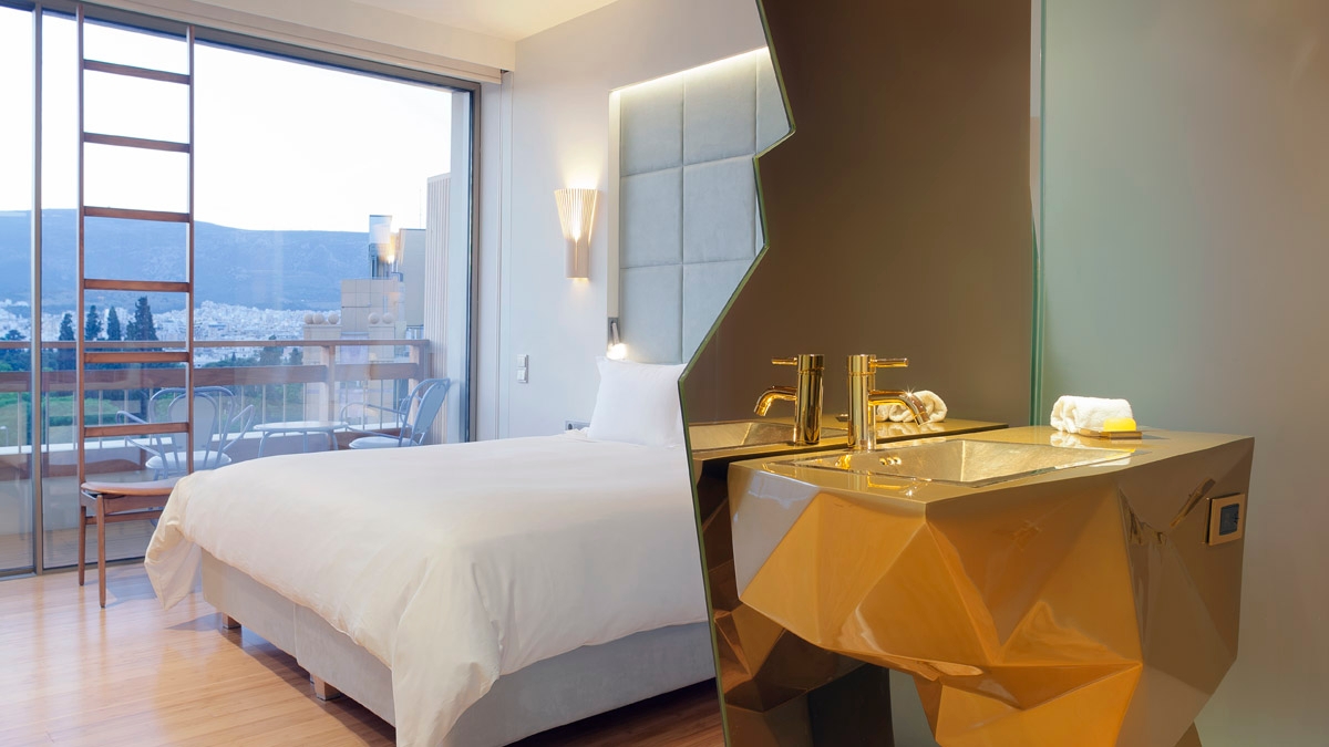 There are 79 rooms and suites, all of which feature their own art installation and surrealist custom furniture, as well as comprehensive soundproofing, fine beds and blackout blinds. The Penthouse Suite is particularly noteworthy for its fine views to the Acropolis.