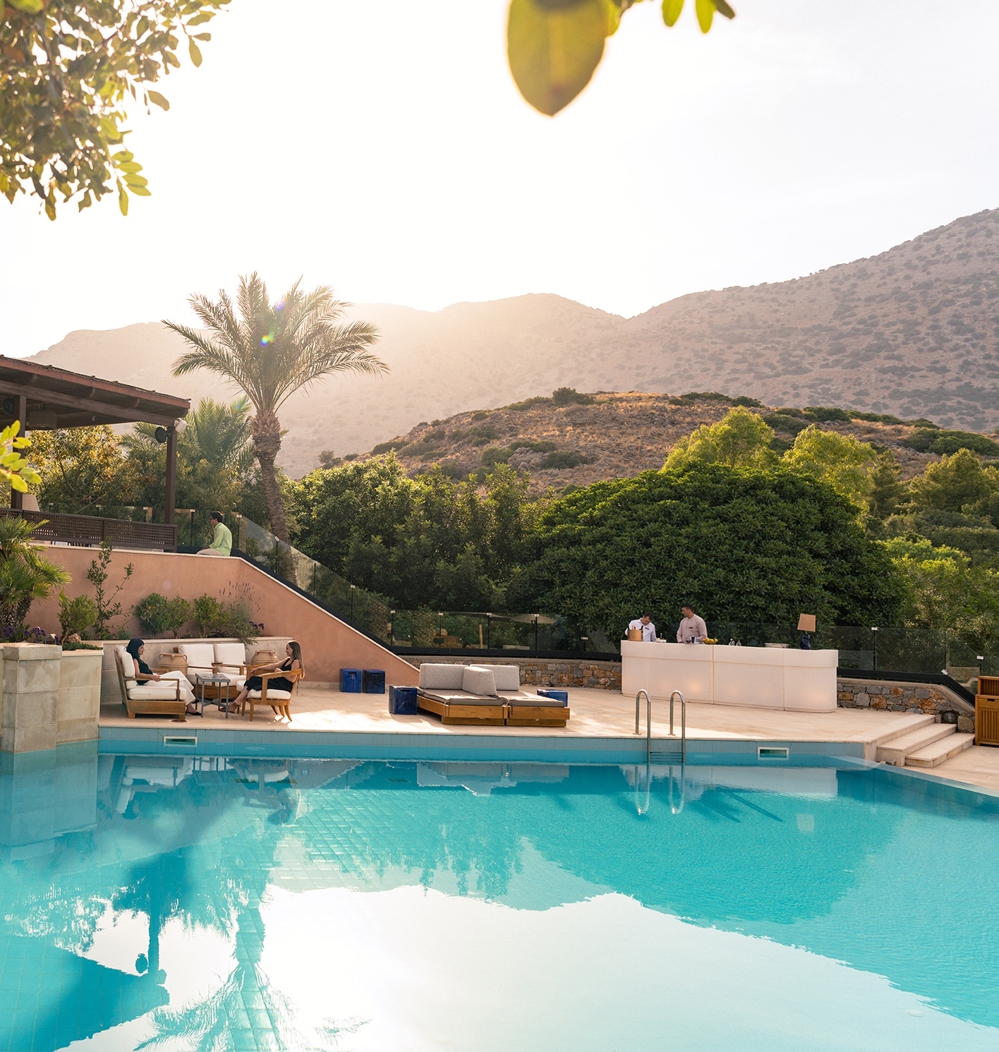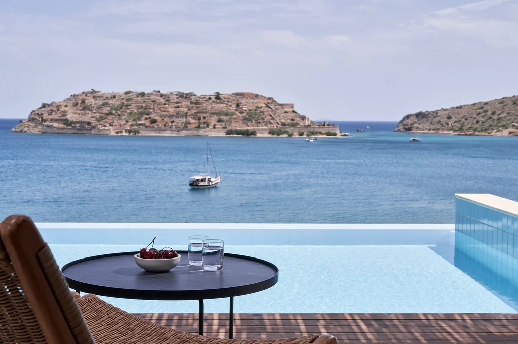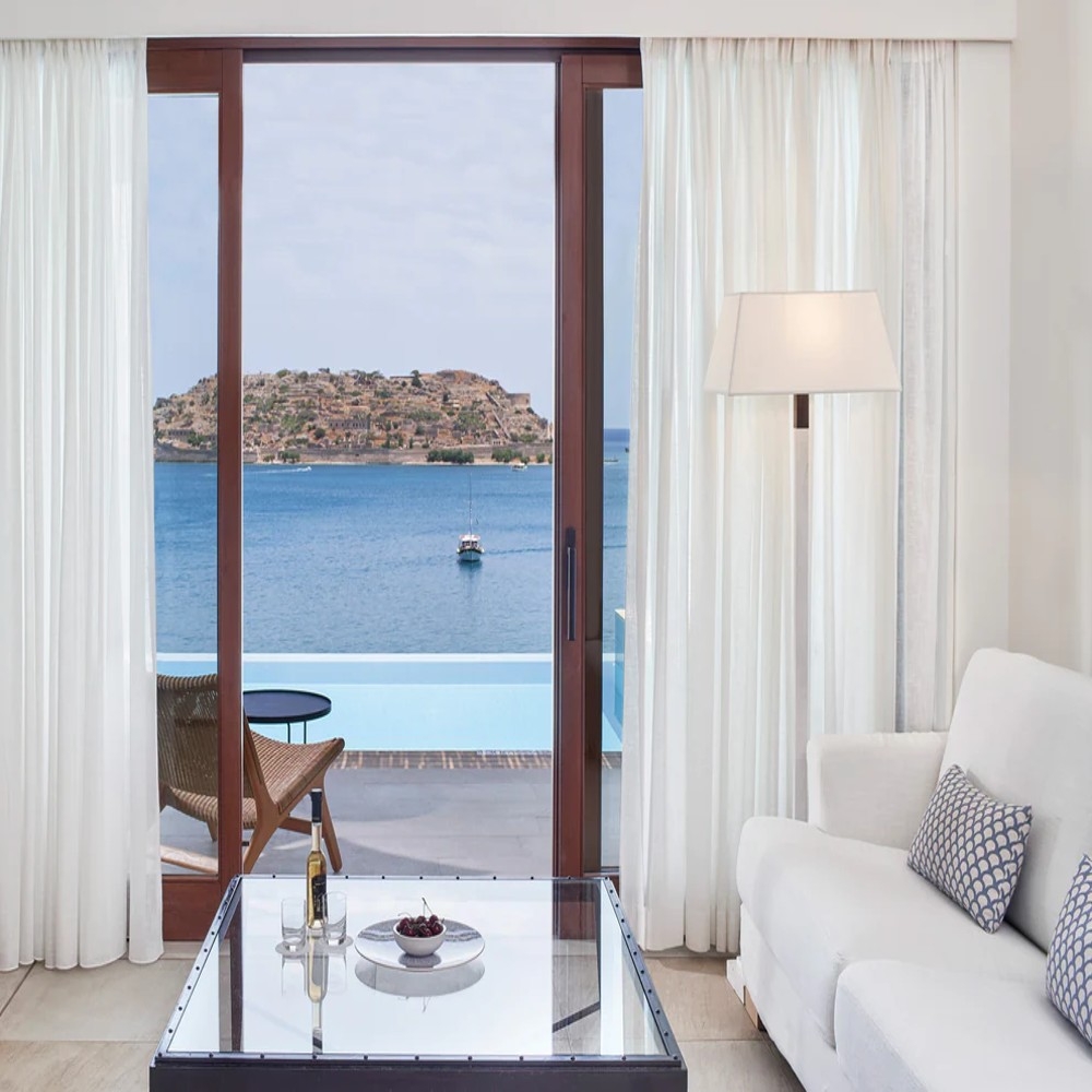Lounge in elegant island-inspired suites featuring natural materials, private pools and breathtaking sea views