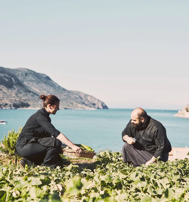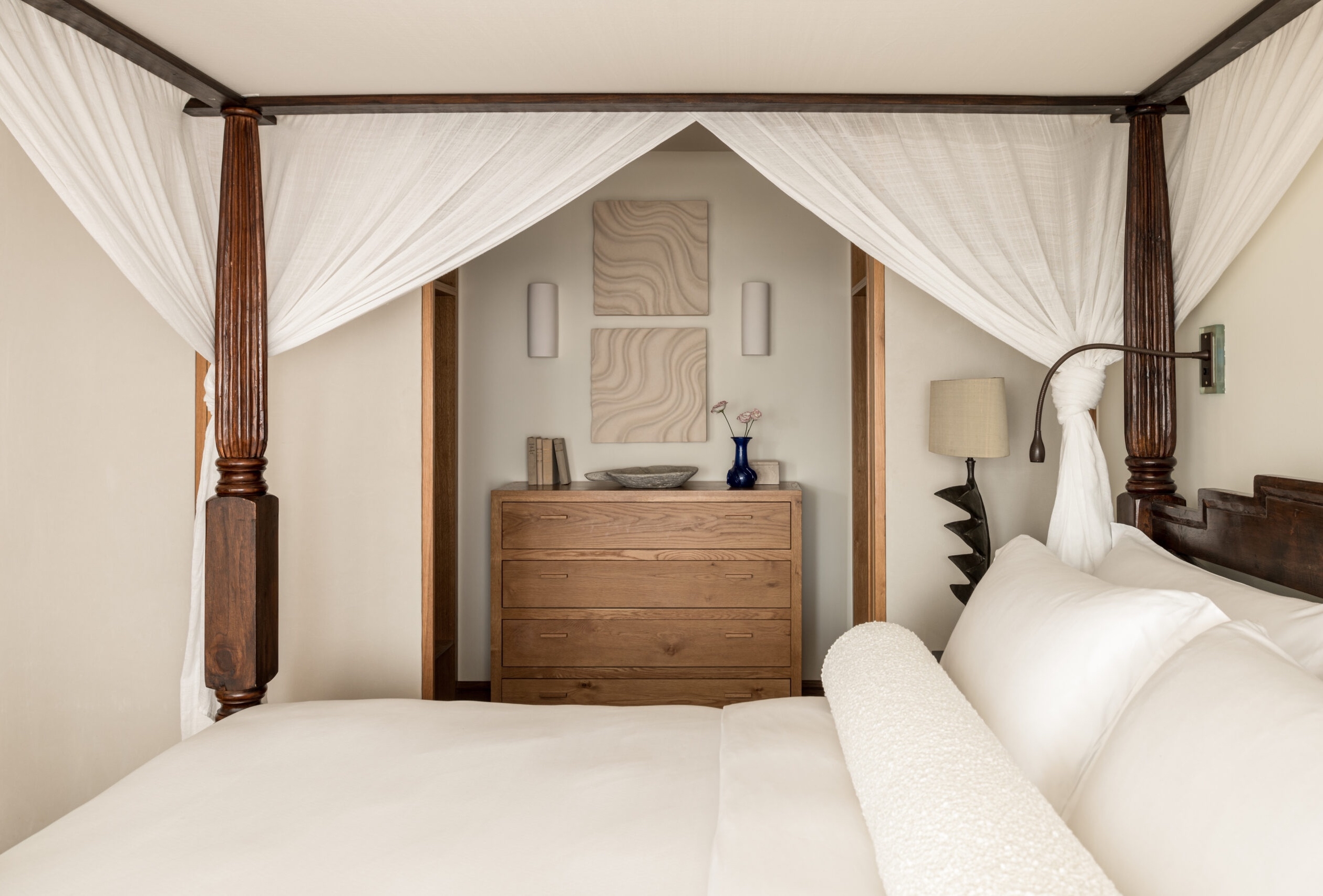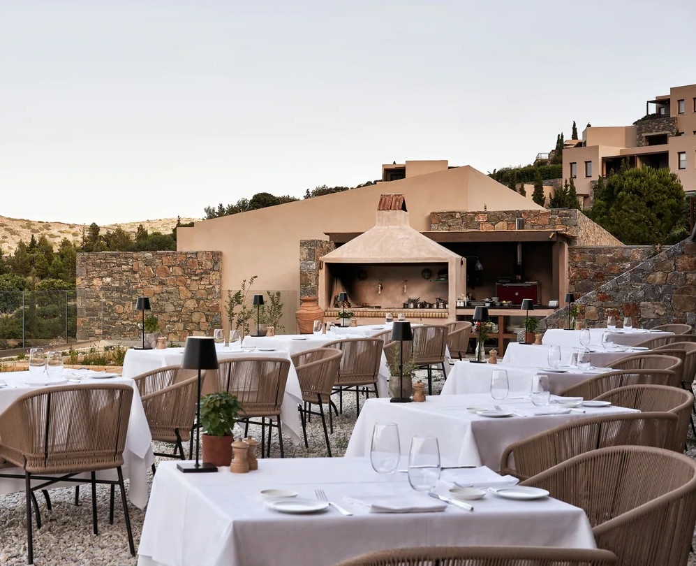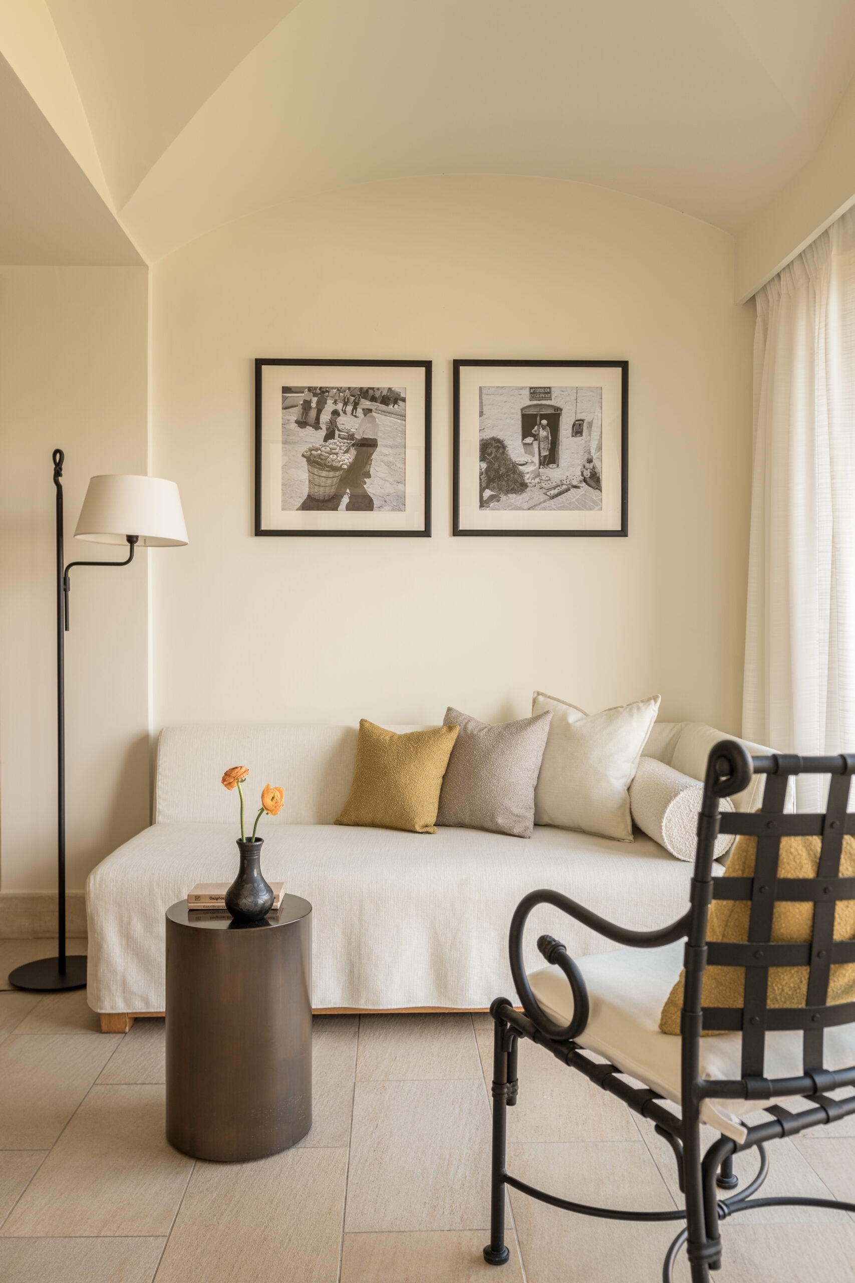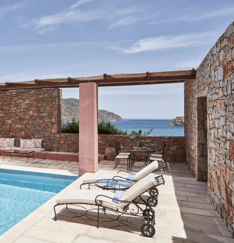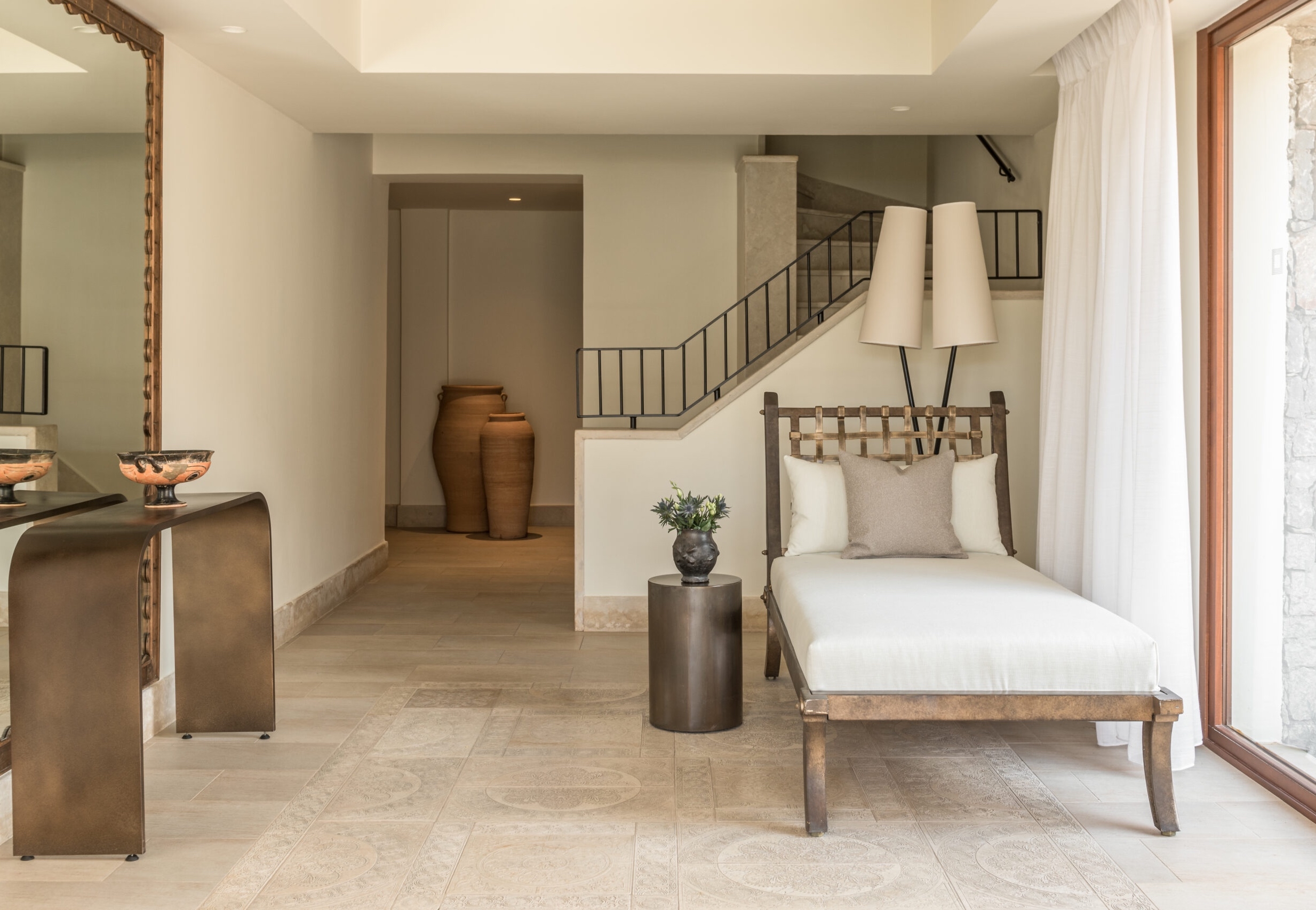 Each room and suite is curated with natural materials, handcrafted Greek artwork and a colour palette inspired by he surrounding sea, sand and olive groves. Some feature private pools, while others open onto terraces that frame uninterrupted views of the horizon.