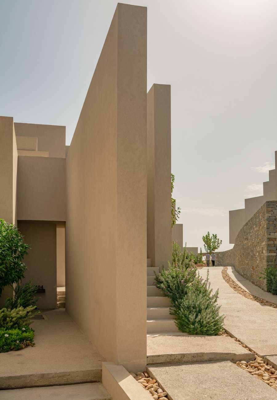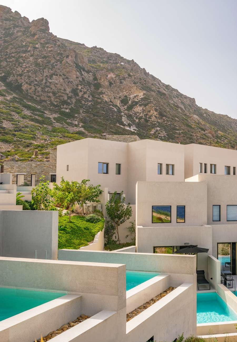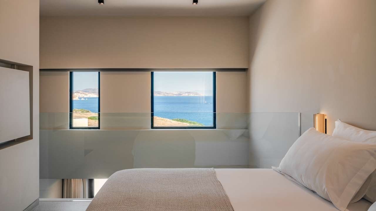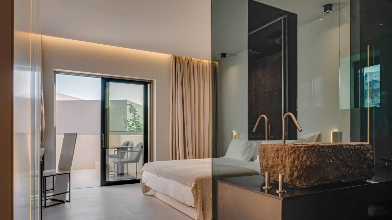 Each room and suite is curated with natural materials, handcrafted Greek artwork and a colour palette inspired by he surrounding sea, sand and olive groves. Some feature private pools, while others open onto terraces that frame uninterrupted views of the horizon.
