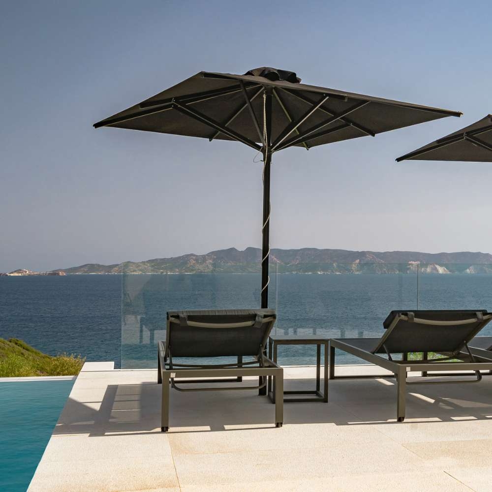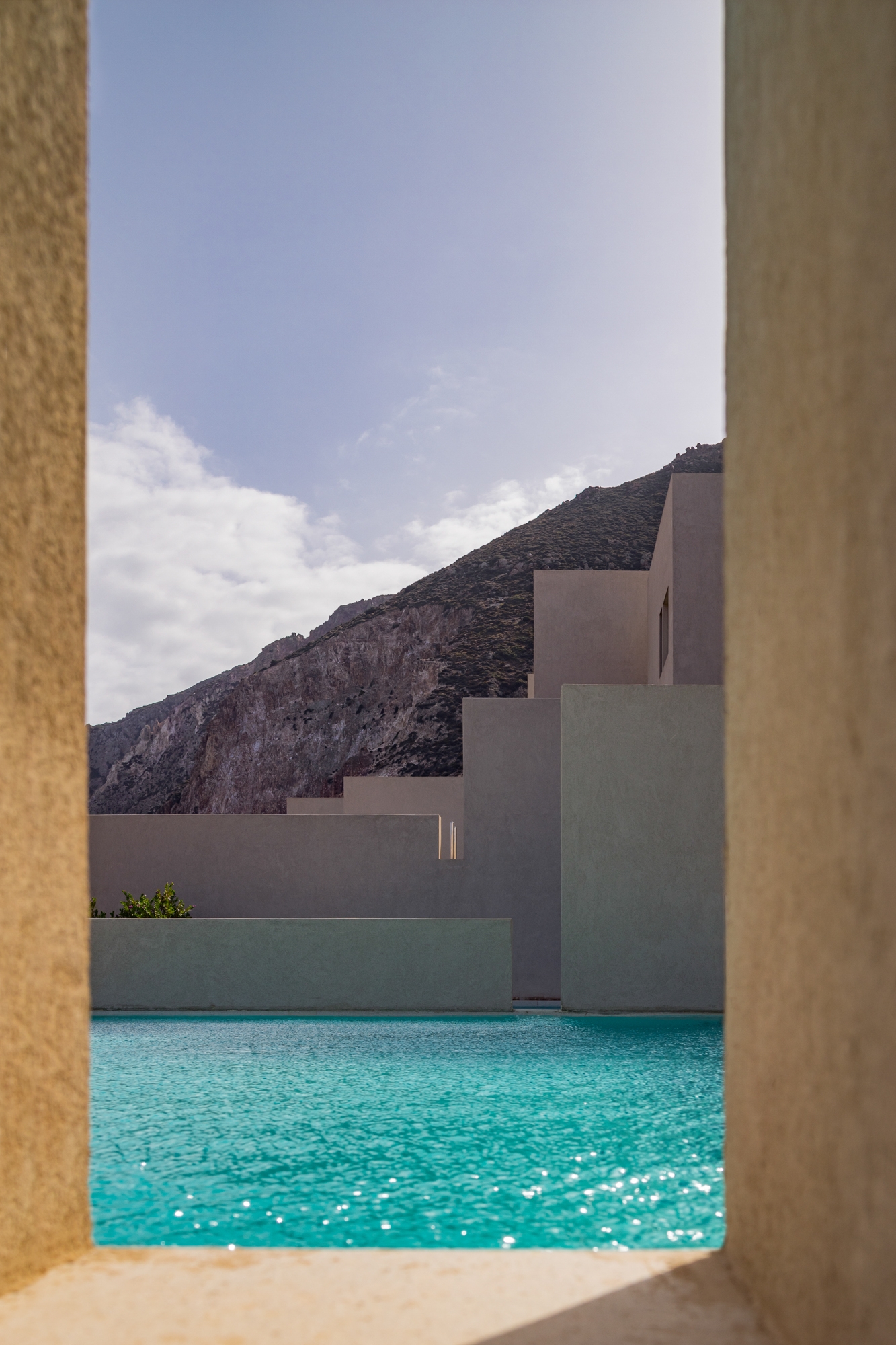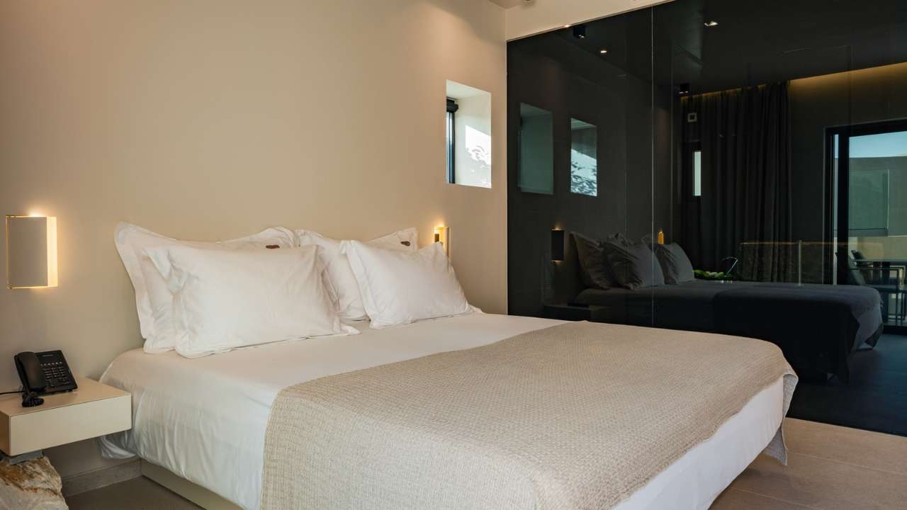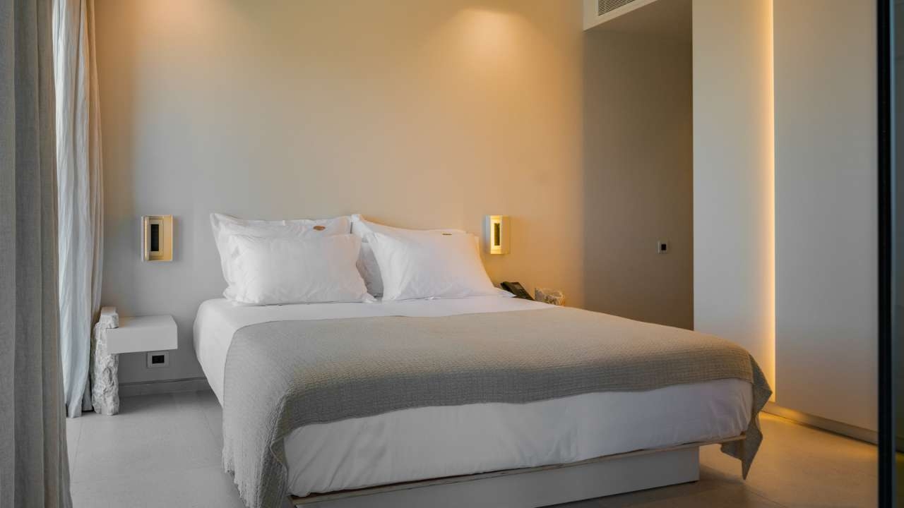Each room and suite is curated with natural materials, handcrafted Greek artwork and a colour palette inspired by he surrounding sea, sand and olive groves. Some feature private pools, while others open onto terraces that frame uninterrupted views of the horizon.