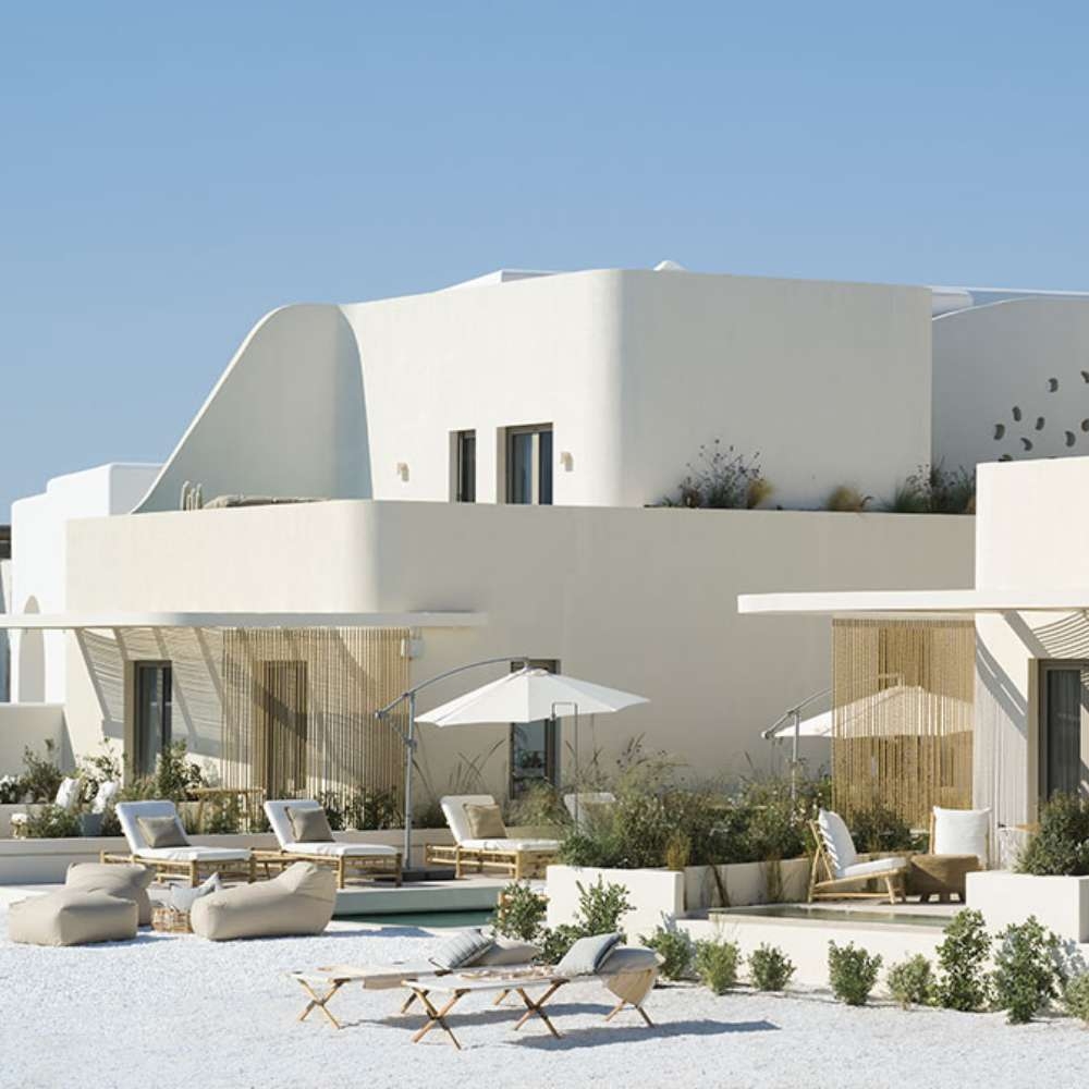 Blending traditional craftsmanship with contemporary design, White Pebble Suites blends into its beautiful beachfront surroundings in the coastal village of Pollonia. Created using local materials, like polished cement, cool marble, and warm wood, this boutique hotel is sympathetic to the timeless architecture of the Greek islands. There are 12 suites at the hotel over 3 different categories, all with private terraces to soak up the sea views and 8 suites have their own private plunge pools. Screened by fragrant borders of Mediterranean plants, the couple friendly suites emerge organically from the surrounding landscape with smooth curves and pale colour palette. Tactile glassware and ceramics, and earth-toned textiles create an ambience of easy-going warmth and effortless luxury.