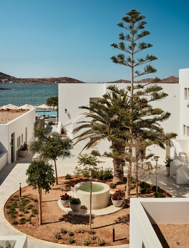 Myconian O is an oasis of unrivalled elegance that invites you to immerse yourself in its tranquil ambience and revel in the essence of Greek island living. Located within the embrace of majestic cliffs and shielded from strong winds and waves, Myconian O is an outstanding destination in Mykonos – one of the best Mediterranean islands.
