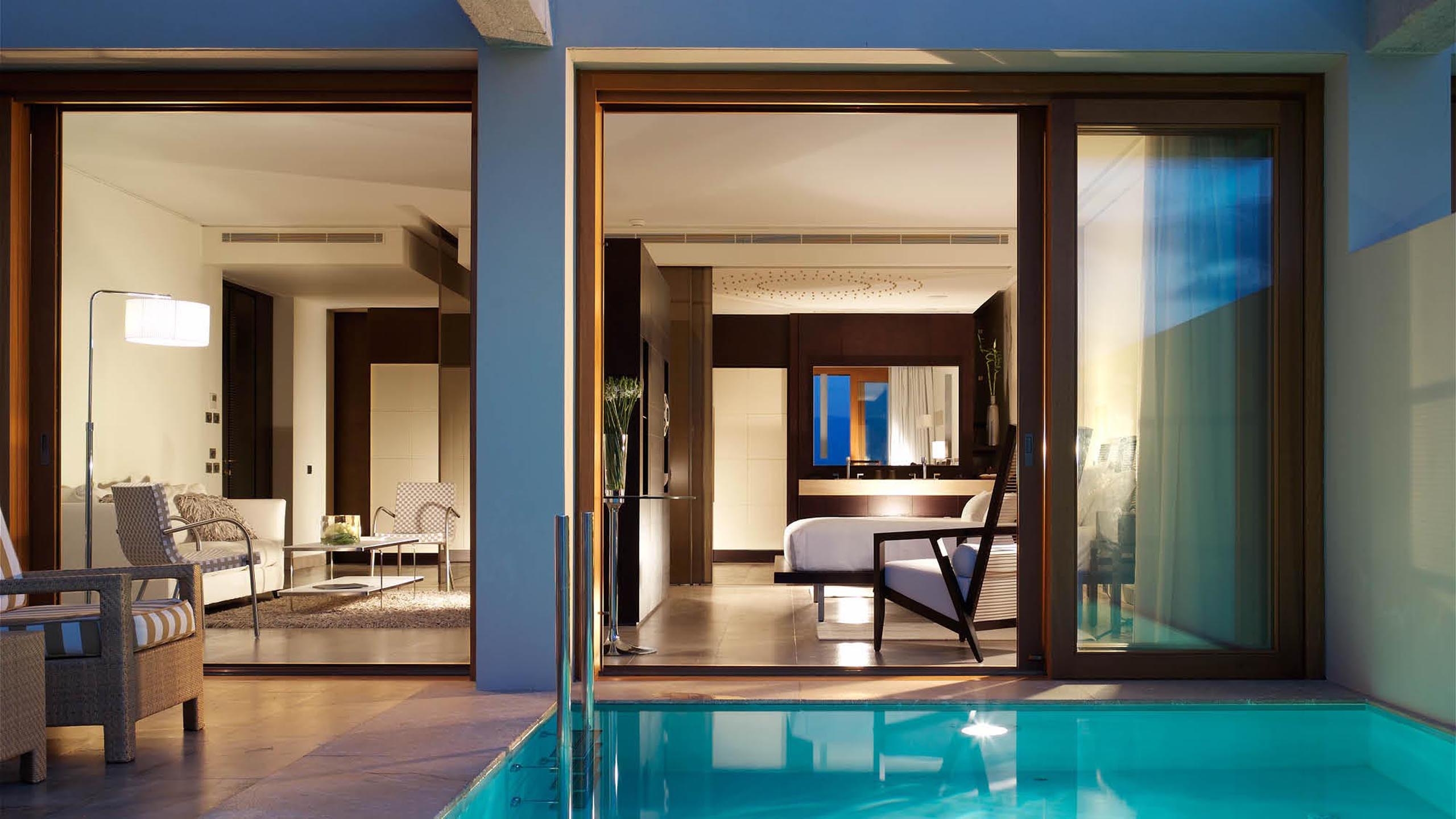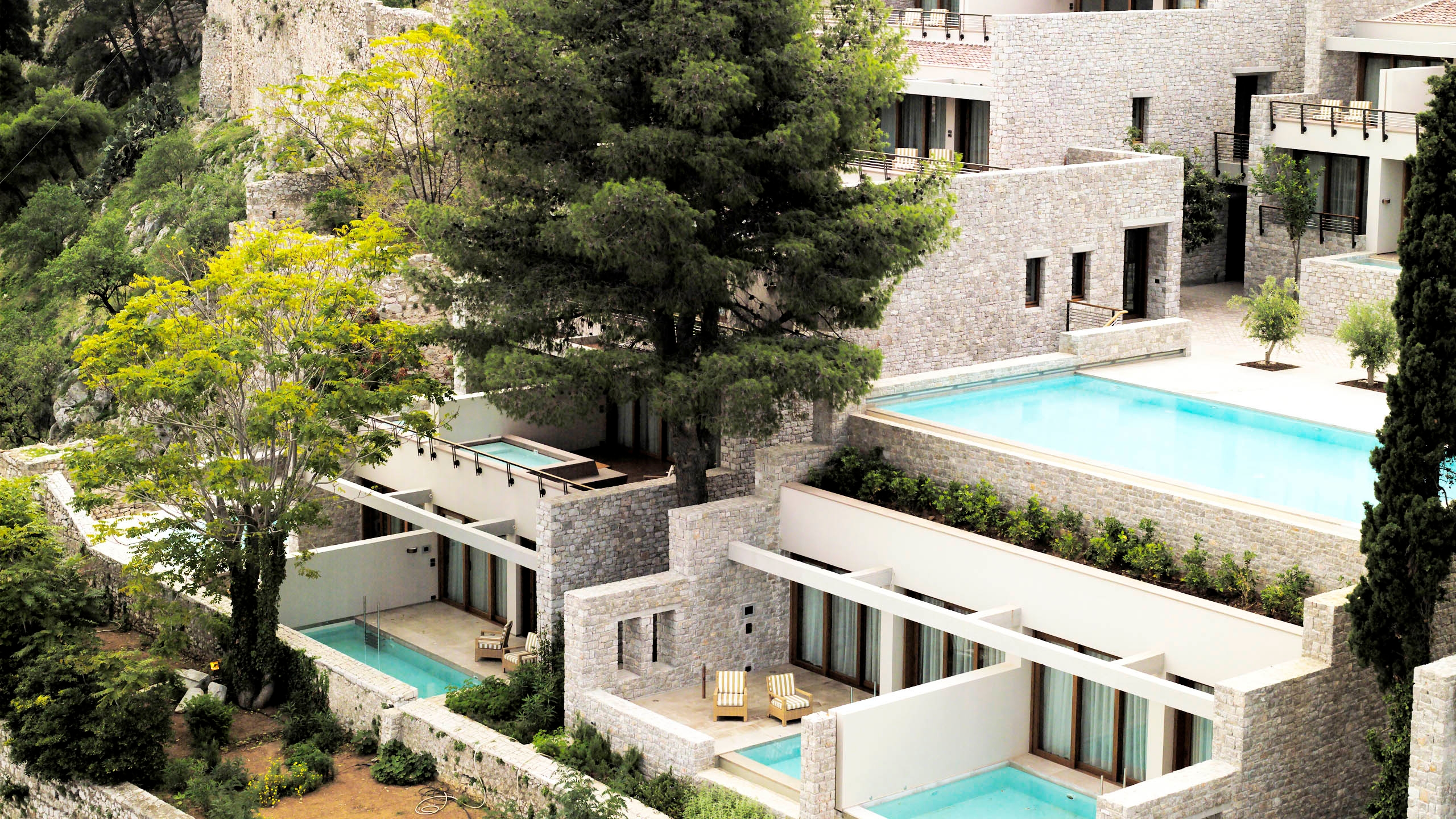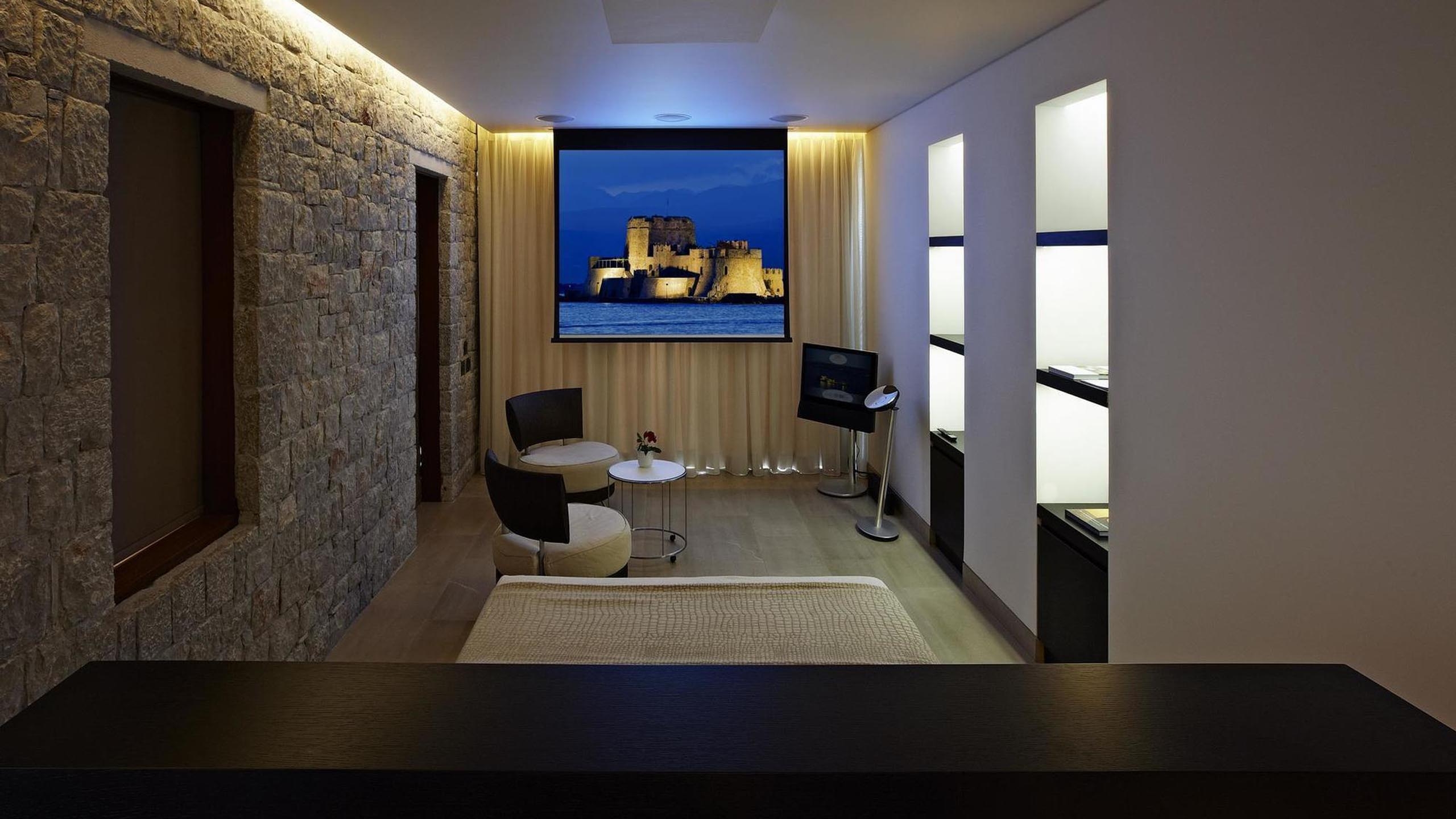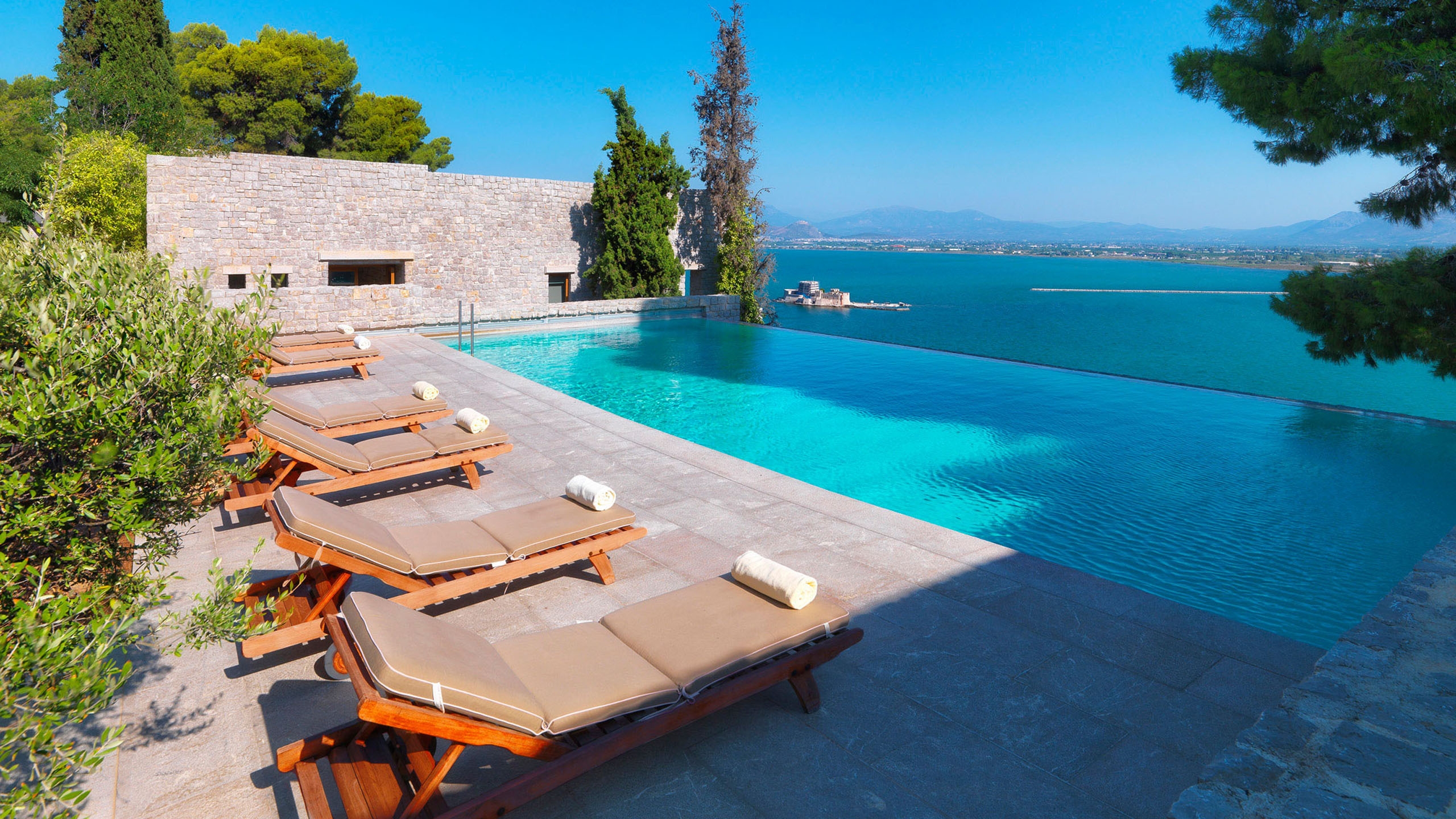 The hotel has 51 rooms and 33 individually designed villas, many with private heated pools or outdoor Jacuzzis on terraces, looking out to the Bay of Argolis. While exteriors blend into fortified city, the style inside is decidedly modern and airy. If you don’t happen to have your own pool, the Nafplia’s dramatic infinity pool more than makes up it.