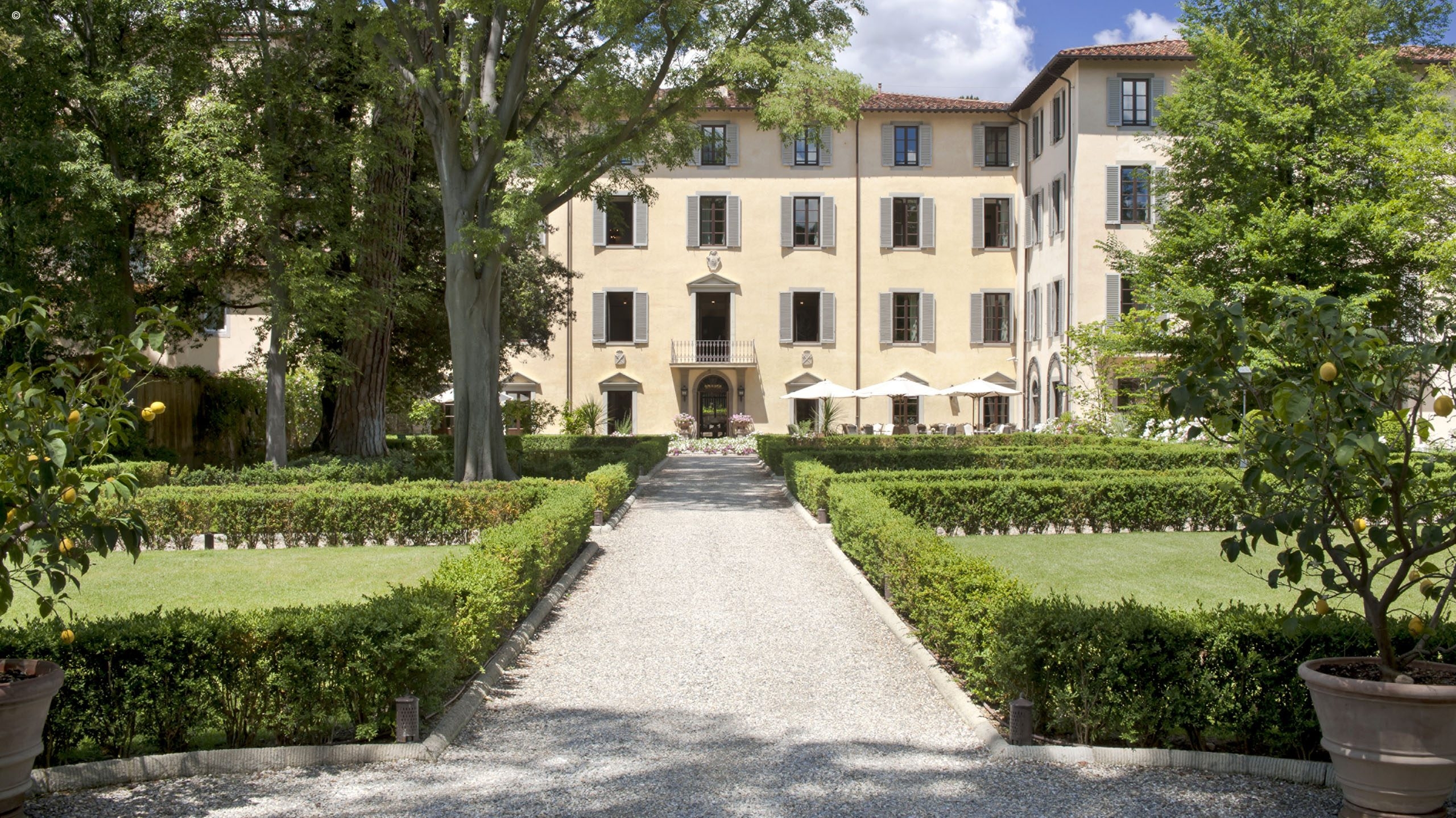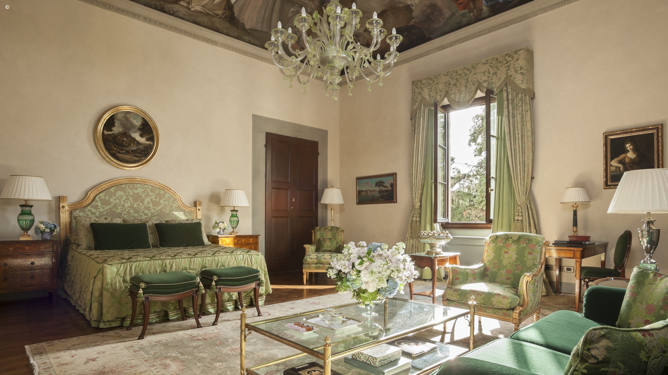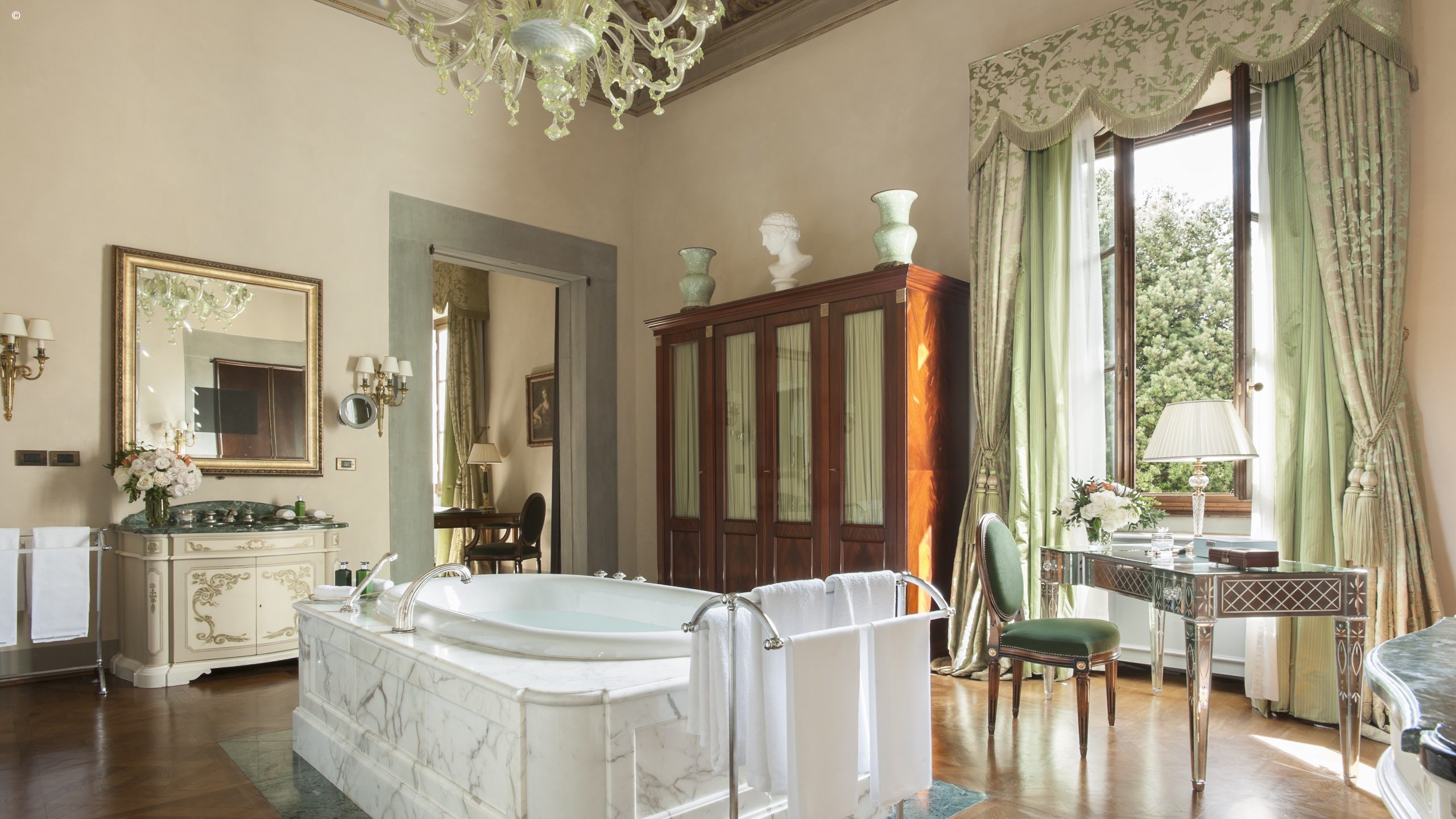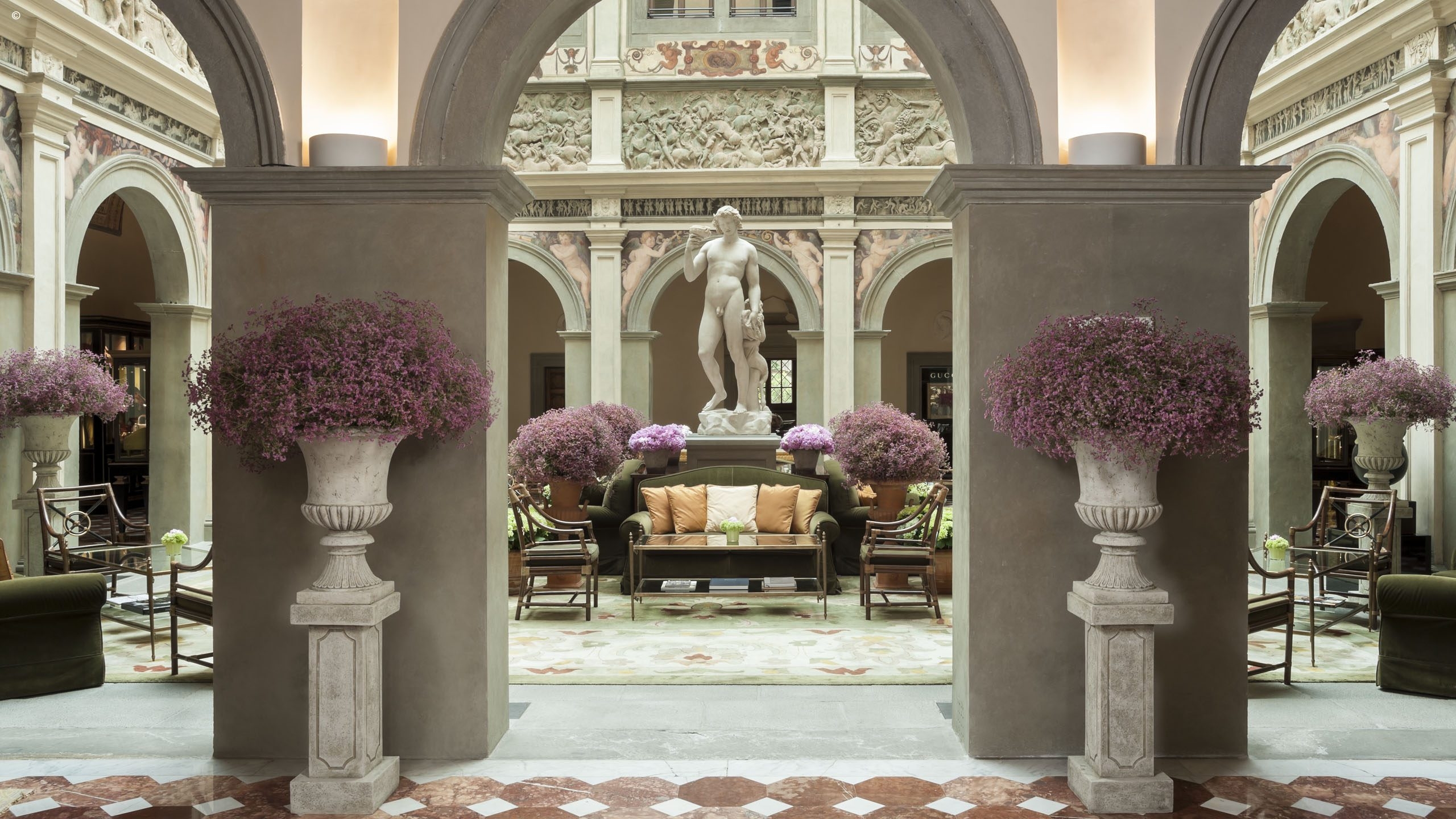 There are 116 rooms, including 44 suites, each individually finished with frescoes, friezes and hand-painted sculptures, all a symphony of silk, velvet and marble. Many enjoy Arcadian views out to the surrounding gardens while others look into the courtyard or over typically Tuscan streetscapes.