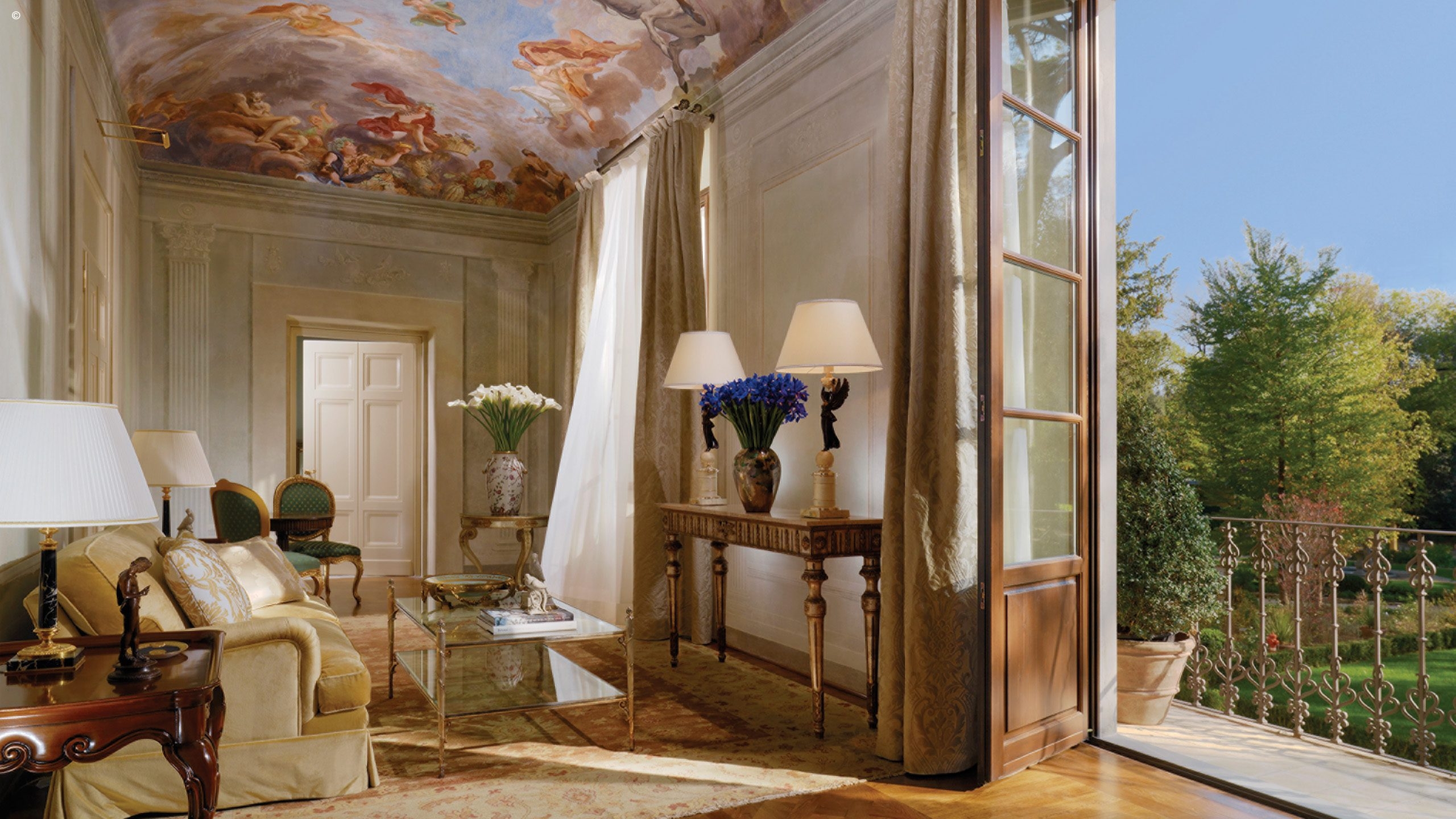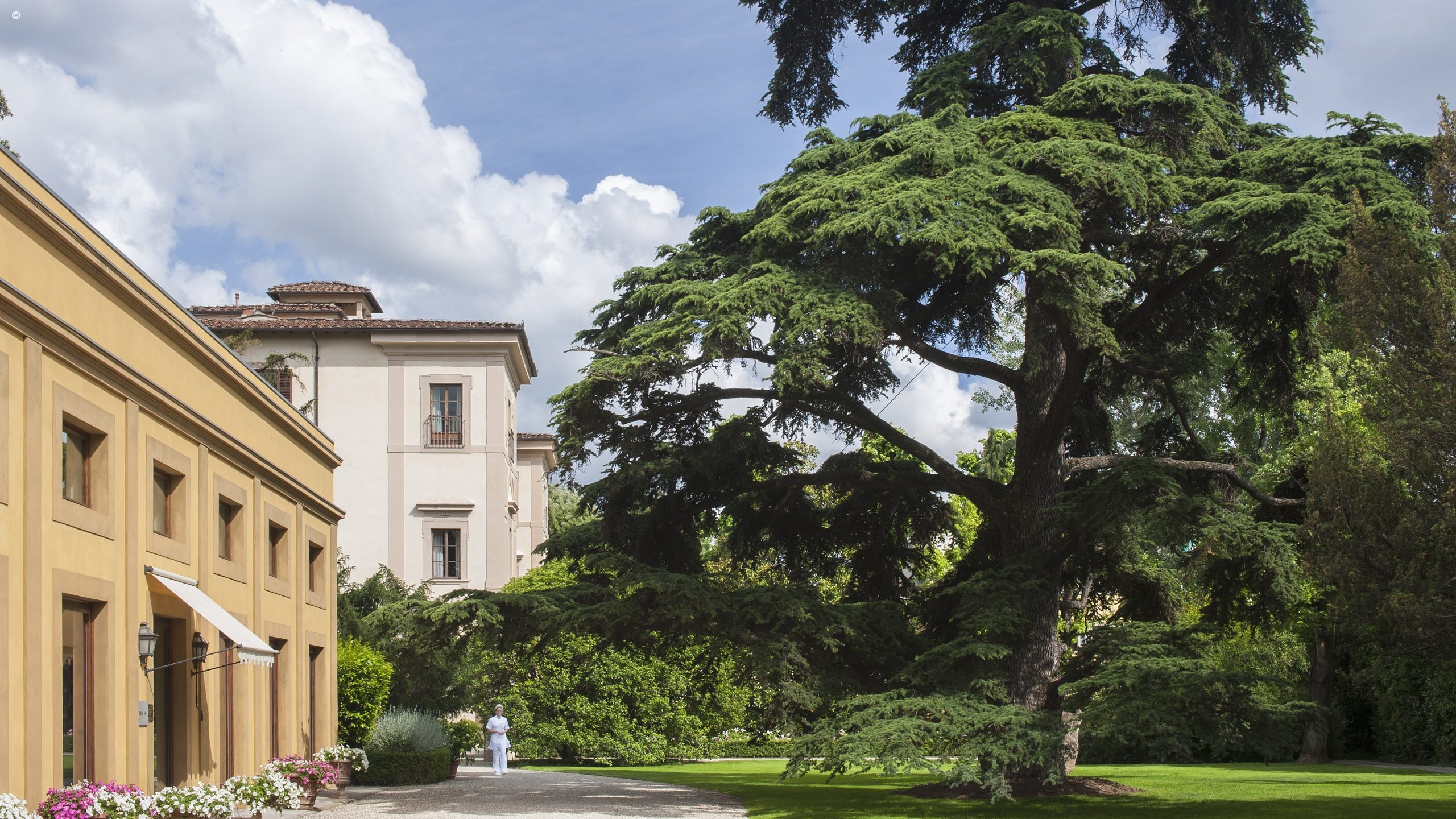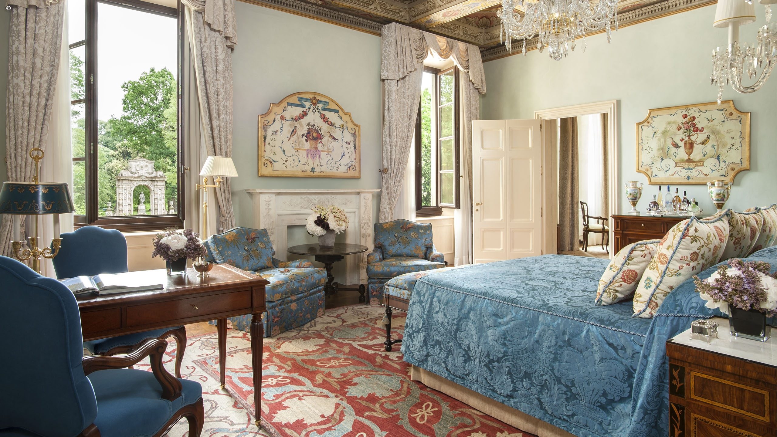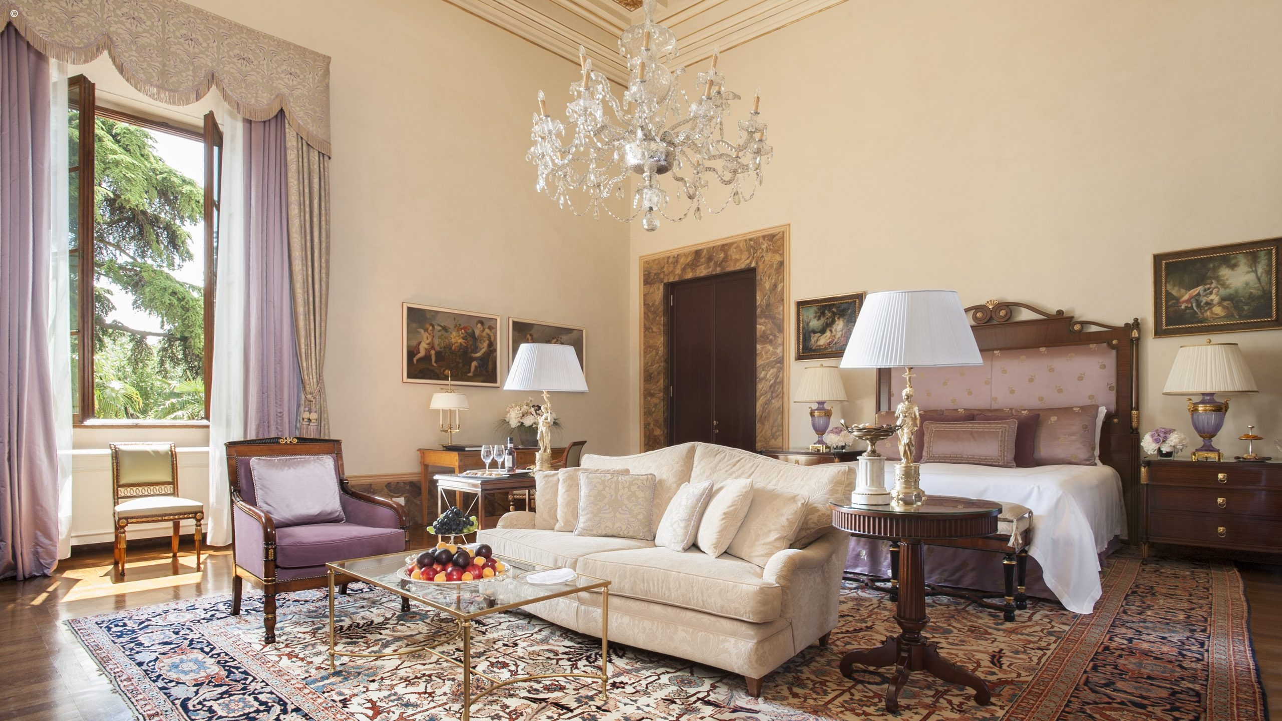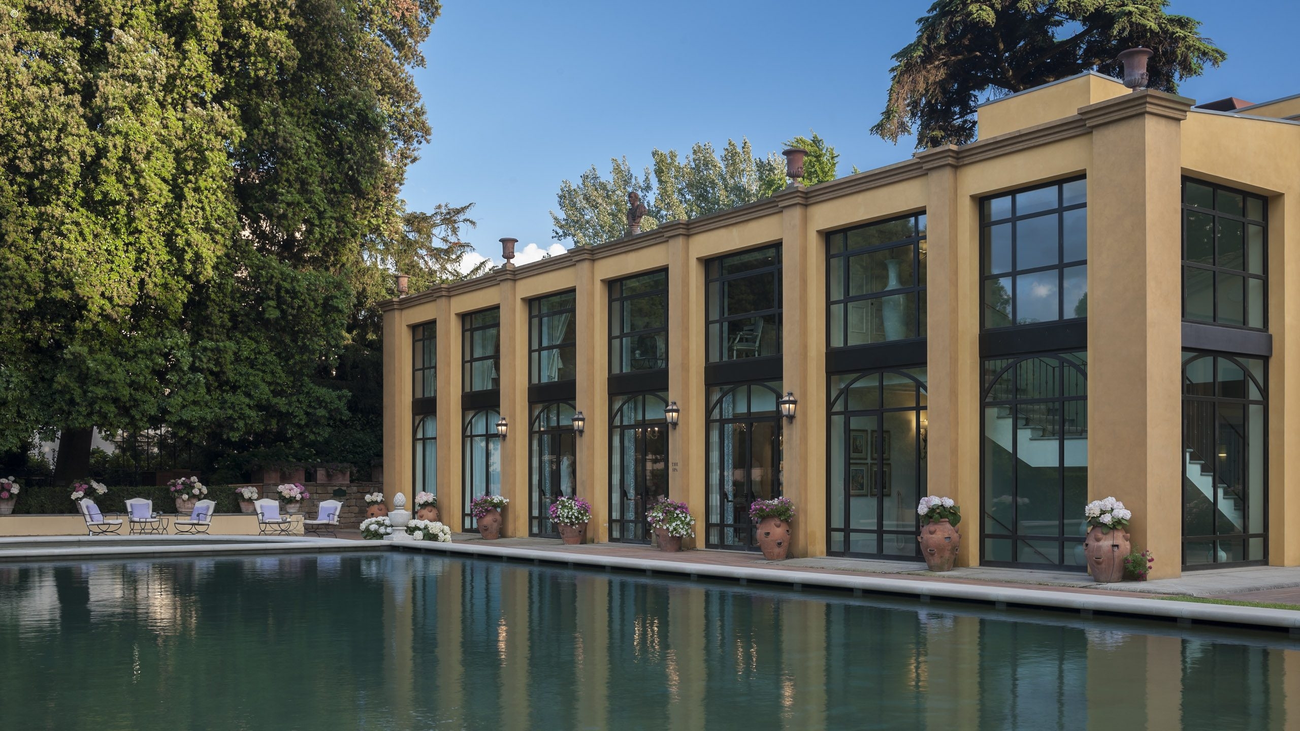 There are 116 rooms, including 44 suites, each individually finished with frescoes, friezes and hand-painted sculptures, all a symphony of silk, velvet and marble. Many enjoy Arcadian views out to the surrounding gardens while others look into the courtyard or over typically Tuscan streetscapes.