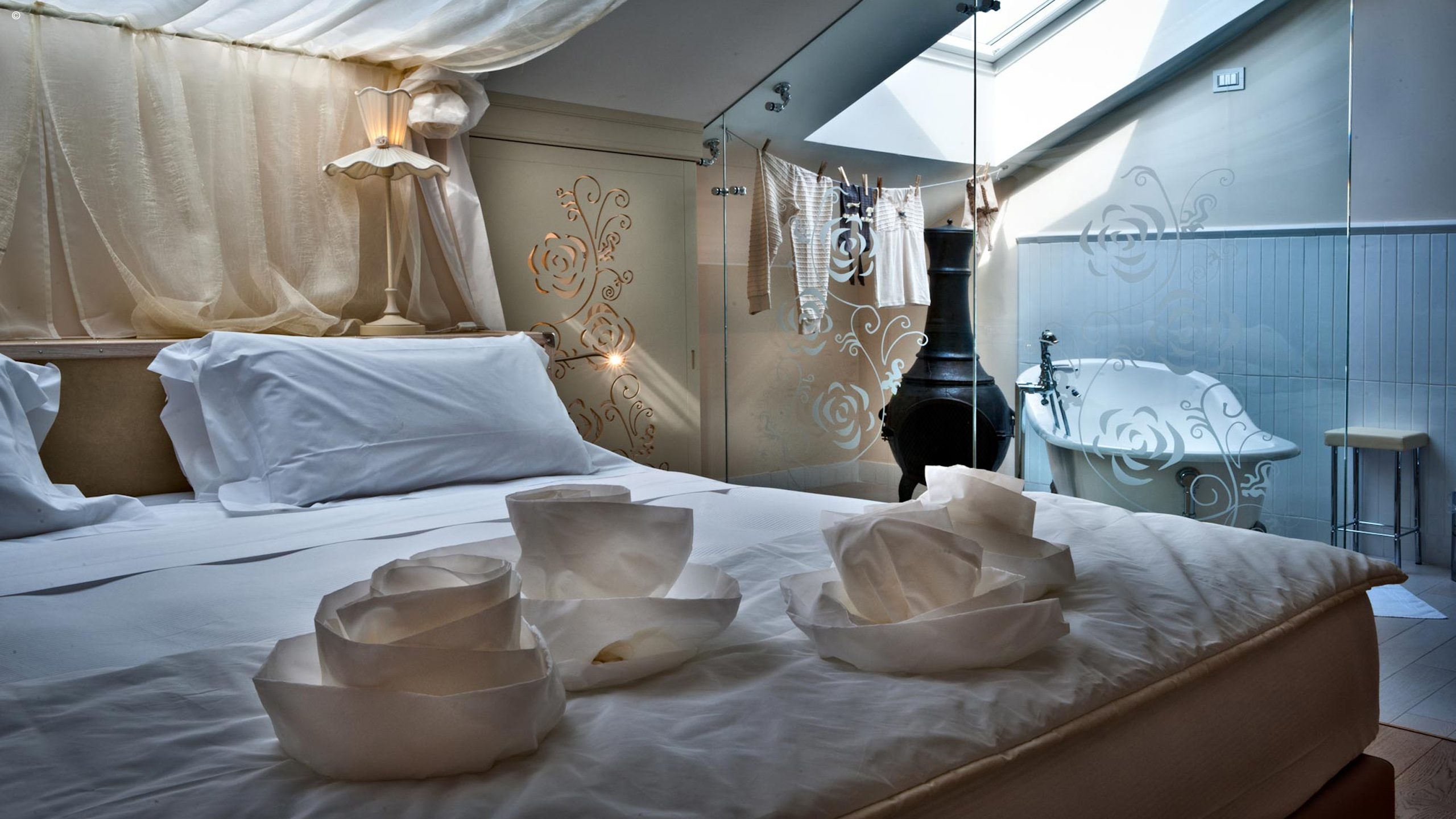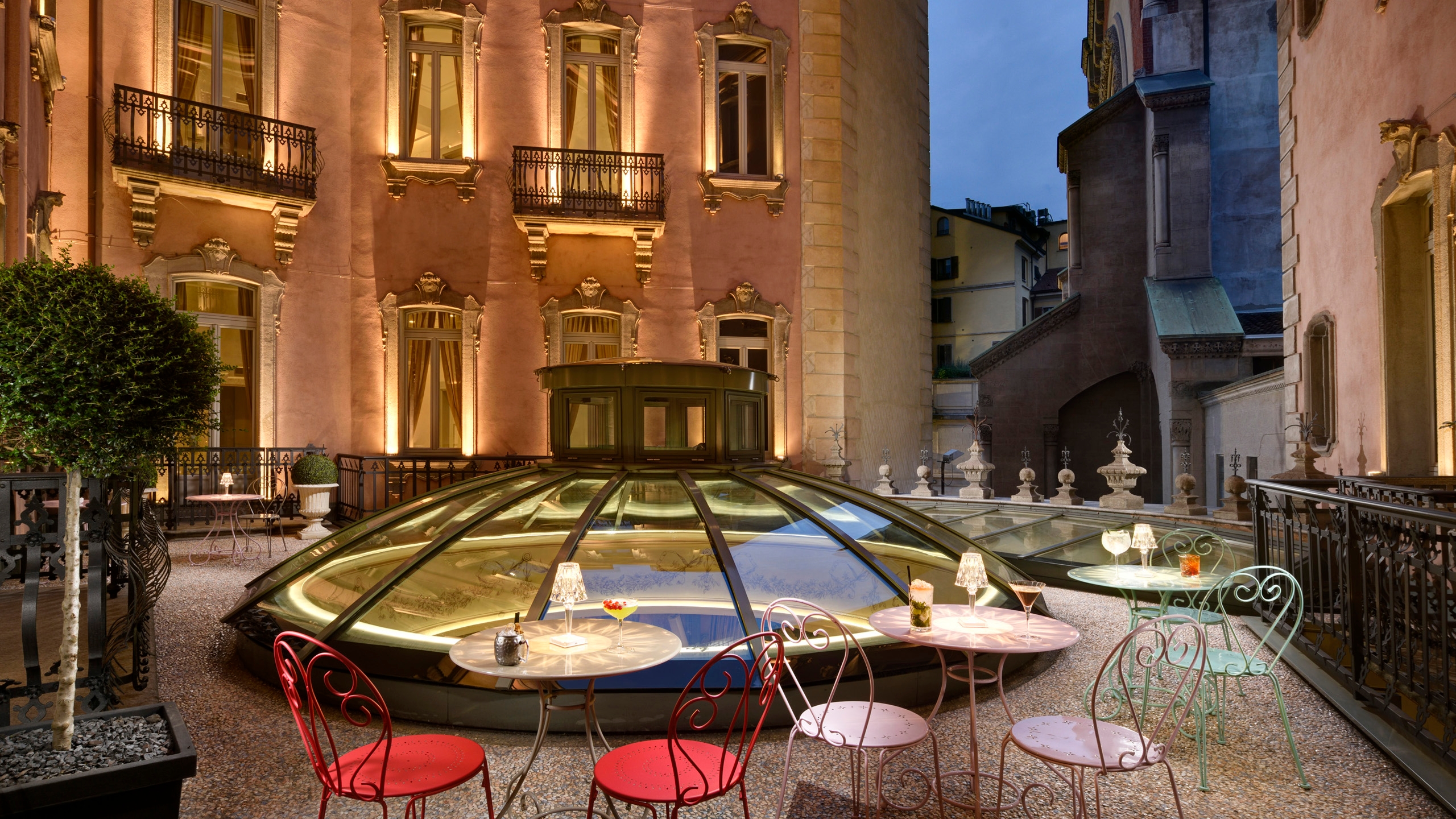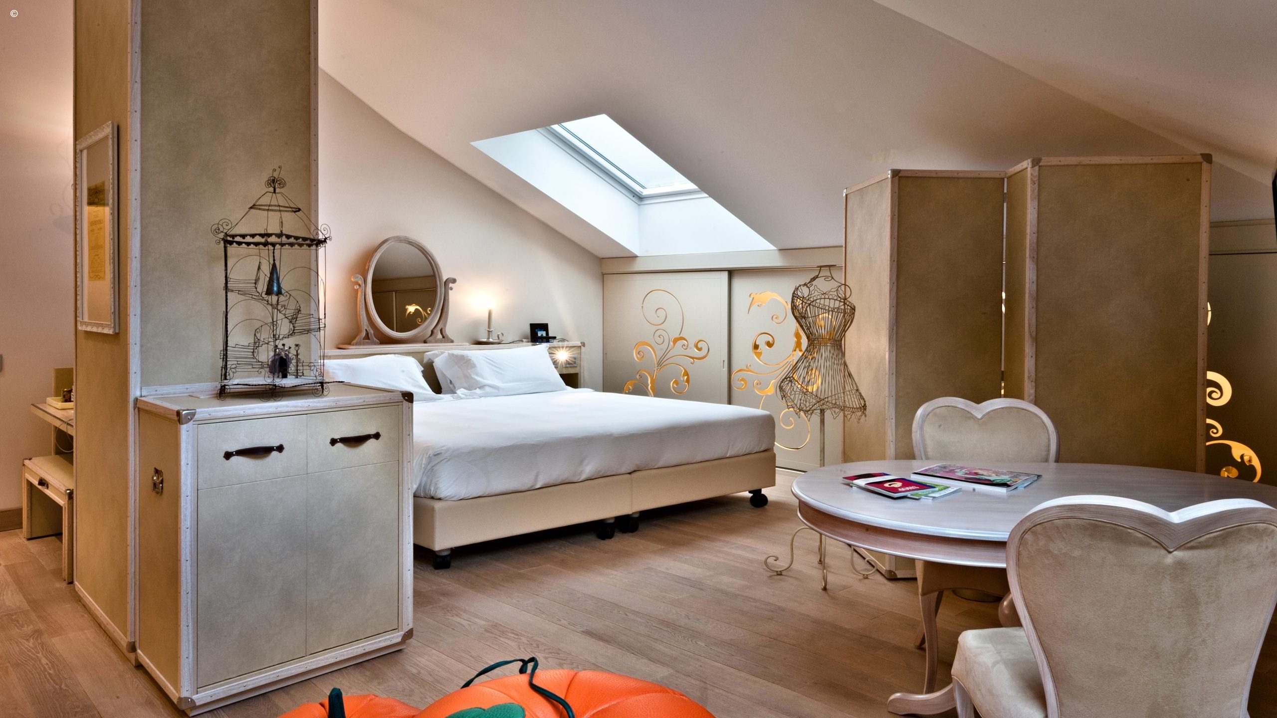 Located in the heart of the city, the hotel is housed within an early 20th-century art nouveau building, and draws its inspiration from the world of fairytales and opera. Pastel colors adorn the walls of the 77 rooms, enhanced by floral patterns and butterflies, mosaics on the floors, mirrors and princely alcoves.