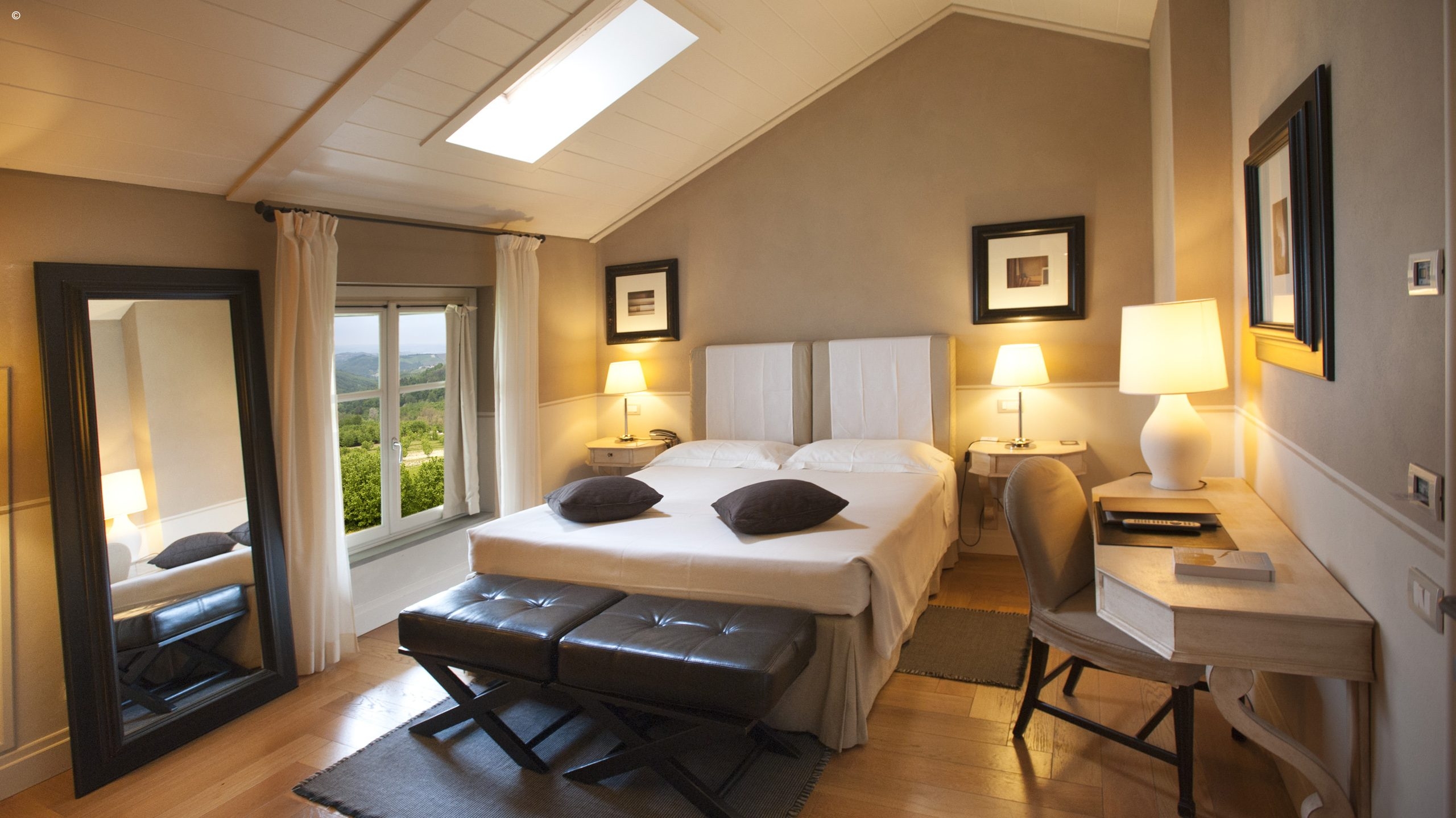 A bar, outdoor swimming pool, wellness centre with a sauna, and blooming gardens round out the hotel’s grounds.