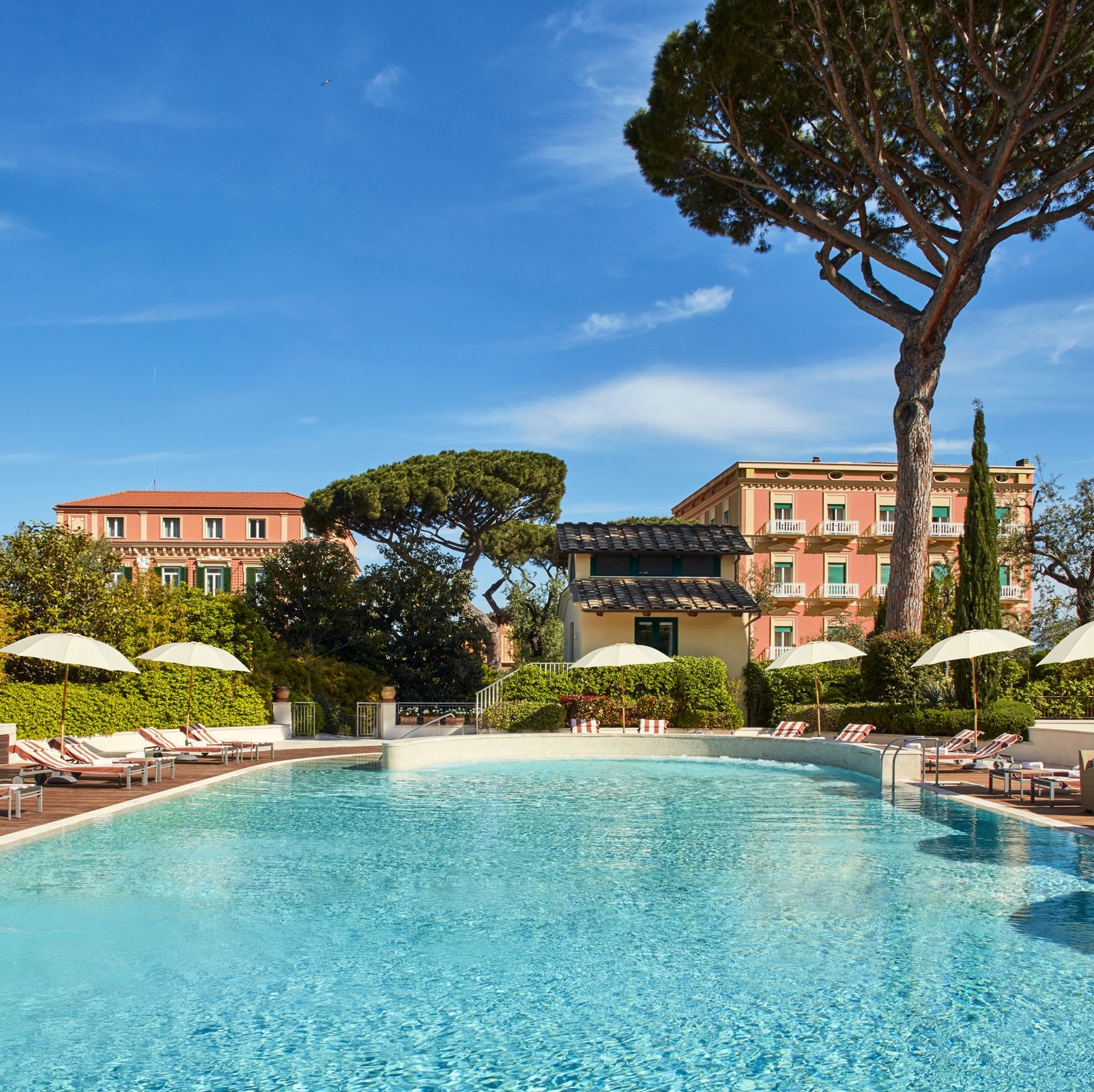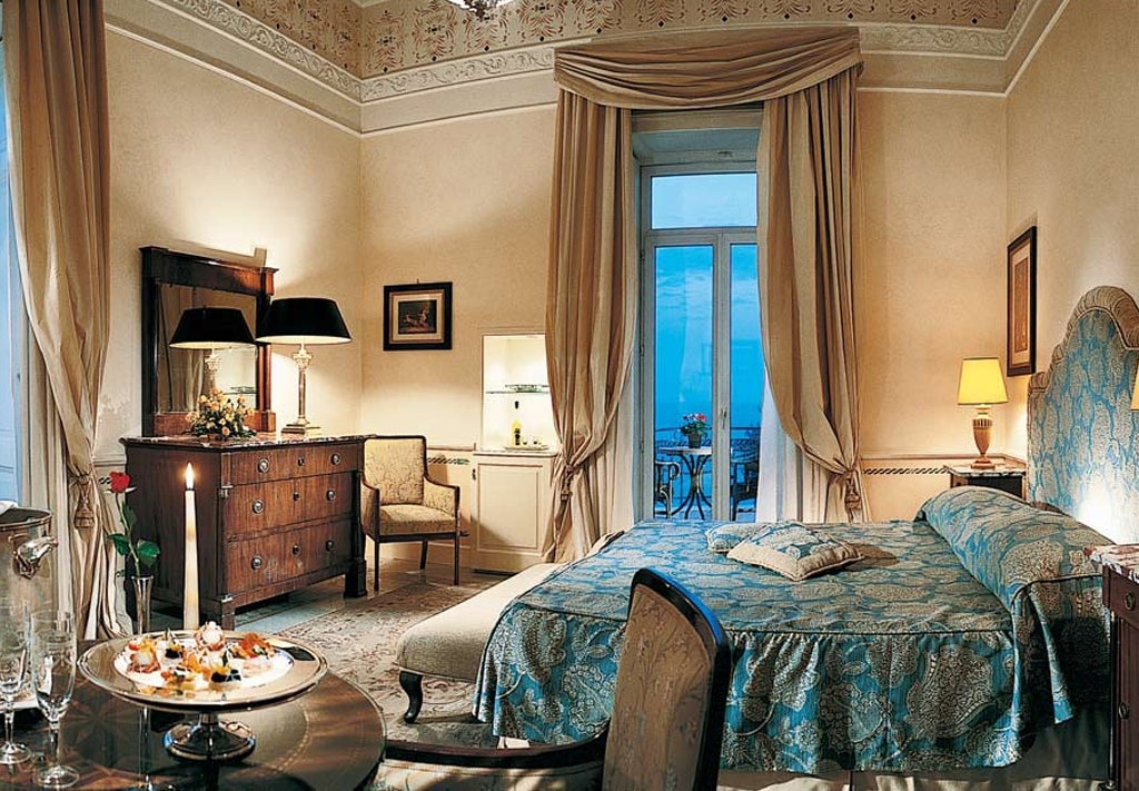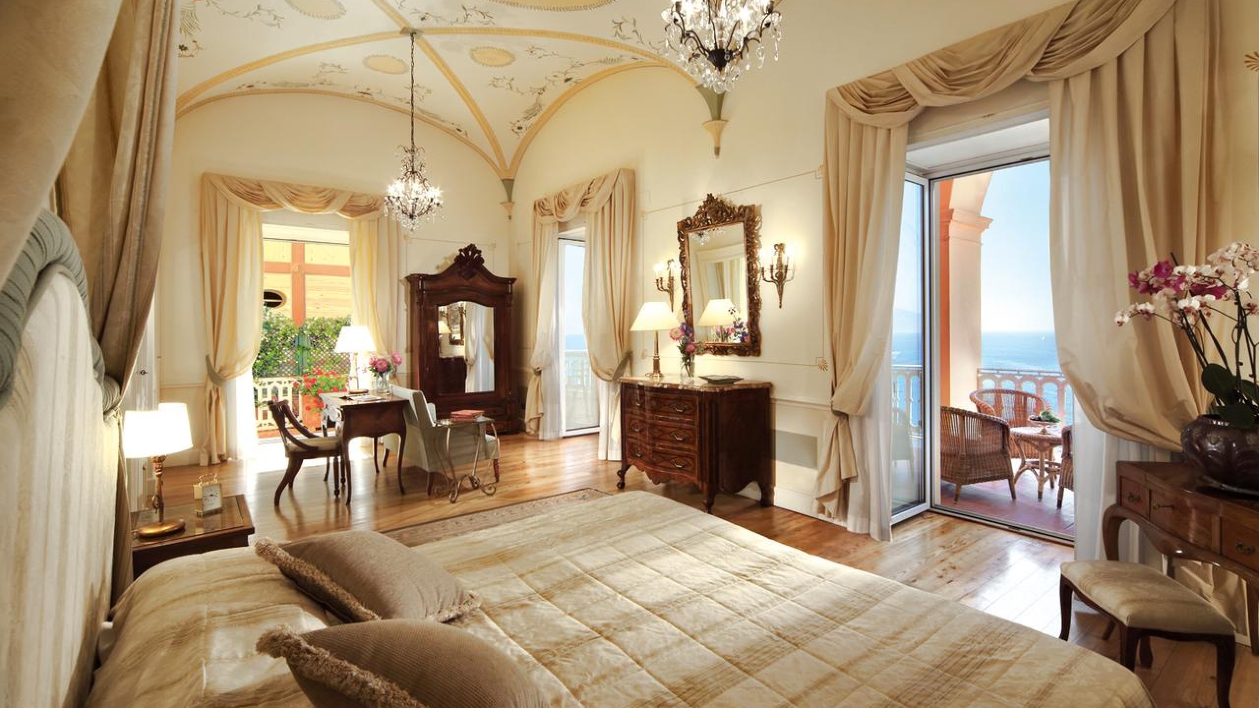 Upon entering, you’ll be greeted by a vintage concierge desk before being led to one of the 79 tastefully decorated rooms or suites. Interiors encompass antique furniture, oil paintings and frescoed ceilings, with expansive windows facing the garden or sea. Some include private terraces and pianos, along with original period elements and separate living spaces.