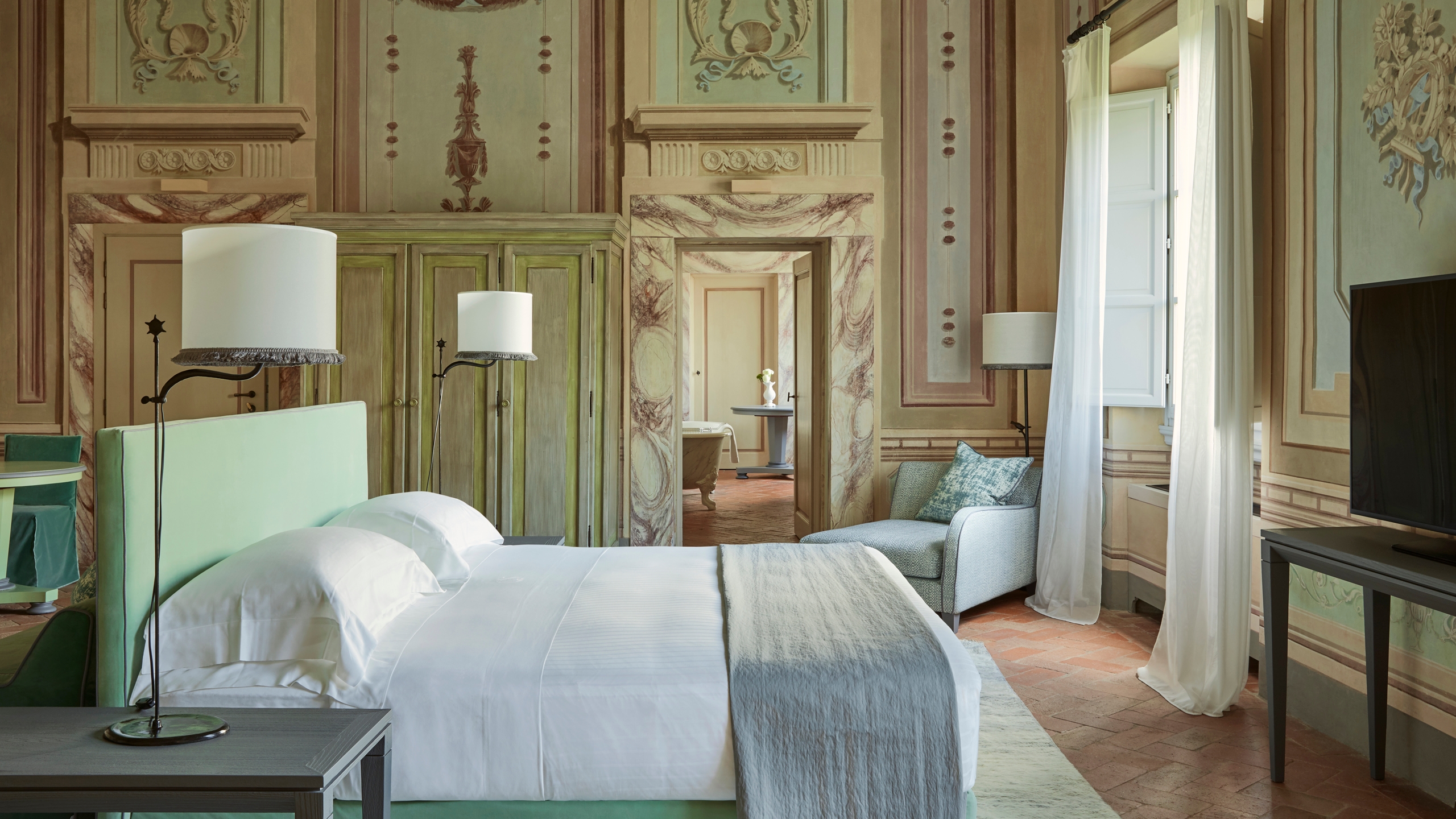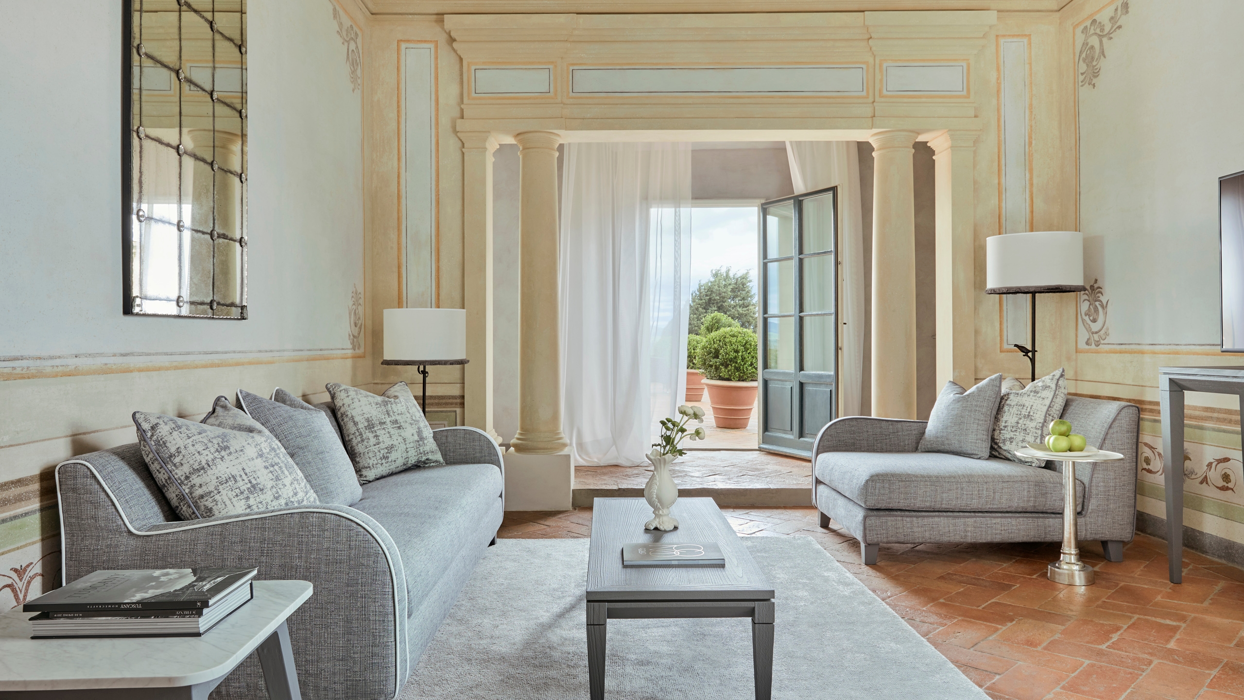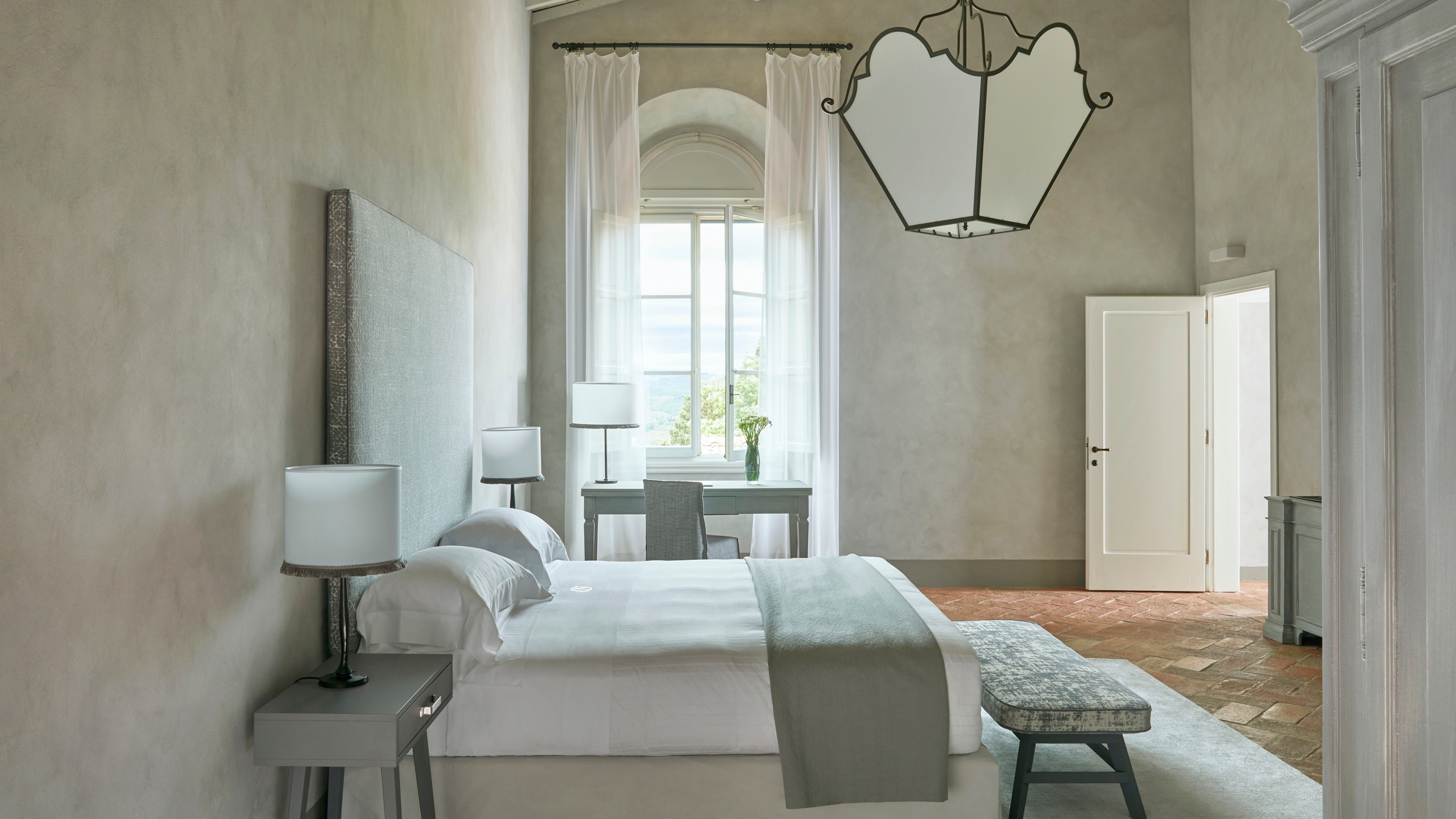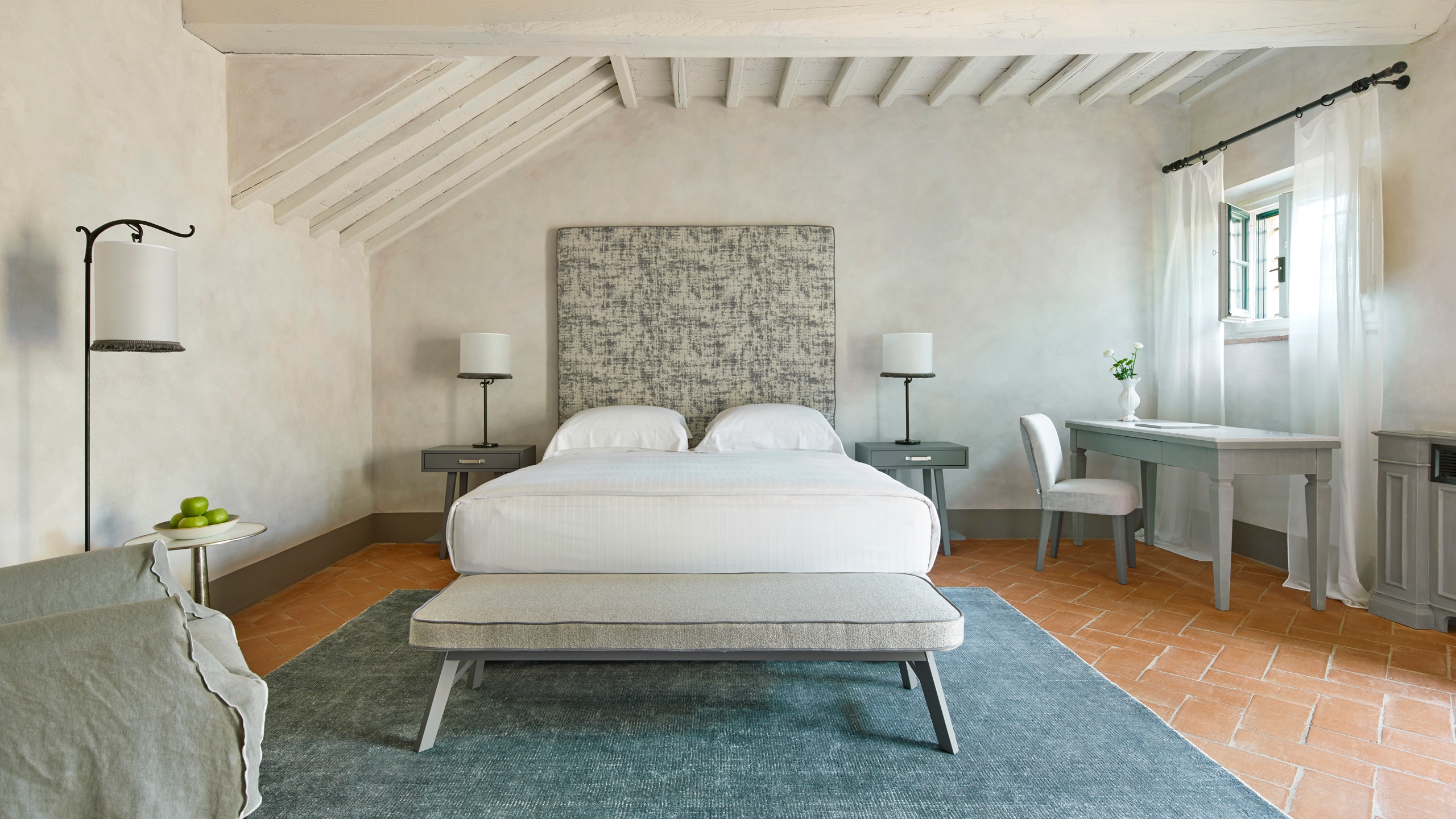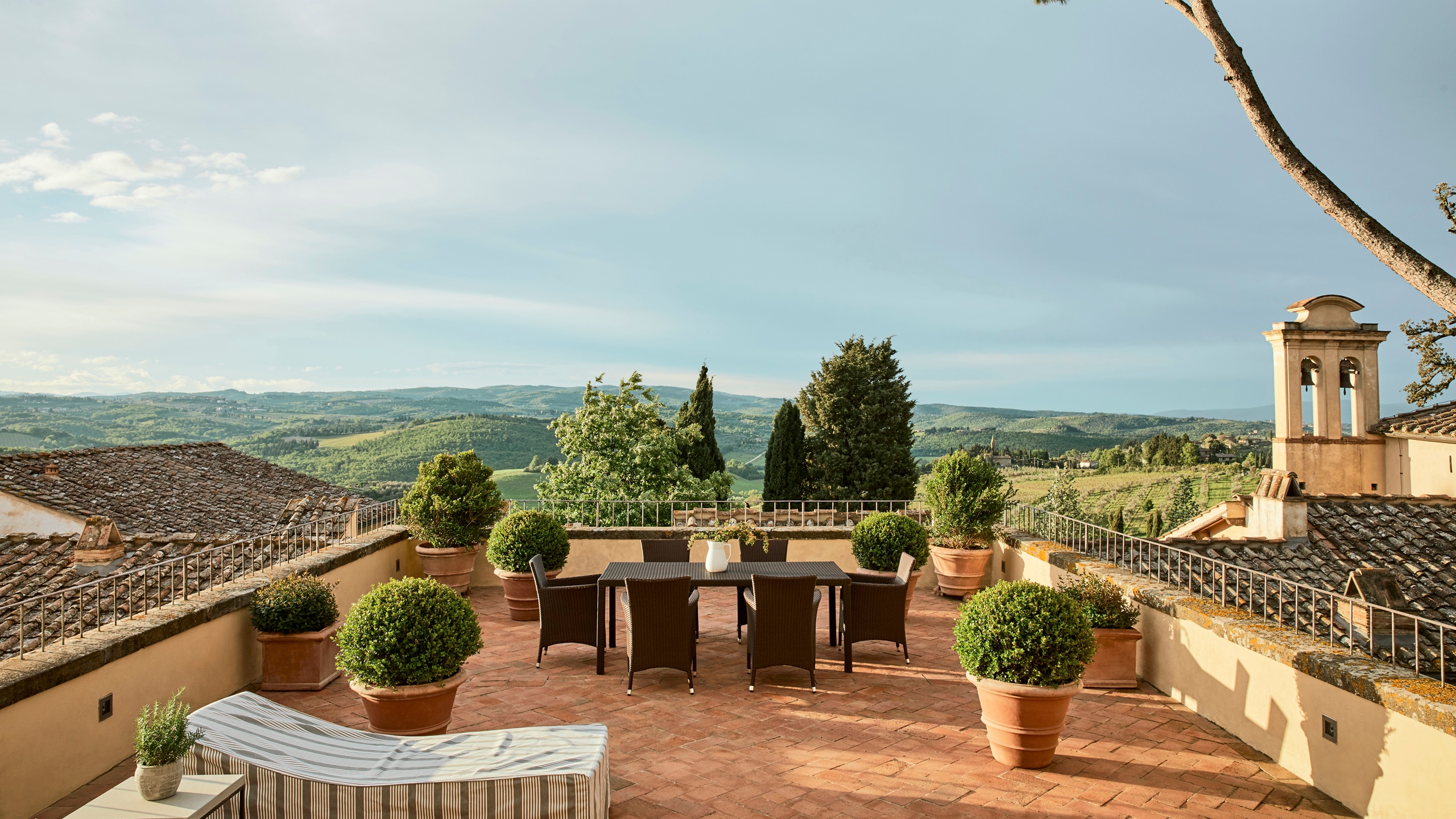Each of the 50 rooms and suites look out over quintessentially rolling Tuscan countryside and the estate’s olive groves and vineyards that are frequented by pheasant, deer and wild boar.