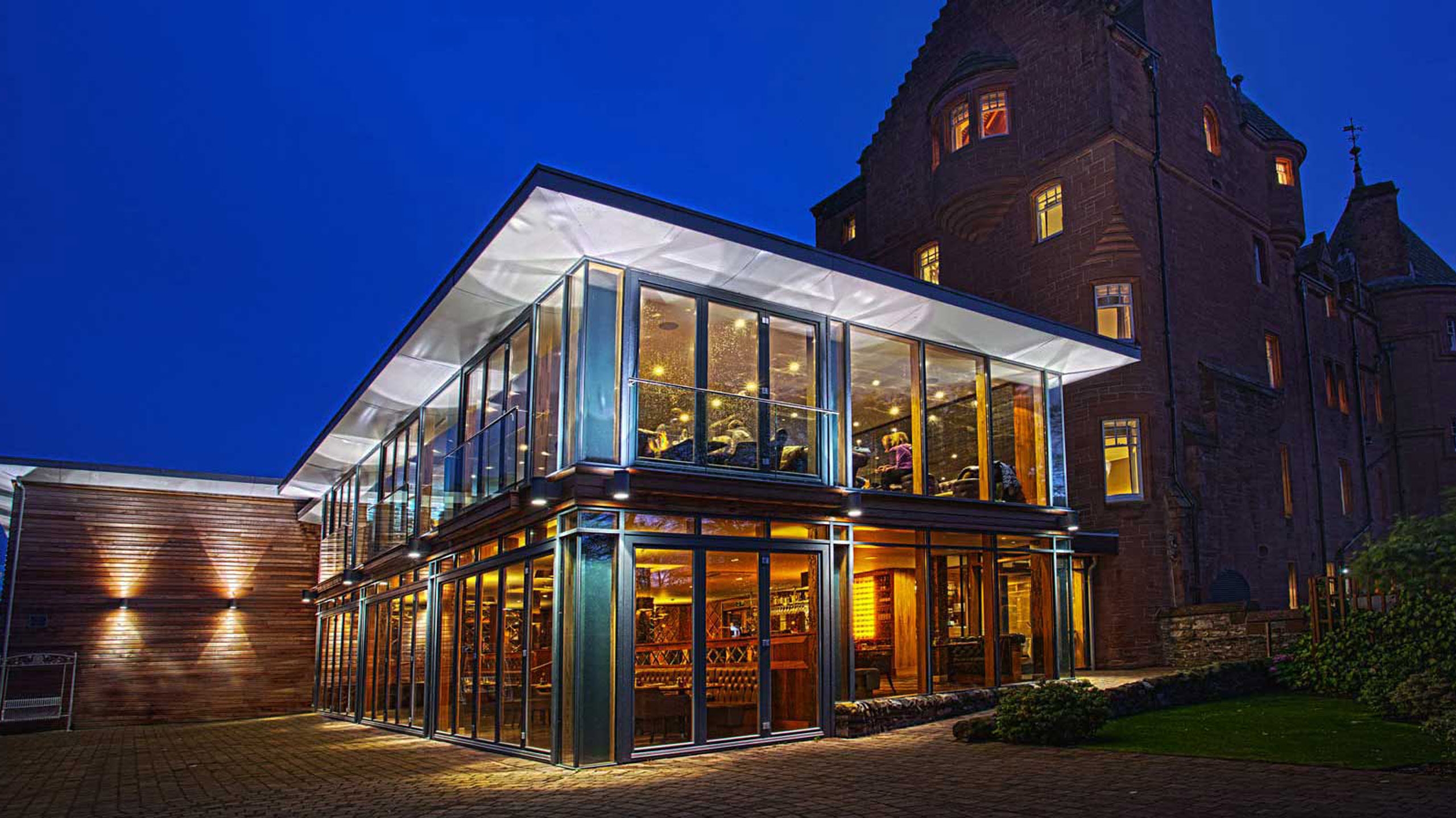 A former 19th century baronial residence, it has been converted to include 12 luxury suites in the castle with a further 18 rooms in an ancillary building connected by a strikingly modern timber and glass structure which also holds a relaxed brasserie restaurant and gin bar.