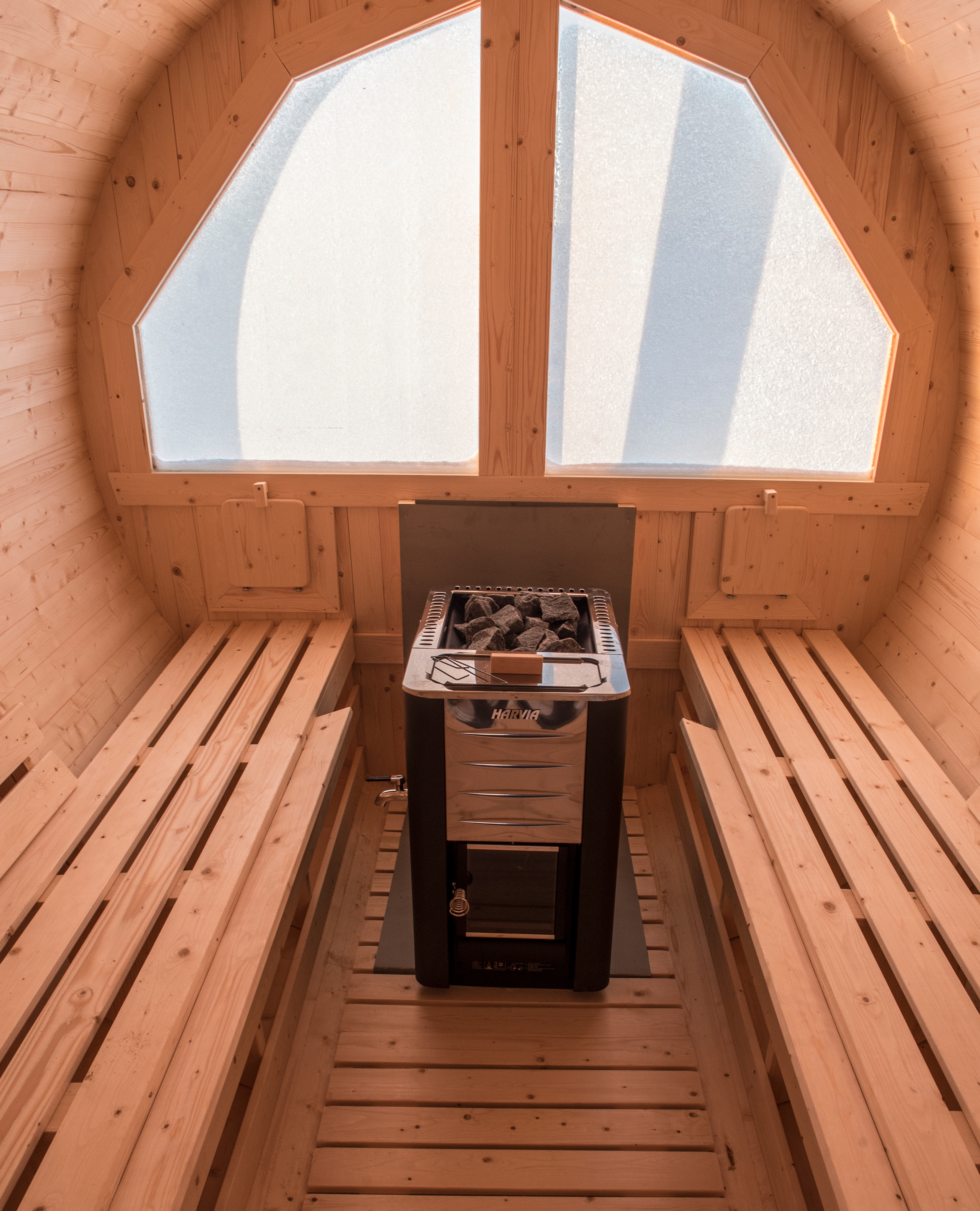 There are three log cabins, one of which is a family cabin sleeping up to four people. Each features a bathroom, fireplace and private outdoor Jacuzzi. Large panoramic windows allow you to enjoy your surroundings – the pale haze of an early morning and the sprinkling of stars on a clear night is truly magical. There is also a wood-fired sauna in a separate building.