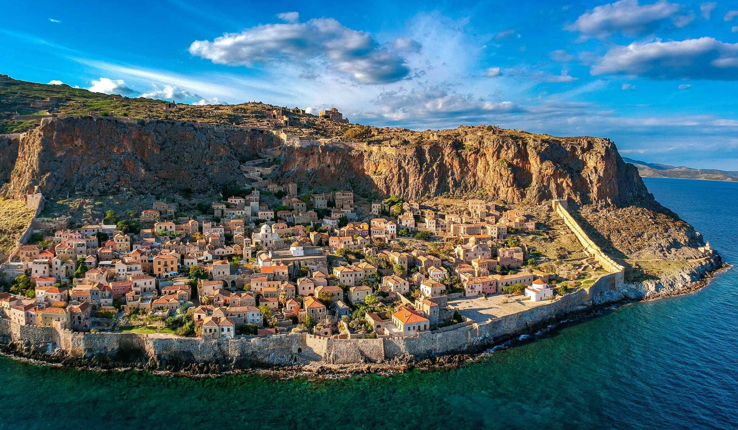 Aerial view of the town of Monemvasia in Greece from the ocean