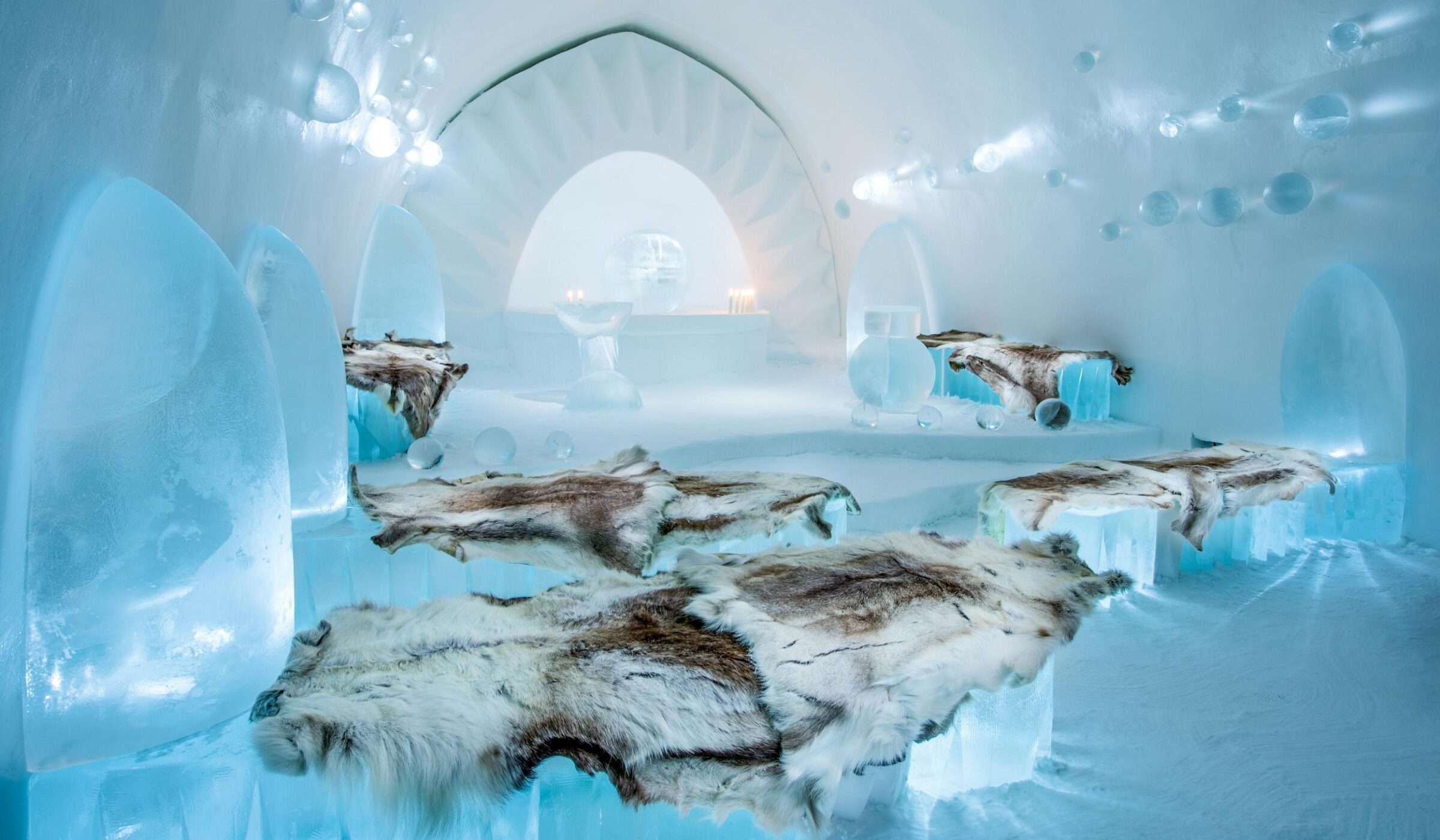 Venture into Sweden’s breathtaking Arctic region, Swedish Lapland, where you’ll stay at the world-famous Icehotel in Jukkasjärvi, crafted using ice made from the River Torne’s frigid waters. You’ll spend one night in a cold room and the other in a warm room.