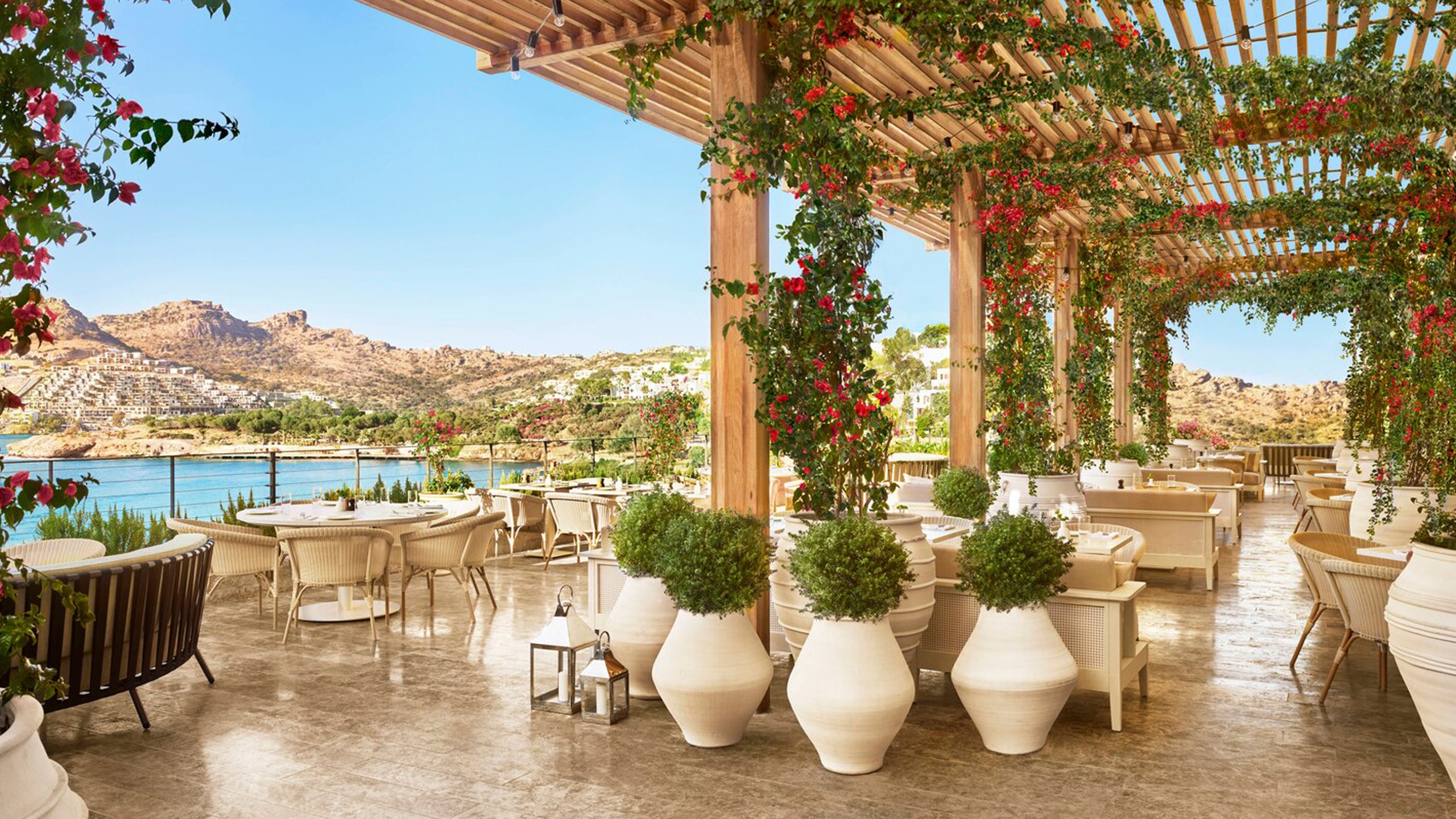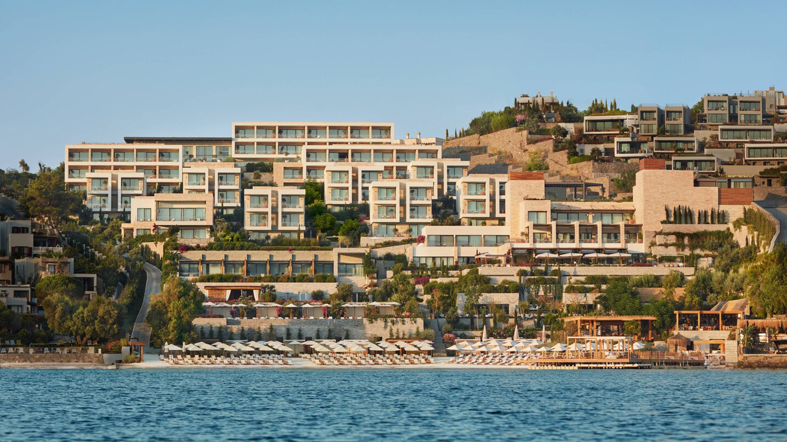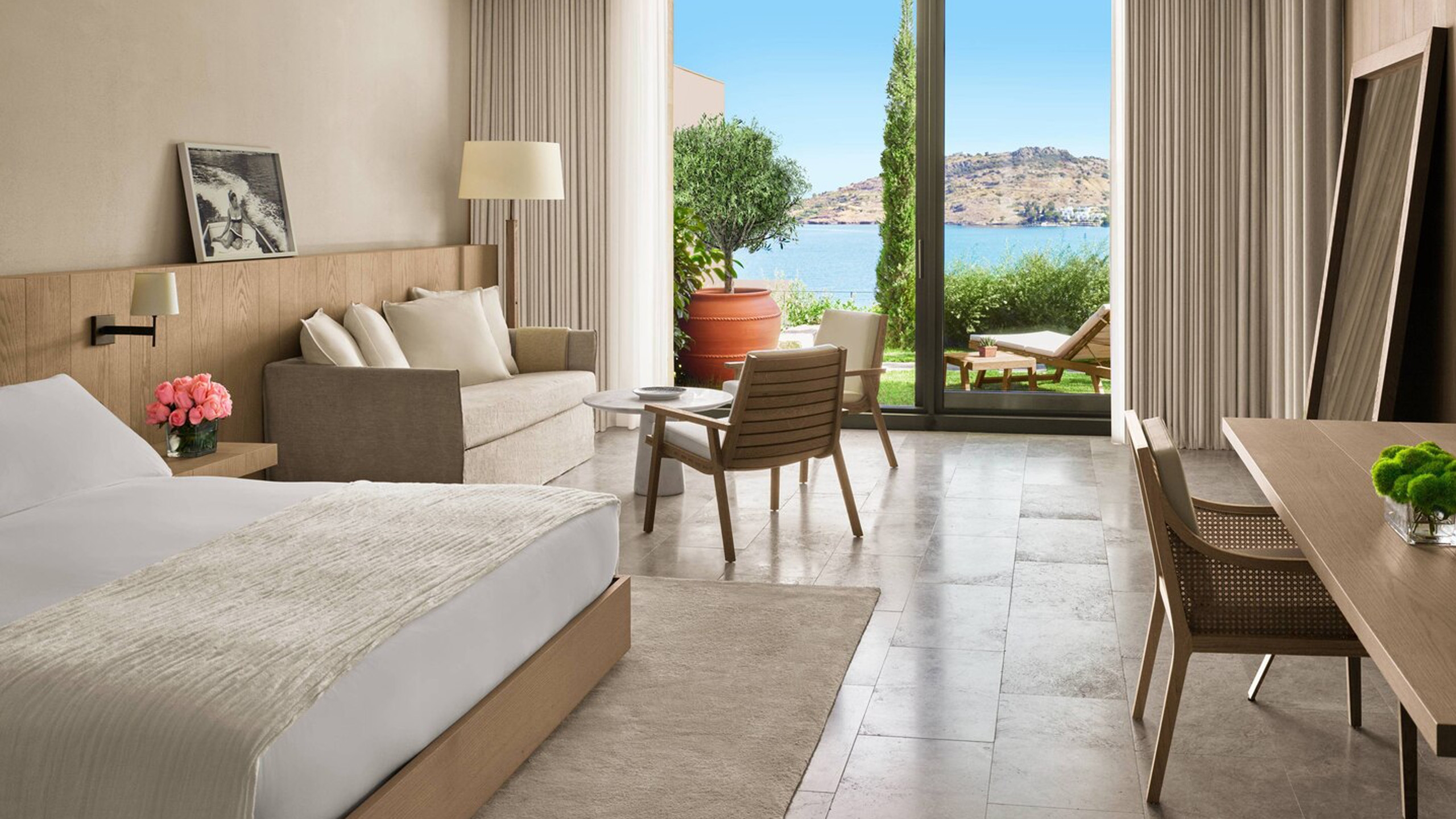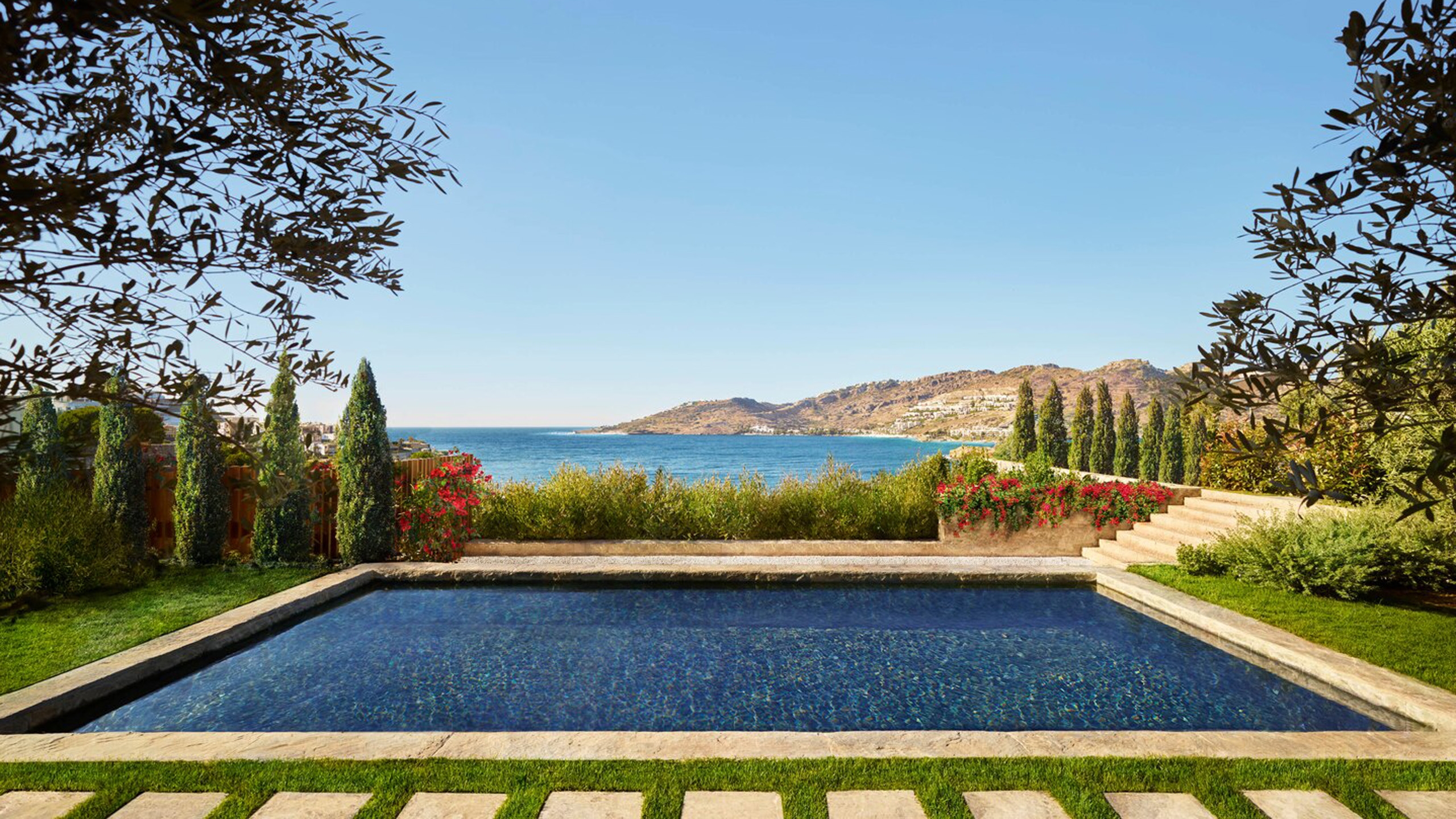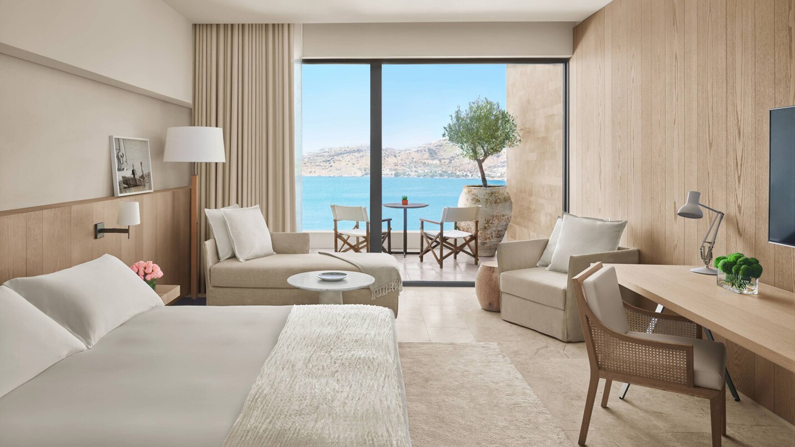 The focal point of the hotel, a grand structure of marble and glass, looks out over the grounds, boasting supreme vistas of the white stretch of sand below. Branching out from this building, the guestrooms, lofts and villas, linked by paths, draw on soft tones and light woods, as well as marble bathrooms, with gaping tubs, to create tranquil interiors. Most of the accommodation has views of the Aegean Sea, and upgraded suites encompass kitchens and patios, with plunge pools.