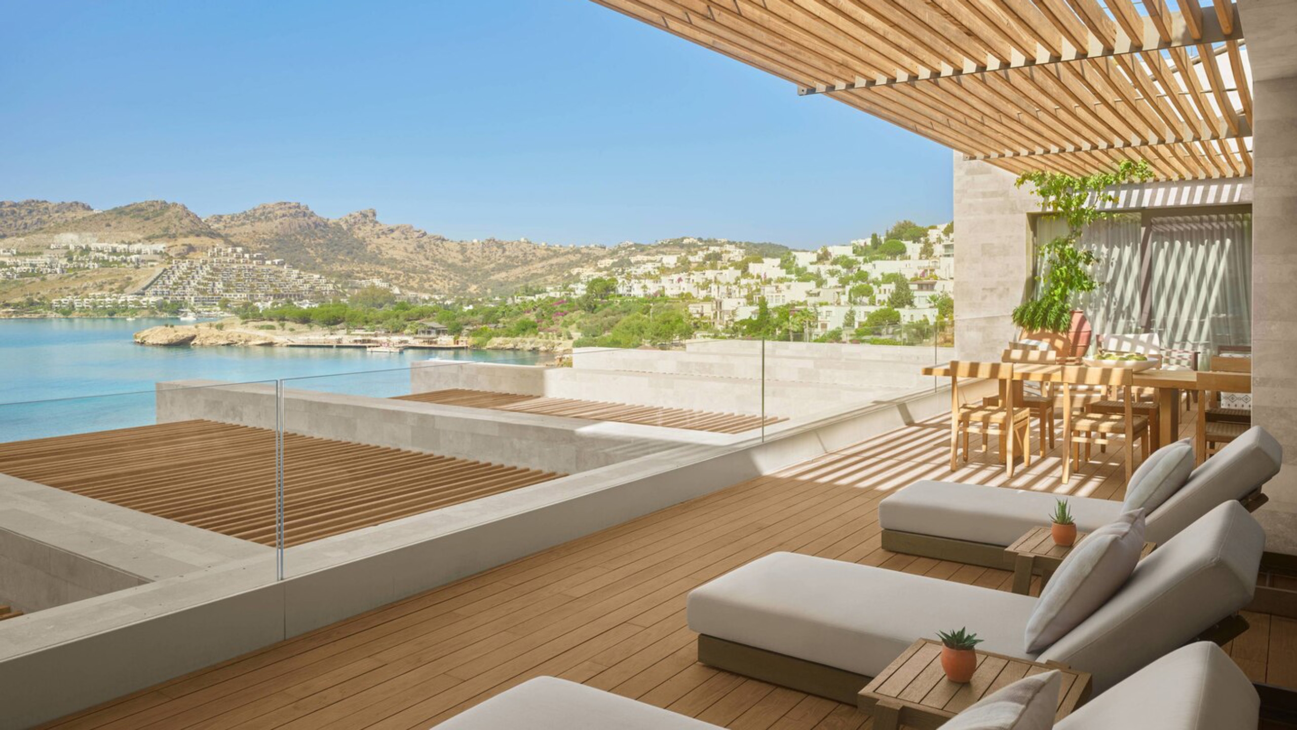 Blessed with a perfect position on the banks of the Turquoise Coast, this stylish boutique hotel of various levels appears to almost spill out onto a private beach, providing its guests with direct access to the sea. The sprawling levels feature all-encompassing terraces, manicured lawns and turquoise pools, shaded by over-arching olive trees, or trellises, dappled with bougainvillea and foliage.