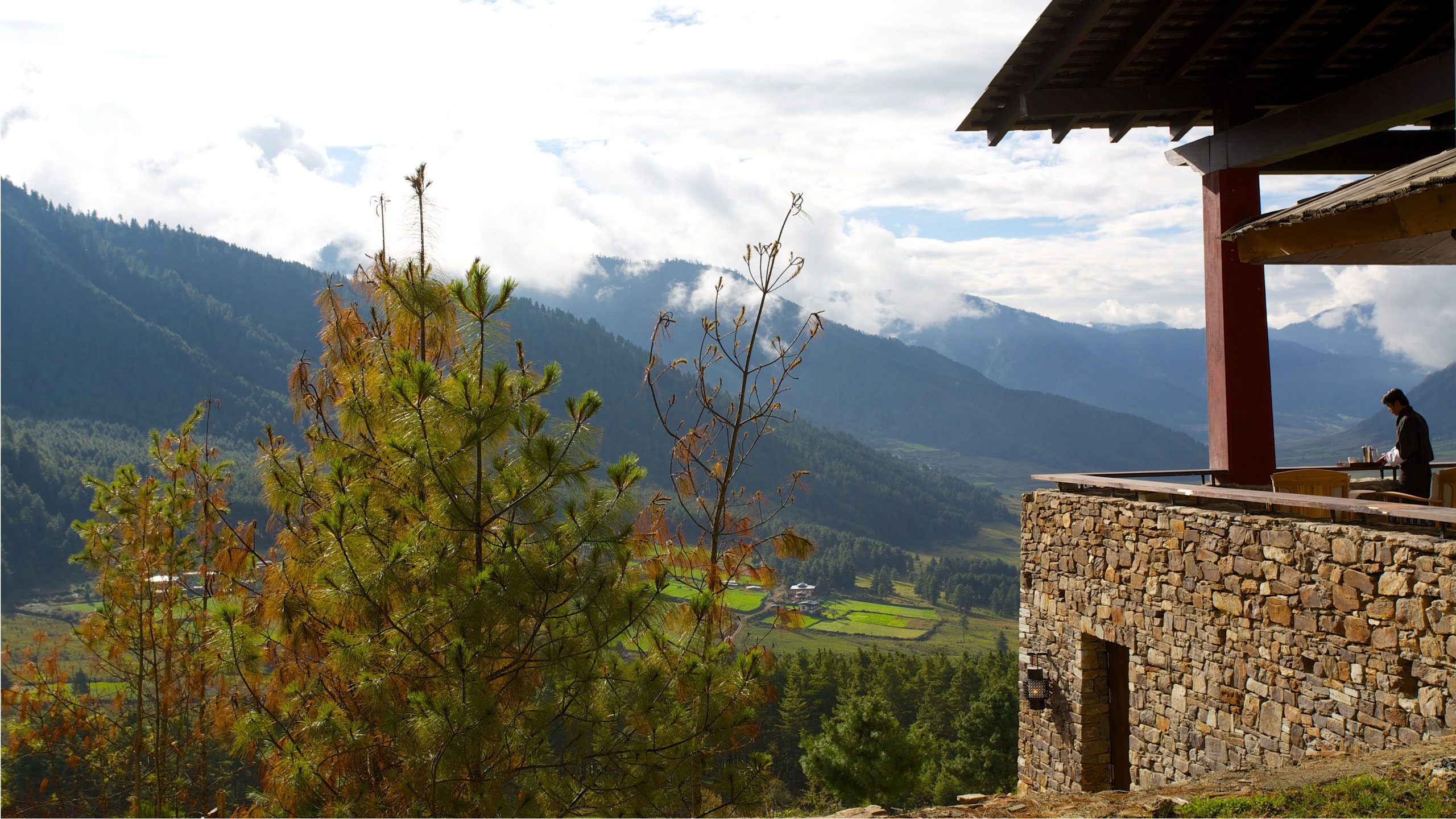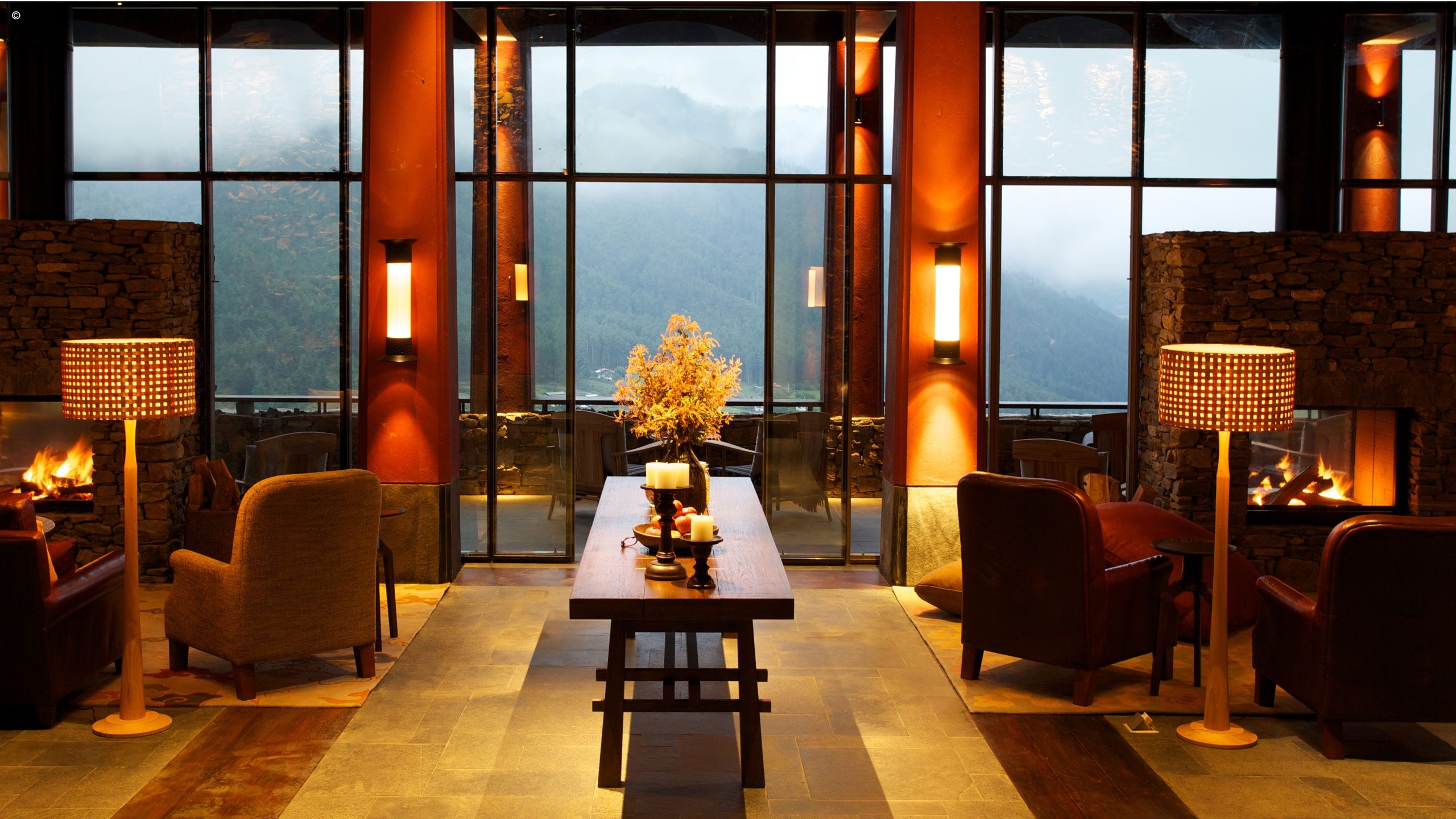 The newly built hotel draws on both the unique Bhutanese style of rural architecture and the talents of a top interior designer to compliment the sweeping views of its valley setting.