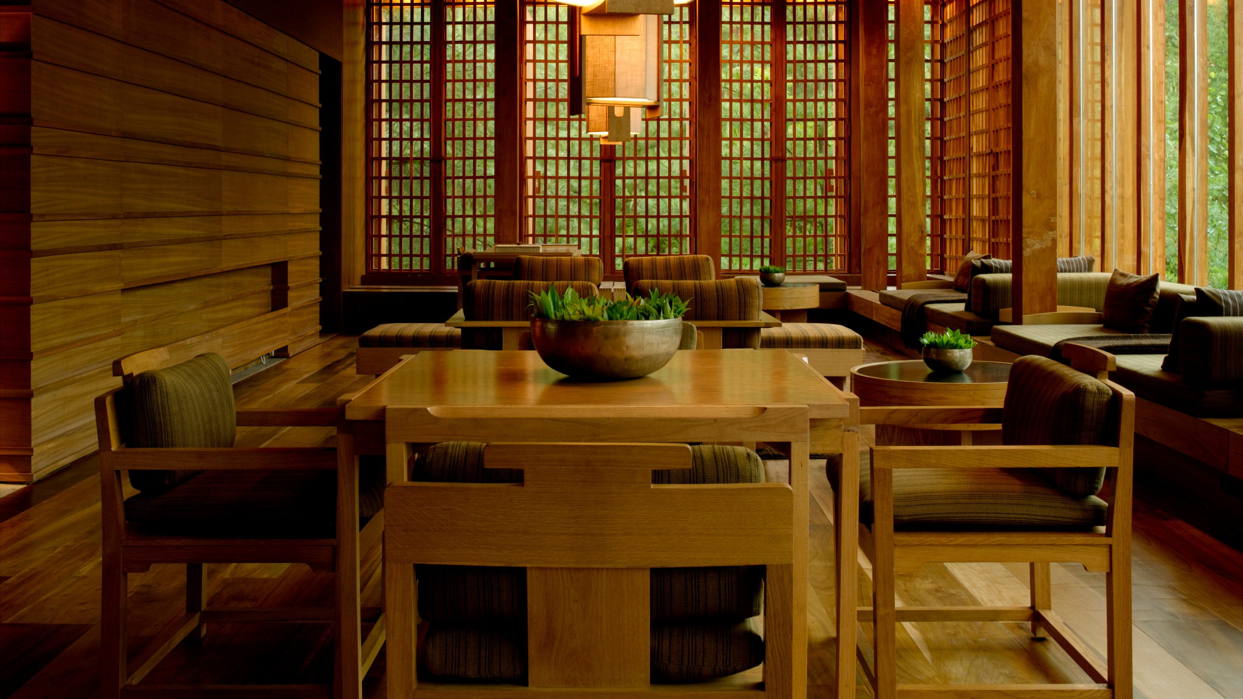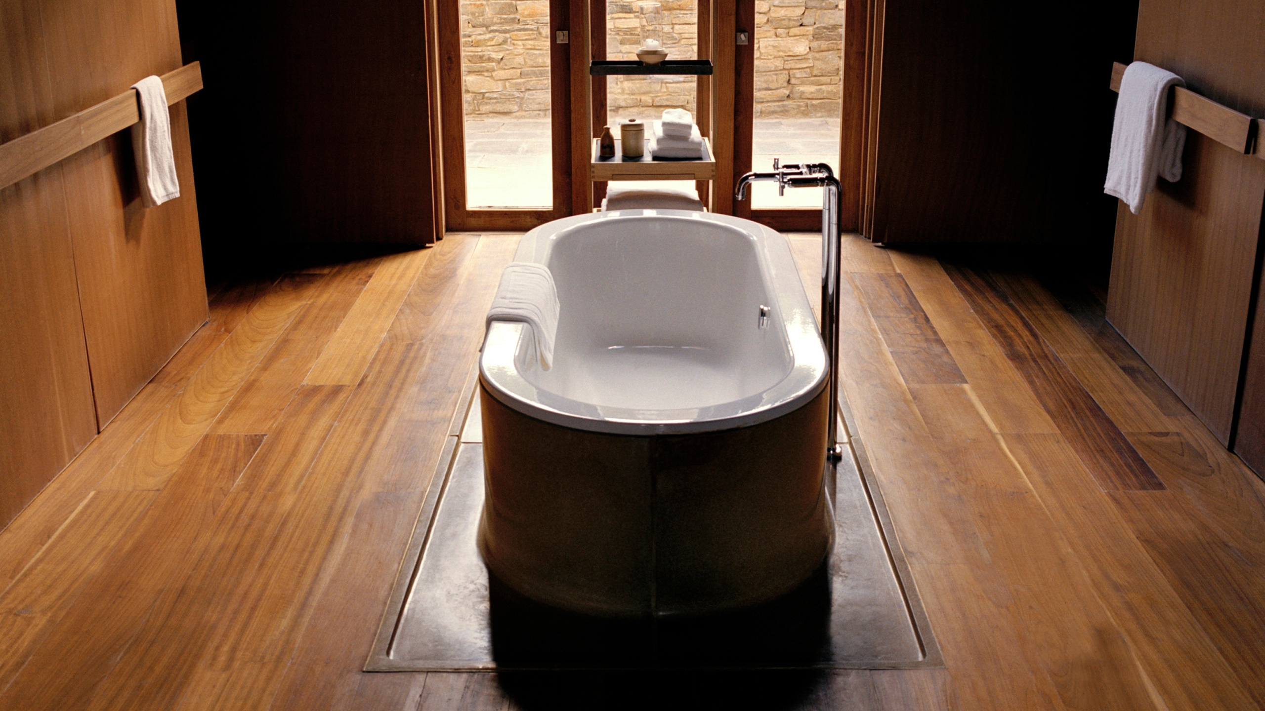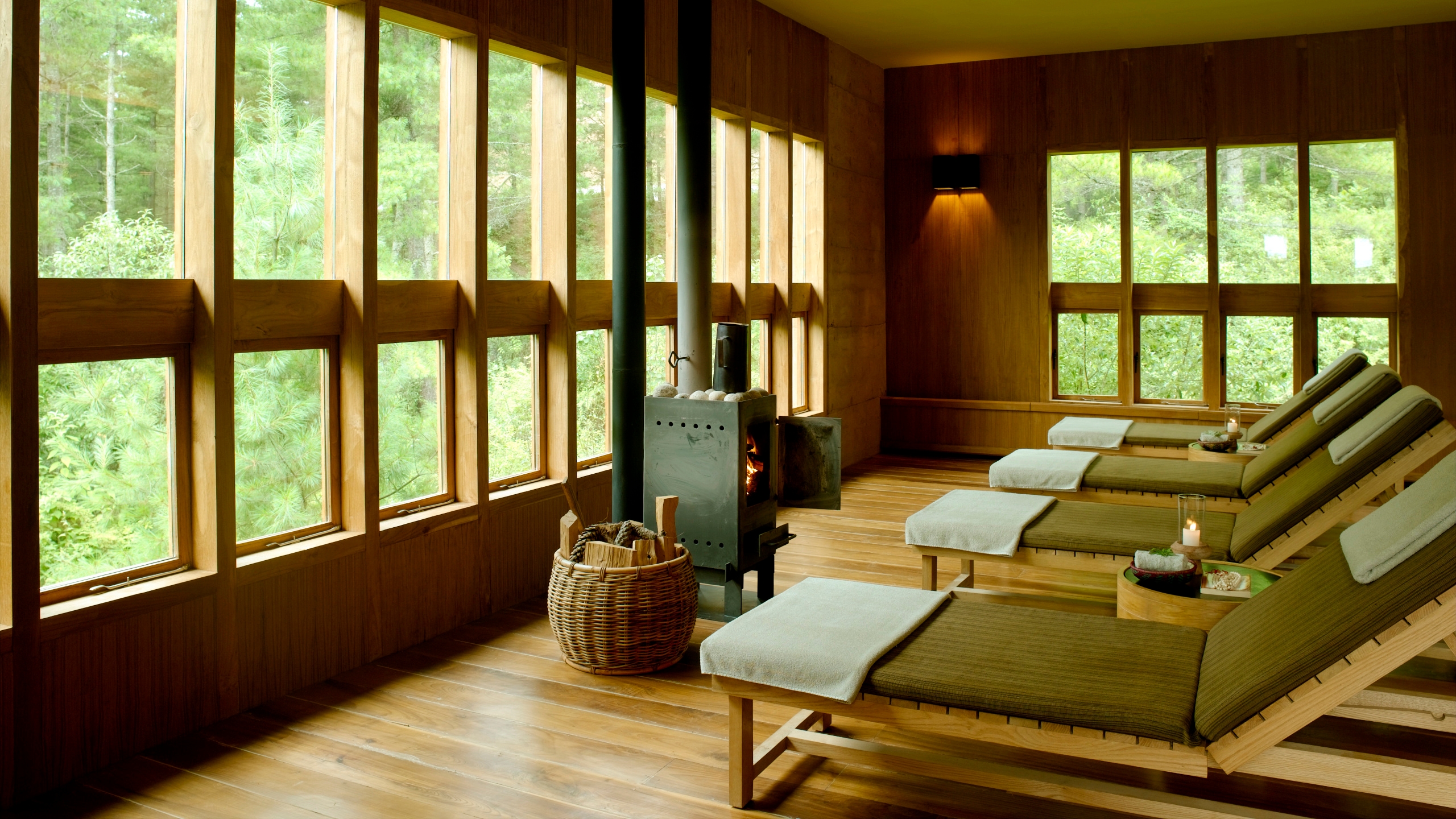 A spa set on two levels features a yoga studio with glass walls and treatment rooms with outdoor baths.