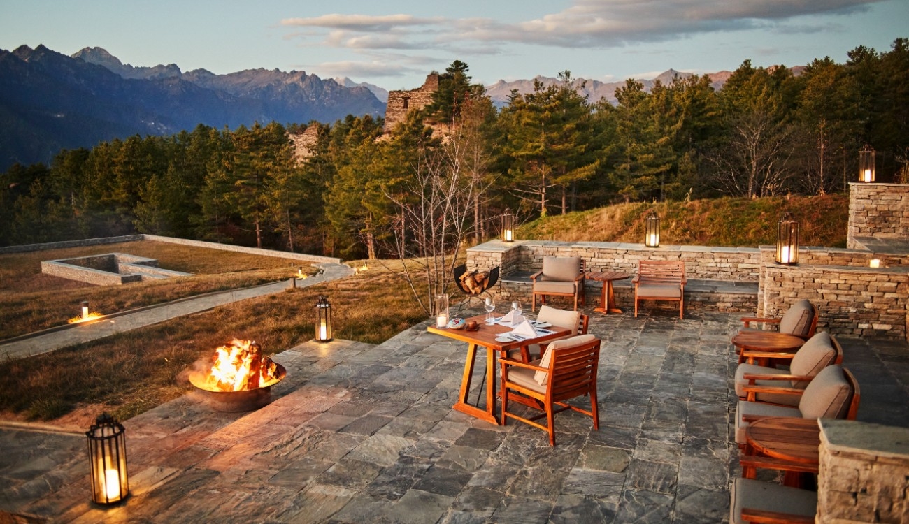 In the scenic Paro valley, a place of small villages and terraced fields, sits the Six Senses Paro. The new building sits on the site of an abandoned 16th century stone fortress that inspired the name of the lodge; “Stone Ruins”. The property has been designed to mimic the old style of the fortress and built using locally-cut stone. Inside the decor is calm and serene with simple, contemporary wooden furniture finished with fabrics in rich earthy tones. The hotel offers 16 spacious suites and a small collection of villas, all with beautiful valley views and each featuring a roaring log burner for those chilly evenings. The ensuite bathrooms, in keeping with the rooms themselves, are spacious and offer an understated luxury with all the comforts and amenities you’d expect. There’s indoor and outdoor dining at the hotel and two bar options – each has spectacular views out to the natural world. These social areas also feature log fires for a cosy and comforting atmosphere. The outdoor dining area is large, with a floor of huge stone flagstones. Experience complete relaxation in the hotel’s Six Senses Spa, a haven of warmth and tranquillity. Revel in the outdoor sauna and cool dip, the yoga room and meditation and relaxation areas. There’s also a beautiful indoor swimming pool, housed within a stone space, one wall made of glass and with a curved wooden ceiling, an architecturally stunning room.