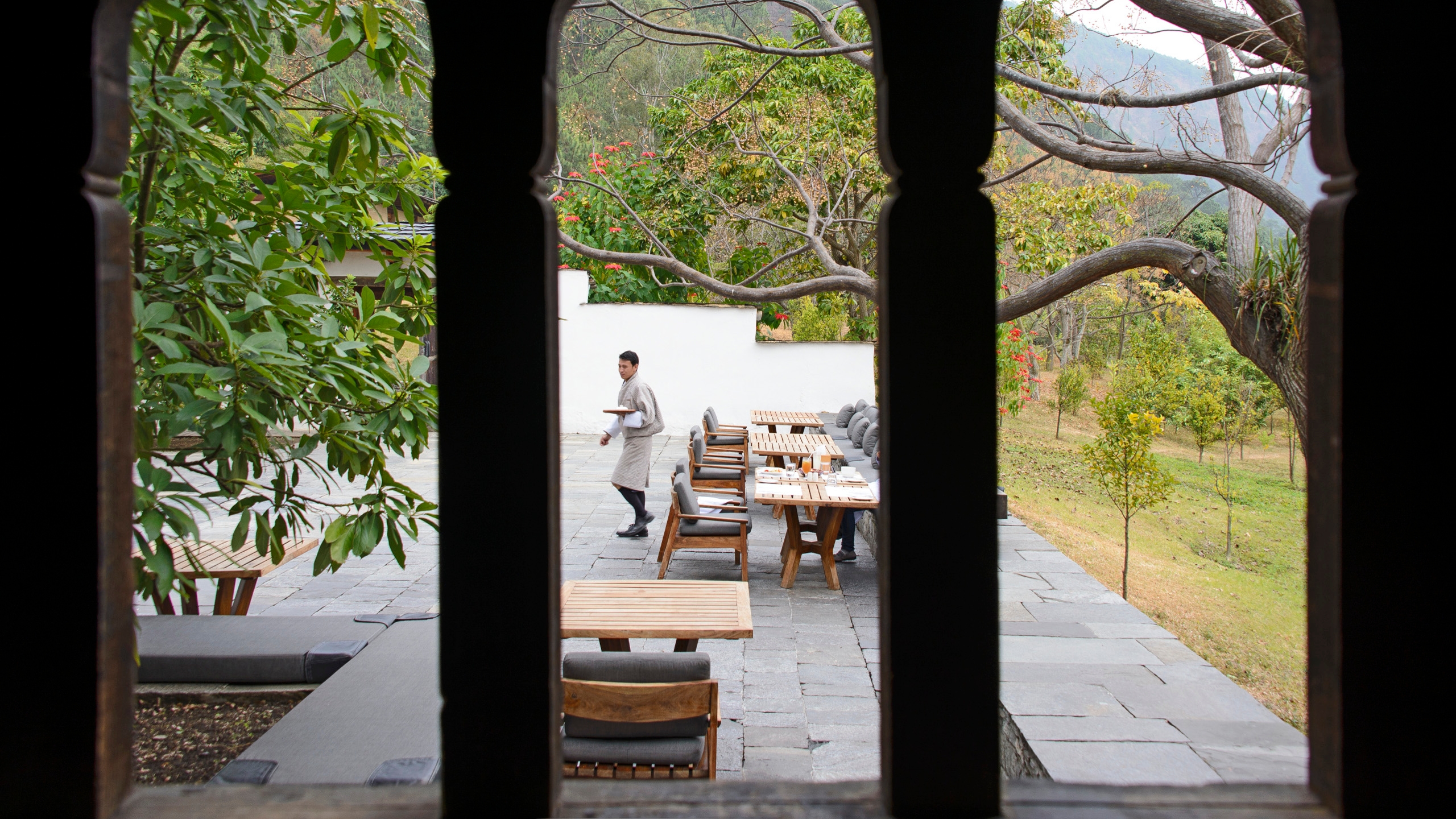 Wrapped in lush rice fields and fruit orchards by Mo Chhu River, with views to the seventeenth century Punakha Dzong, is a former traditional Bhutanese farmhouse: the Amankora Punakha hotel.