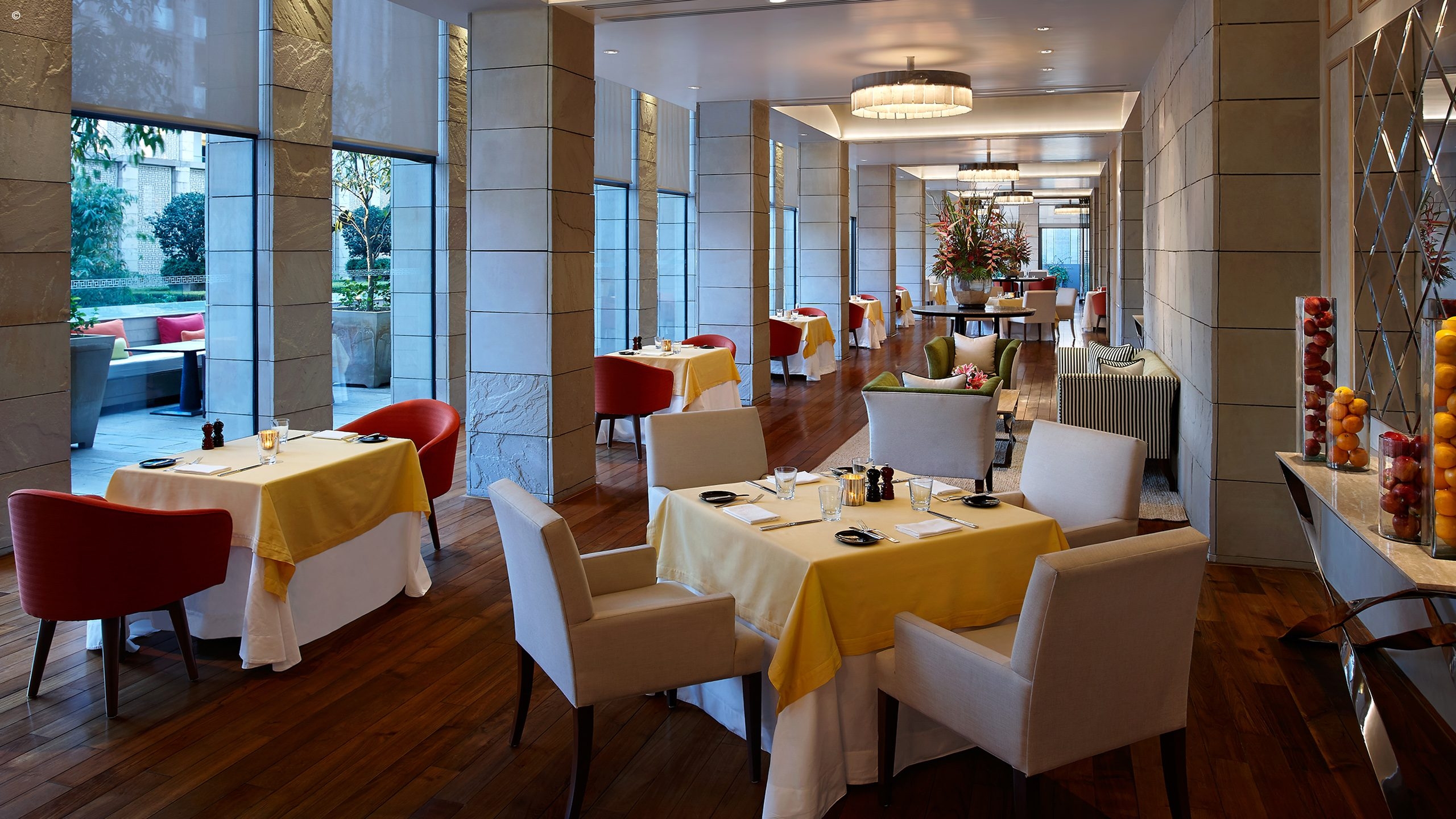 Sophisticated design touches prevail thoughout, from the light installations and sculptures to the gallery space in the foyer showcasing the work of contemporary Indian artists. The hotel’s restaurant, On the Waterfront, has a real buzz about it, with the ground floor overlooking a reflection pool and a glass pavillion for private parties. The Elan focuses on India’s diverse culinary traditions, and here you can same local delicacies from the north to the south.