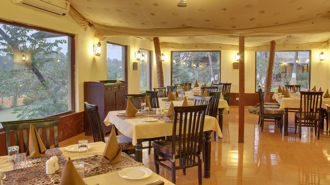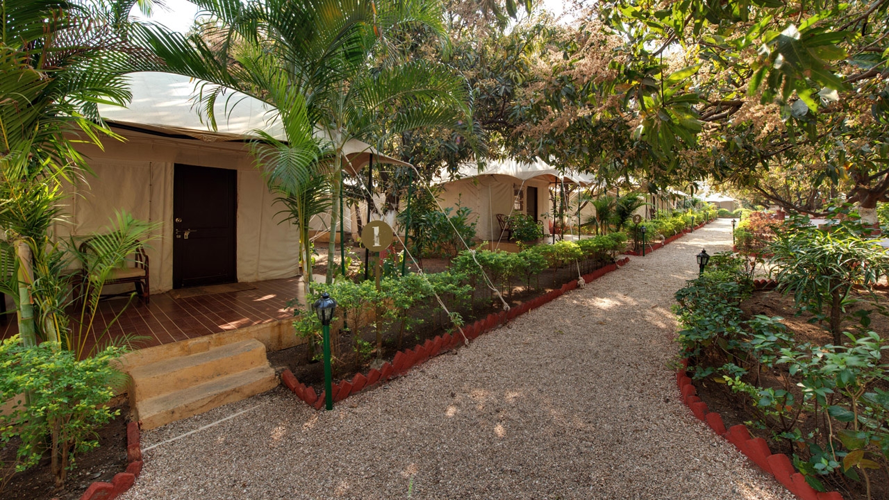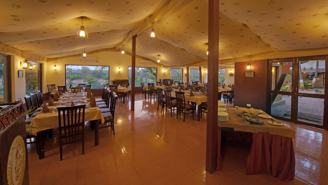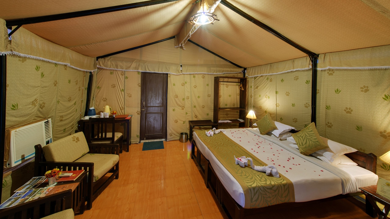 21 tents large tents are spacious and comfortable with en suite bathrooms and air conditioning, strung out along a path under shade of trees. Overlooking the river, the restaurant serves a choice of Indian, Chinese and Continental food and picnics in scenic locations nearby can be arranged.