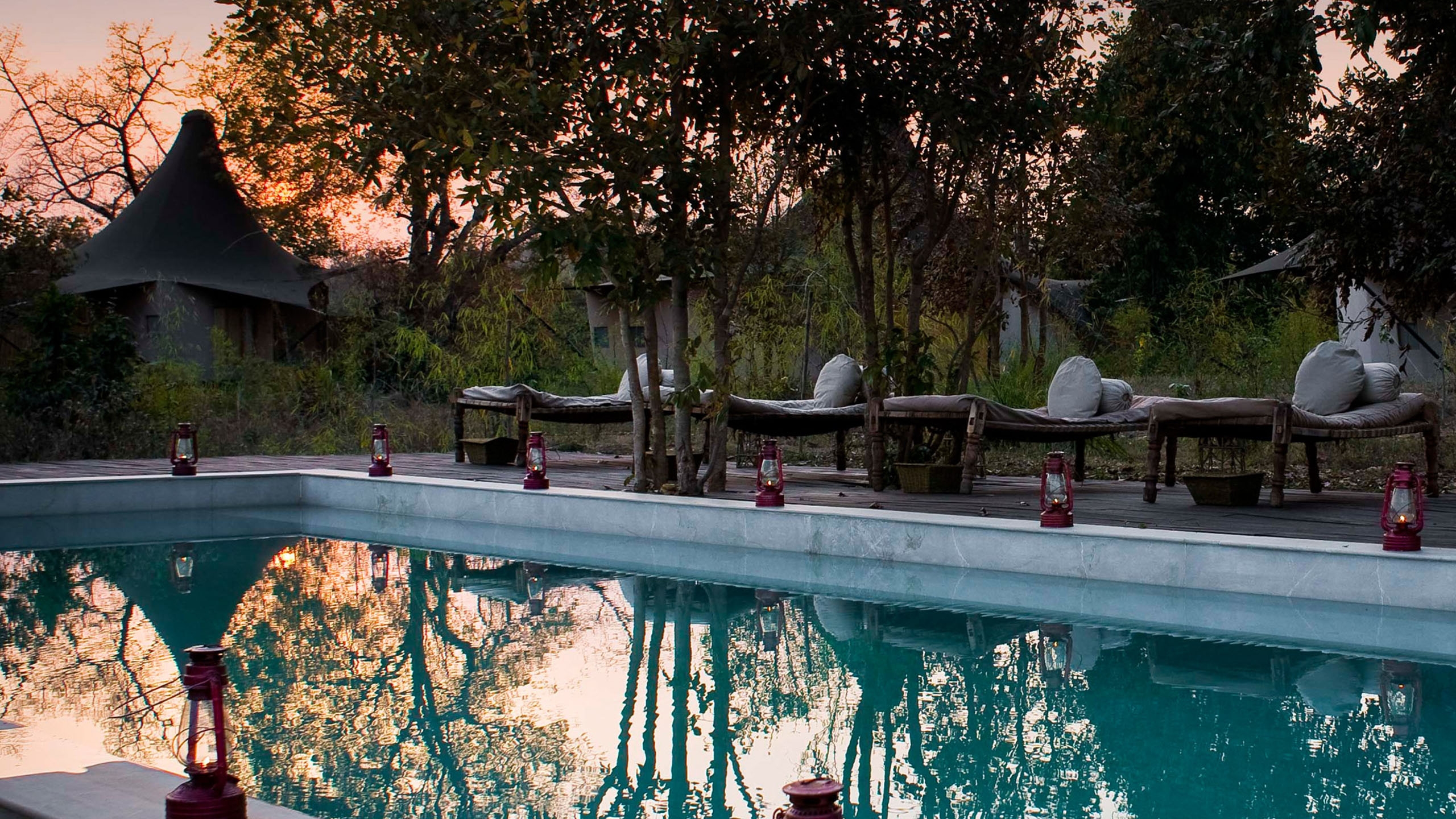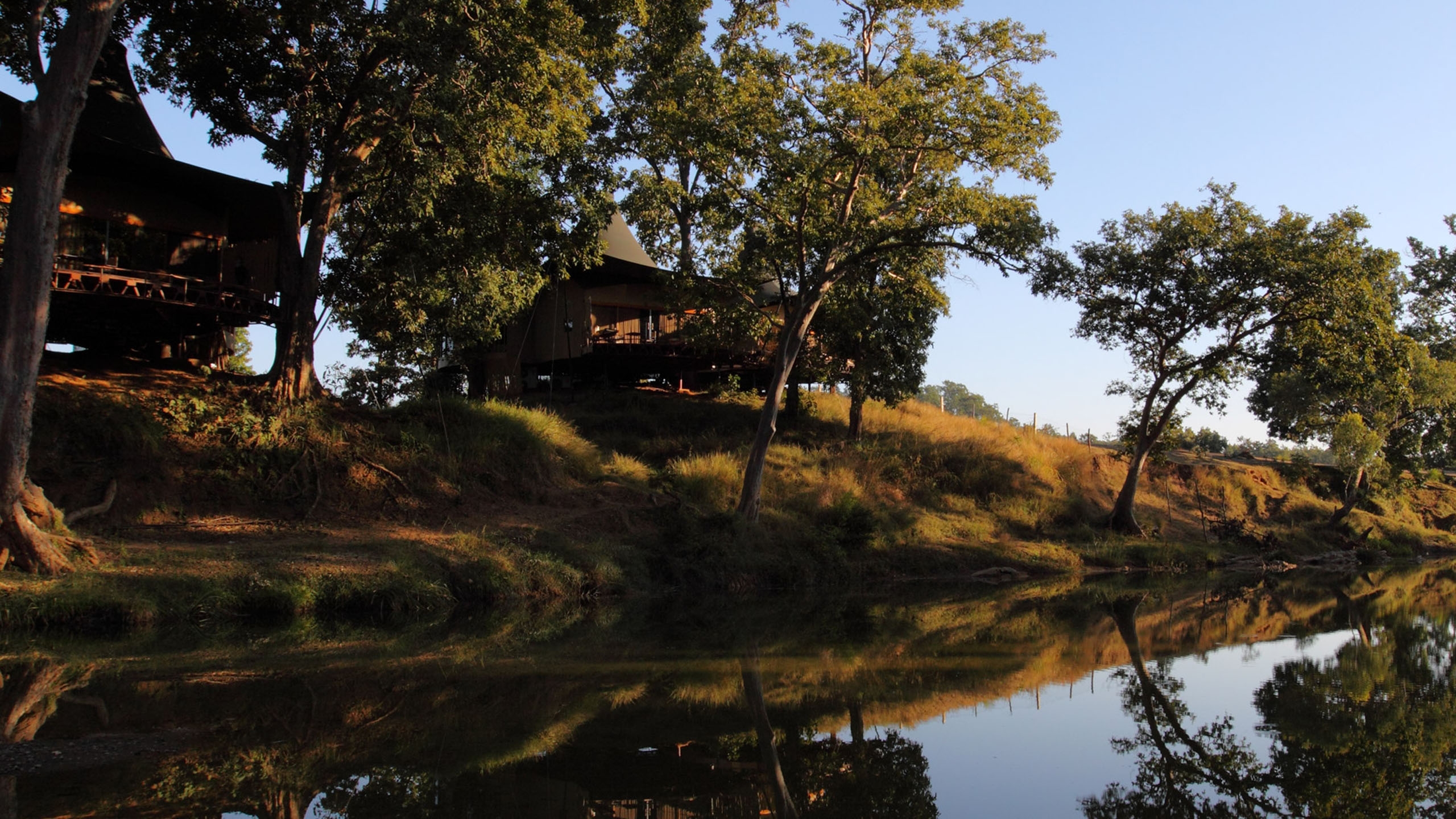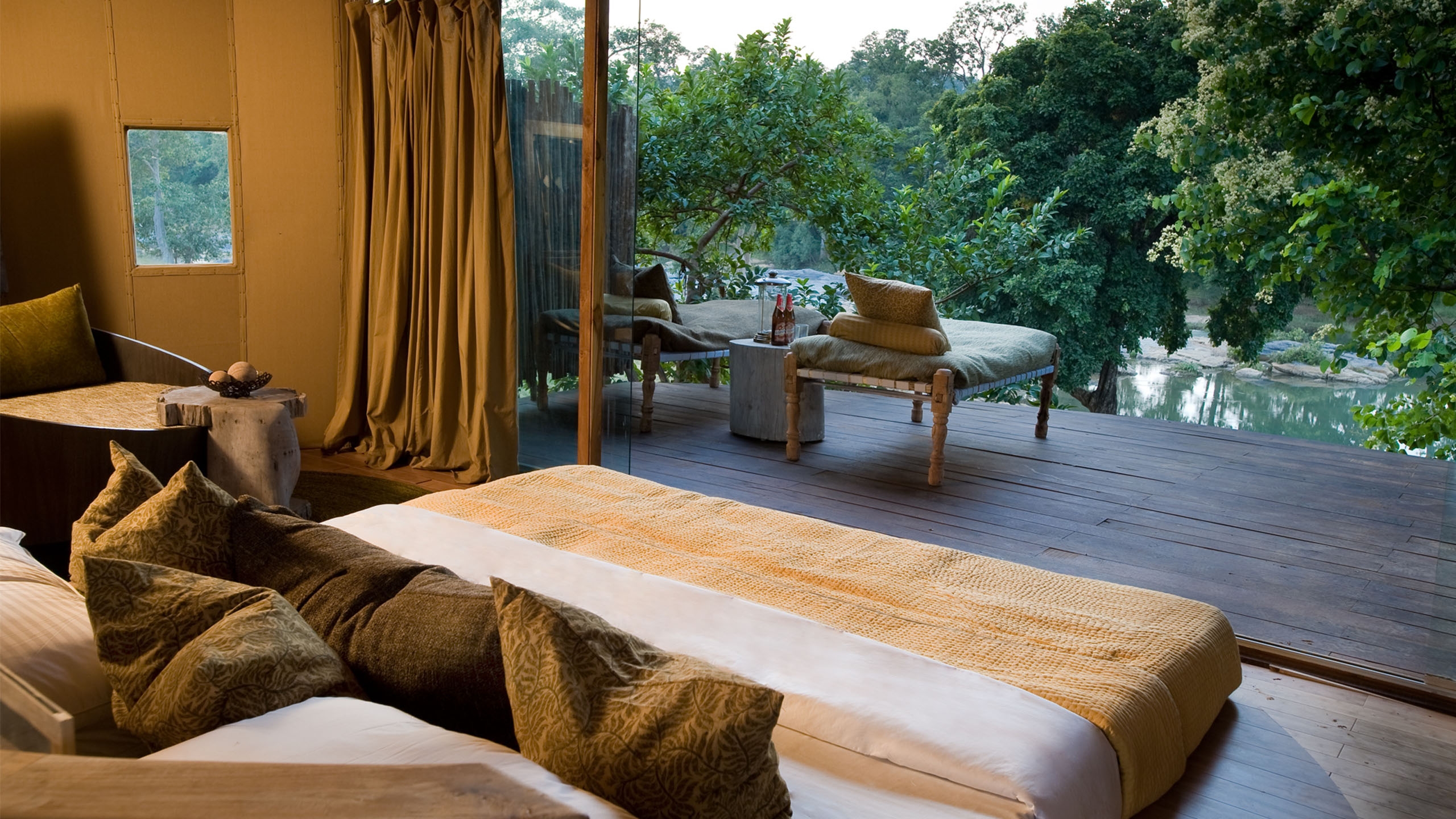 Overlooking the heart Kanha Tiger Reserve from the banks of the Banjaar River, Banjaar Tola is an African-style luxury safari camp with a dash of chic modern style twinned with local touches such as Bastar tribal artwork, hand-crafted furniture and rich block-printed Madhya Pradesh fabrics.