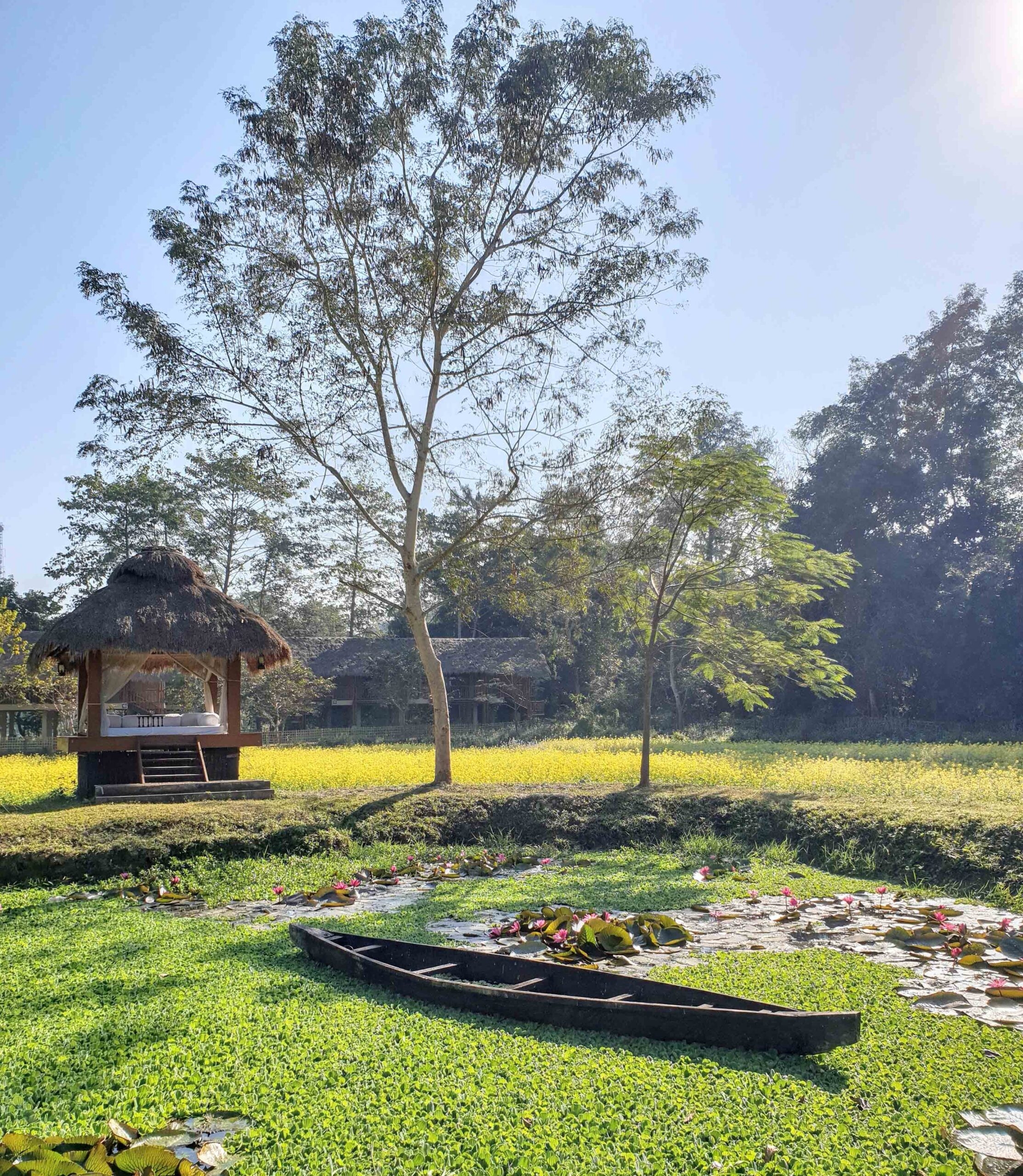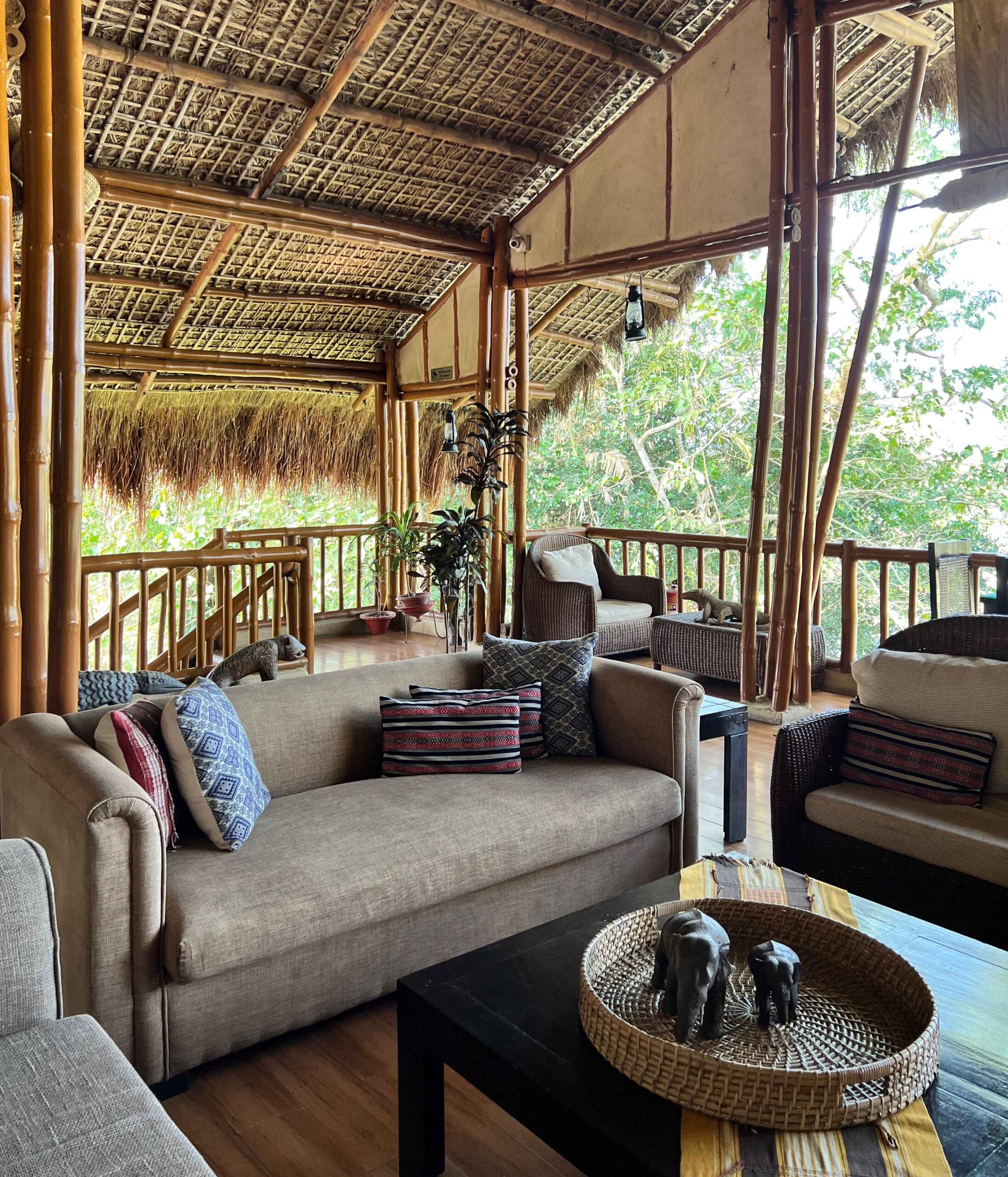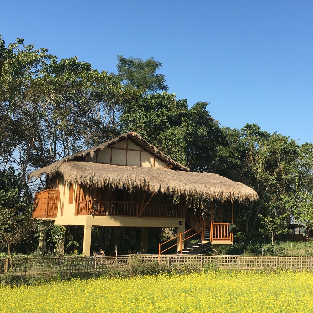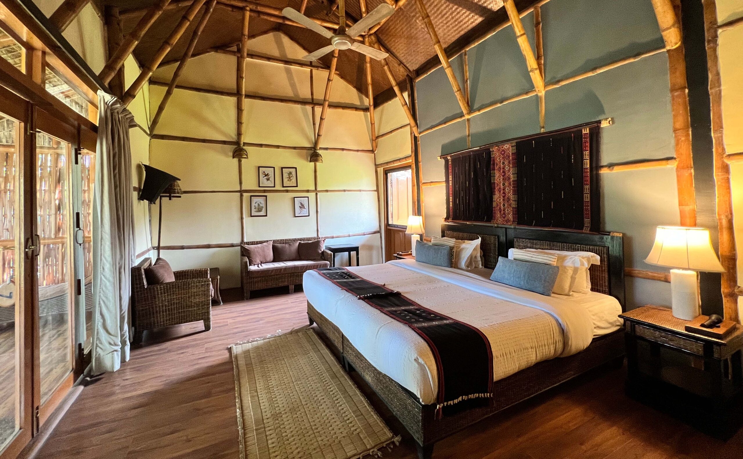 Nestled on the edge of Kaziranga National Park and overlooking the river, Diphlu River Lodge offers you an idyllic retreat surrounded by nature. The lodge features eight individual cottages and four semi-detached cottages, all constructed from natural materials like bamboo and wood, with thatched roofs that blend seamlessly into the forest environment.