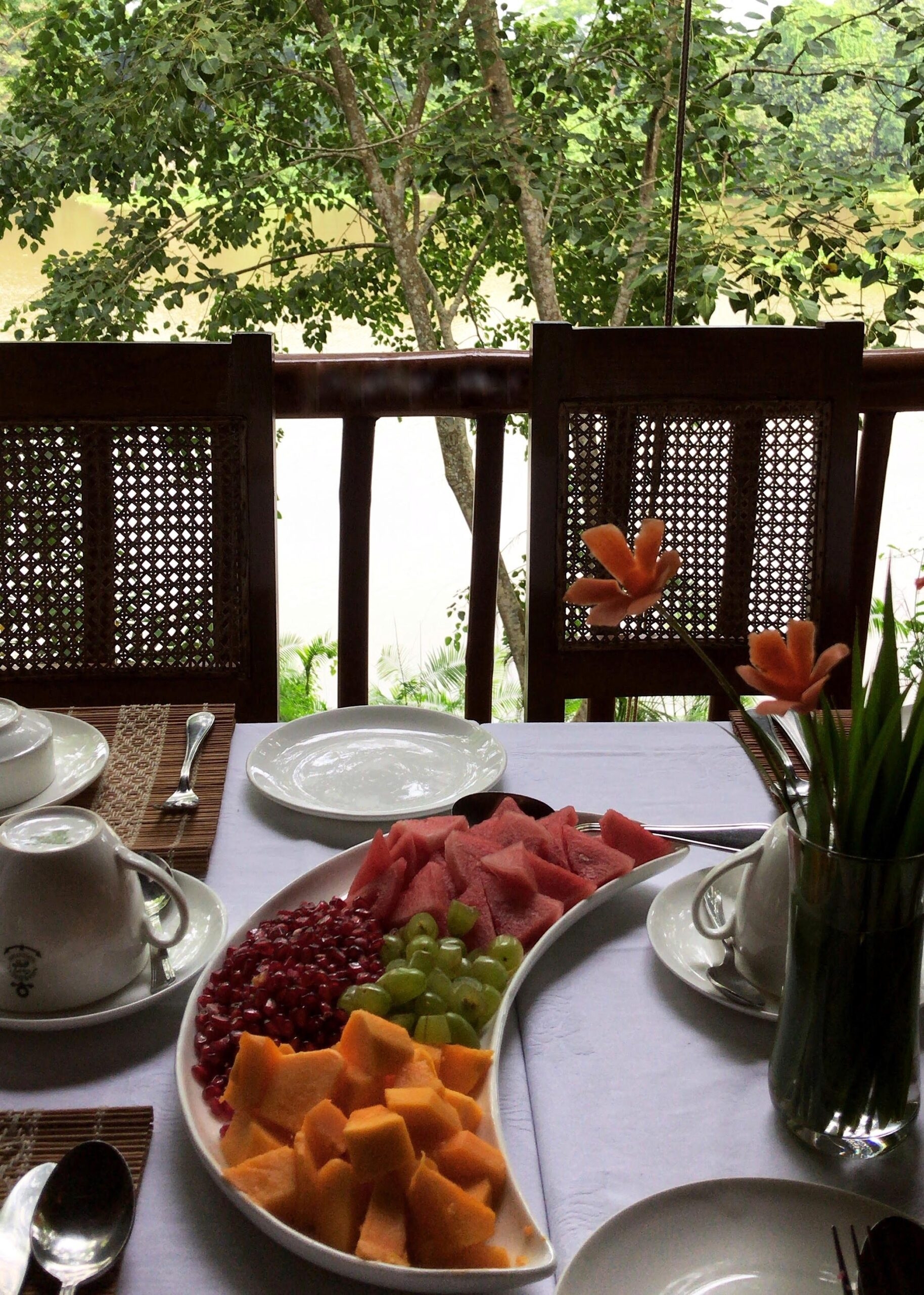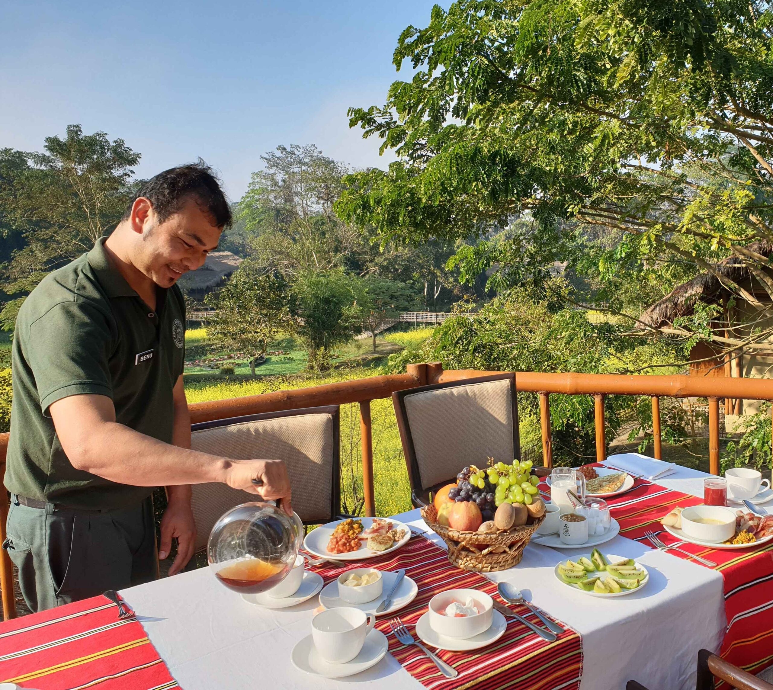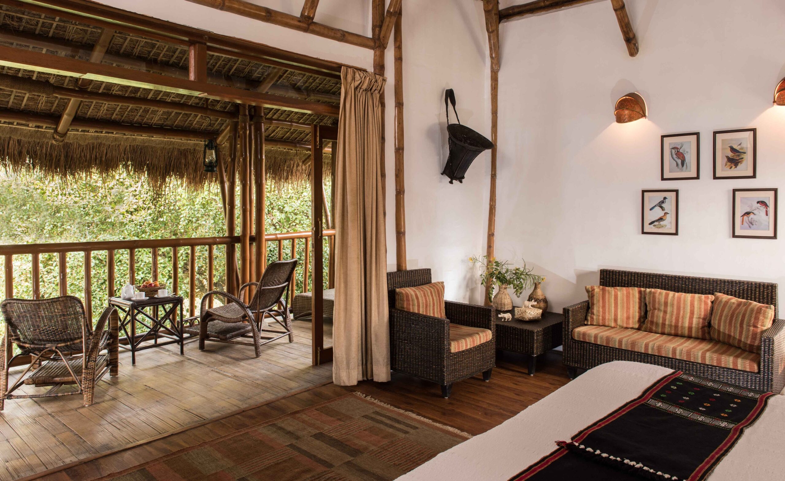 The lodge’s charming common area, known as ‘Machan’ (jungle platform), is a raised, air-conditioned river-side space. It serves as both a sitting and dining area, opening onto two verandahs. The larger space, with its high thatched ceiling, wooden flooring and well-equipped bar, offers stunning views of the river and the national park, making it an ideal spot for birdwatching or scanning the banks for wildlife. The smaller verandah overlooks meticulously tended farmland, providing a perfect setting for al fresco breakfasts.