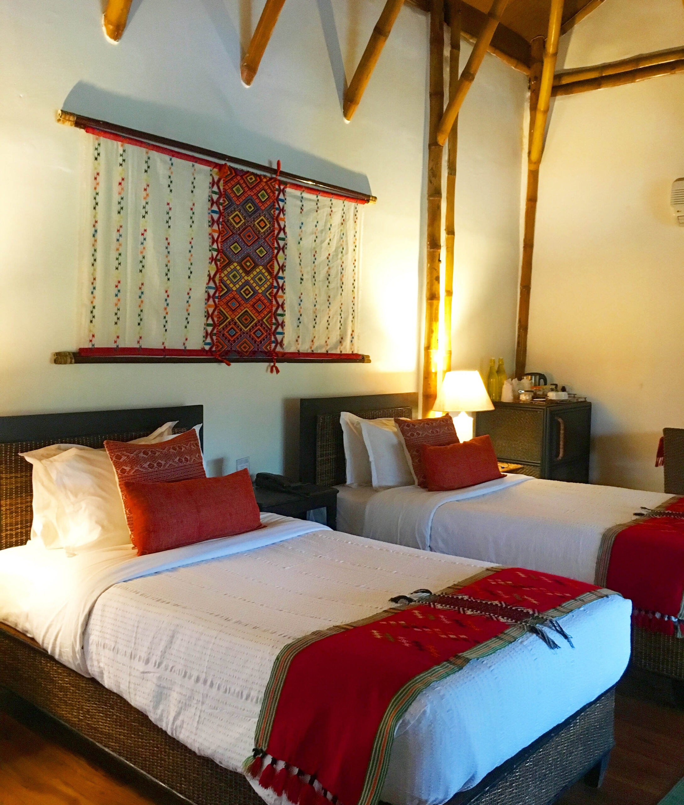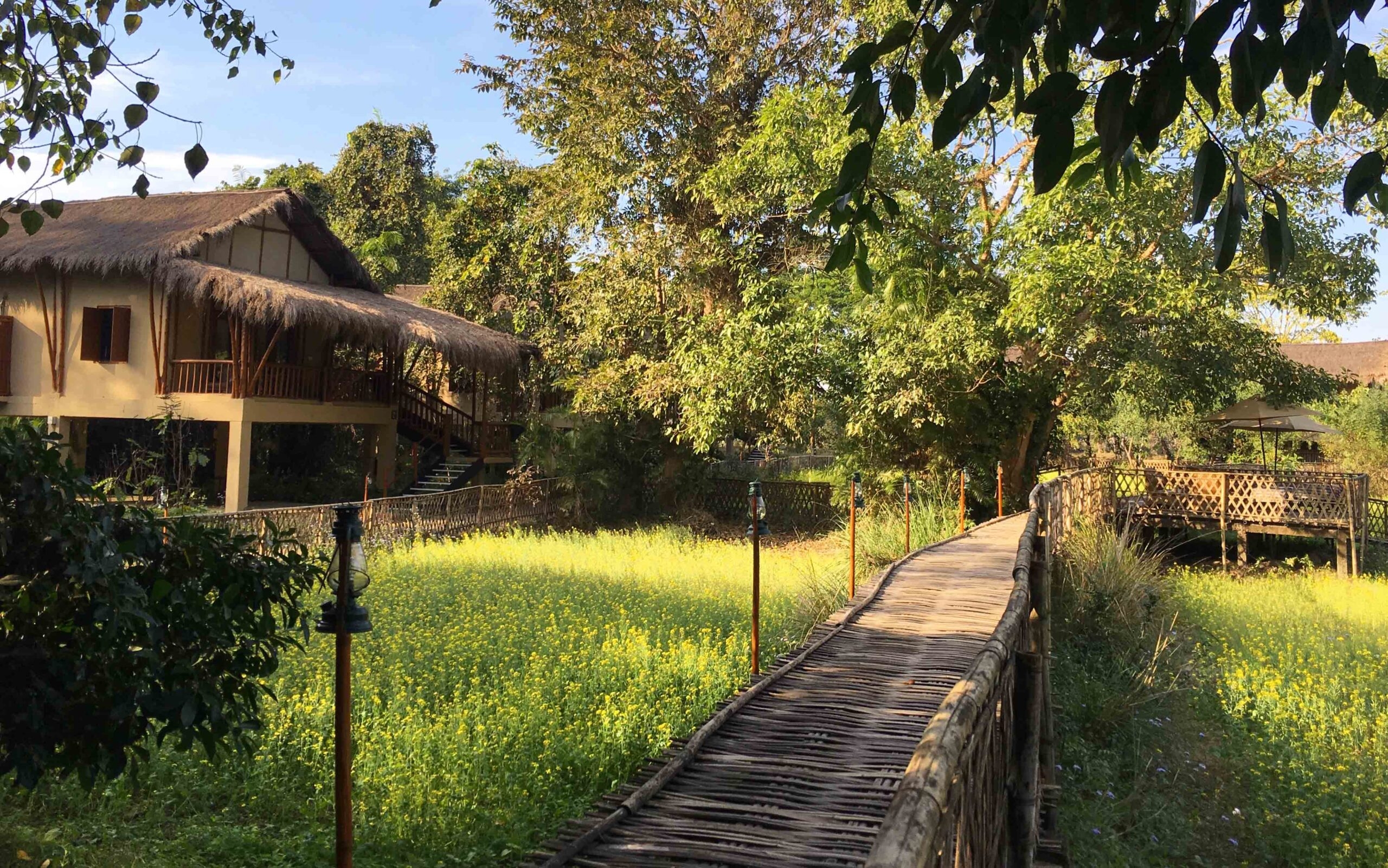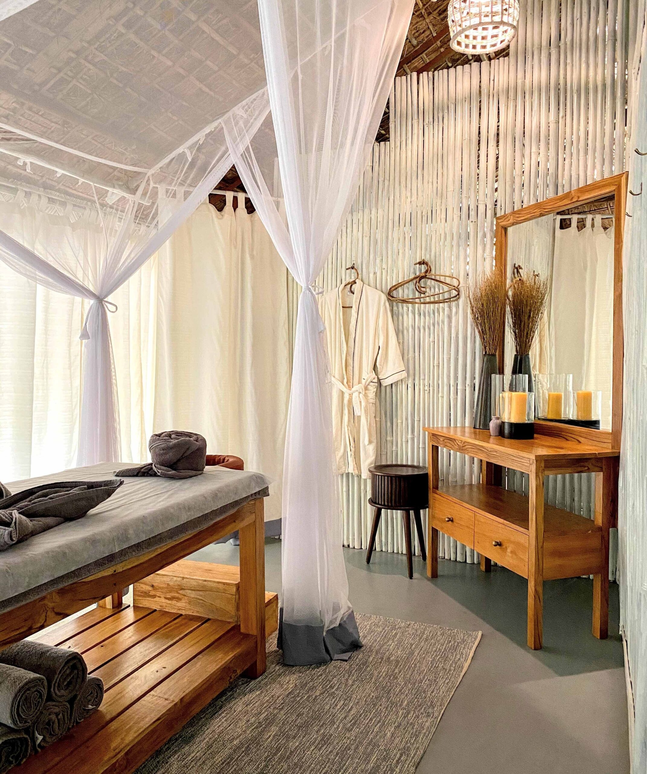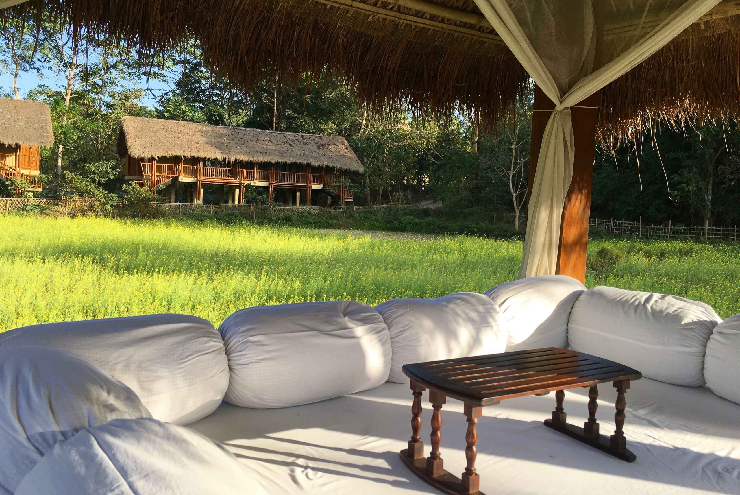 The 12 cottages can accommodate up to 24 guests. Four of the cottages are river-facing, while the remaining eight offer views of the lush paddy fields. Each is equipped with an en-suite bathroom, featuring a spacious shower area, dressing room and fitted wardrobe. Wide folding glass doors open onto a verandah, where you can relax in cane chairs and enjoy your surroundings.