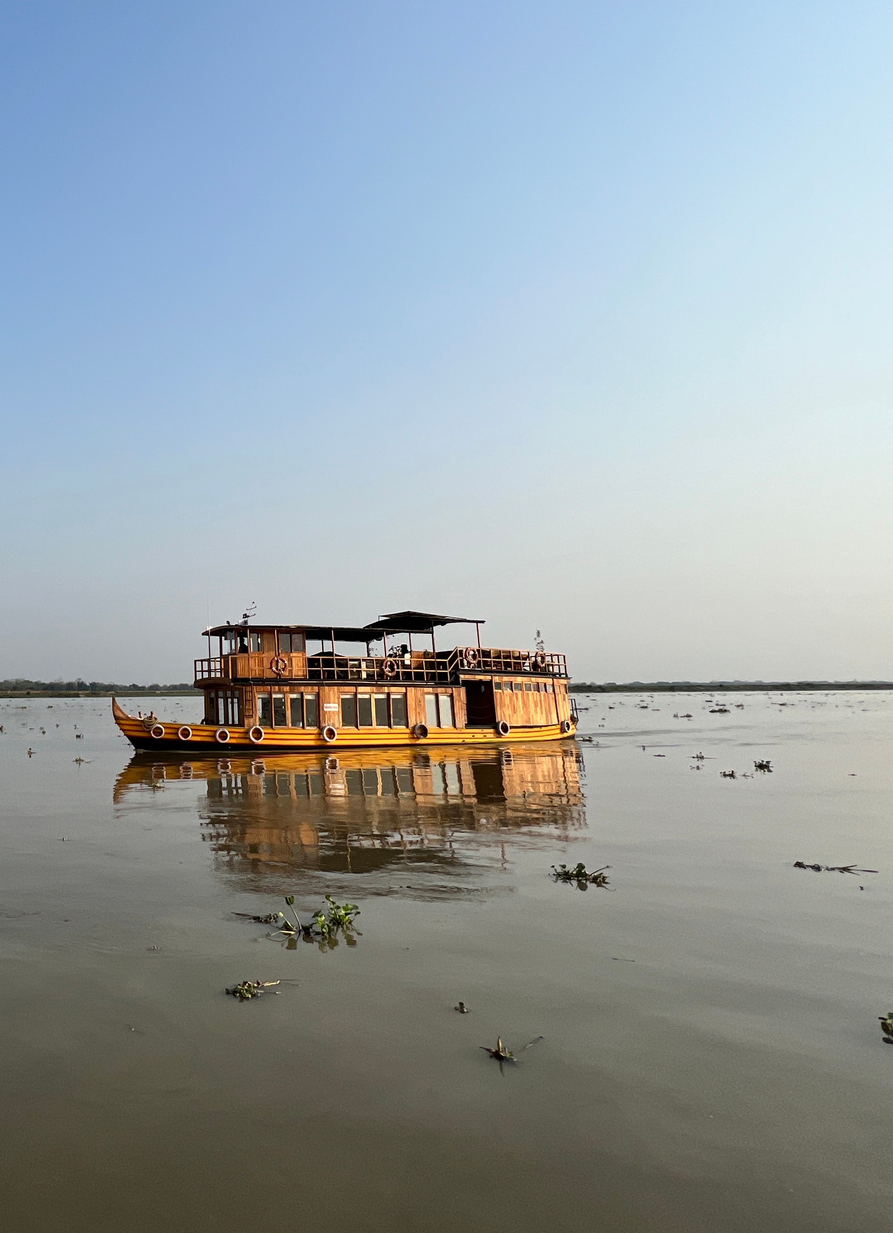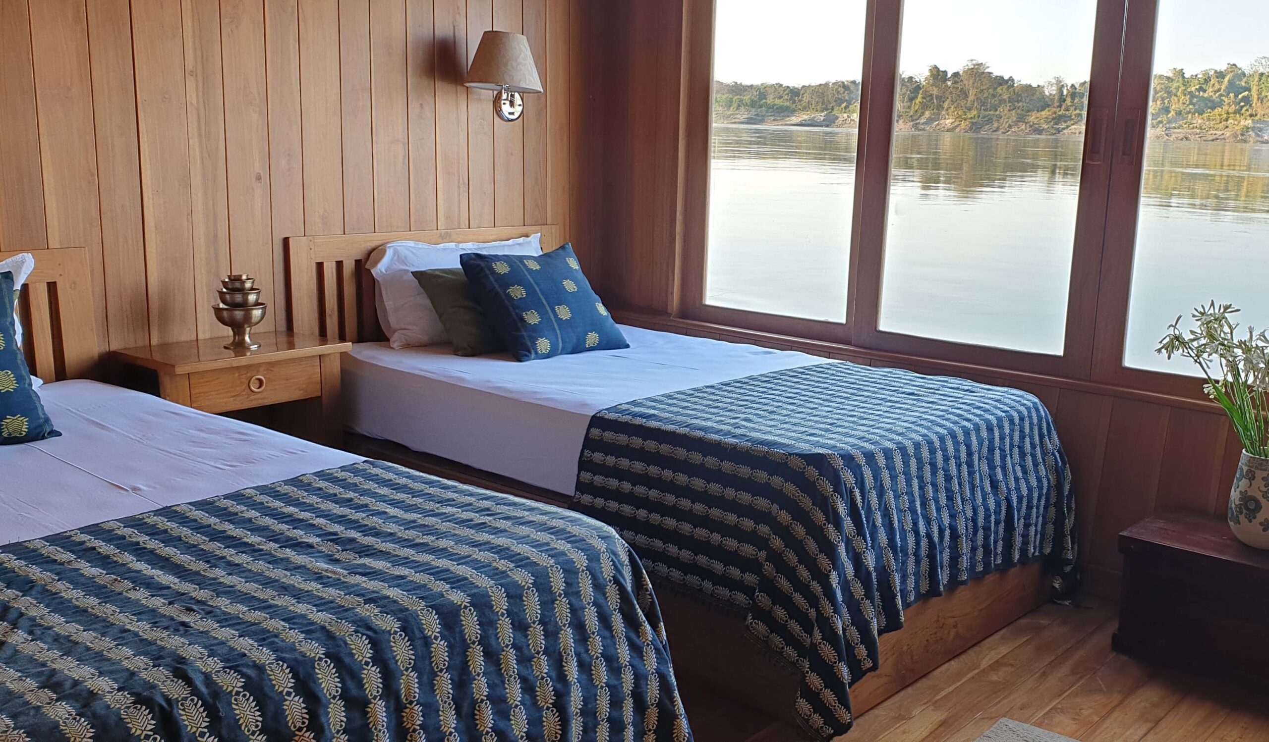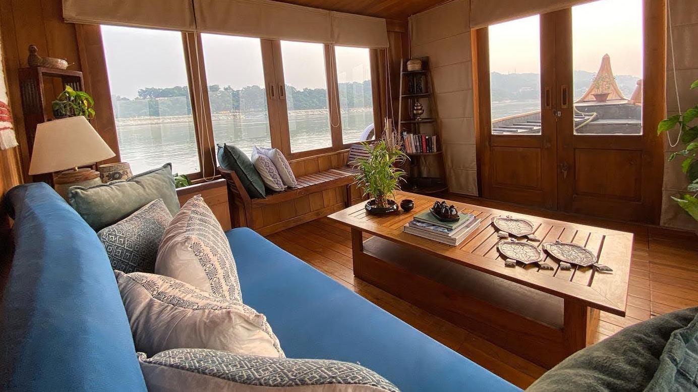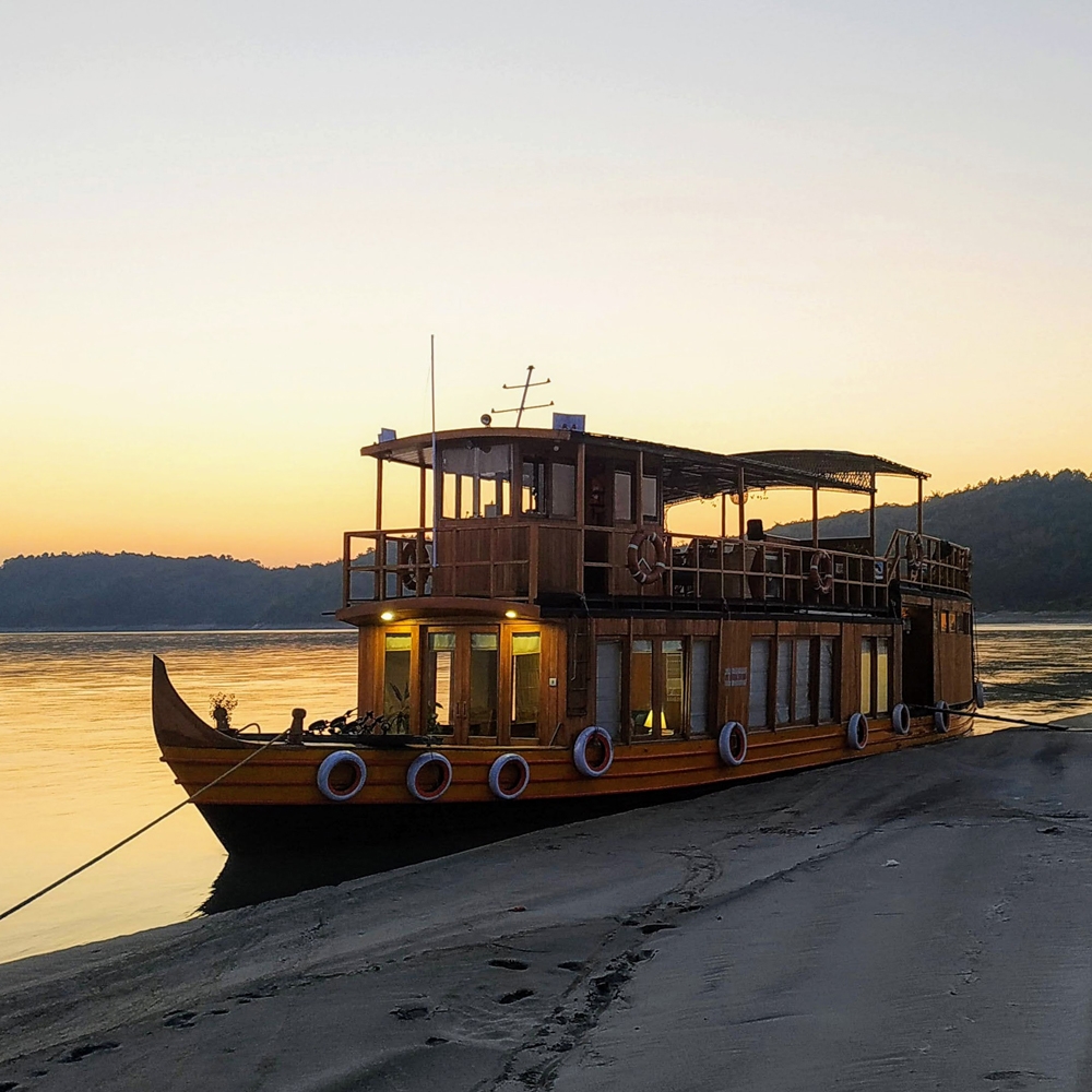The MV Rudra Singha is a beautifully crafted traditional Assamese pansoinau, a large flat-bottomed wooden boat, perfect for exploring the rural countryside in a unique way. This sturdy and expertly built private houseboat is designed to glide effortlessly through the shallowest channels of the Brahmaputra River. Your spacious en-suite cabin features intricate detailing by local artisans and large floor-to-ceiling glass windows. From your comfortable private lounge, enjoy the views of the river and its scenic banks. Relax on the upper deck, soaking up the sun as the vessel gently drifts along the mighty river. Savor delicious meals prepared by the resident chef, served either on deck or on a secluded beach.