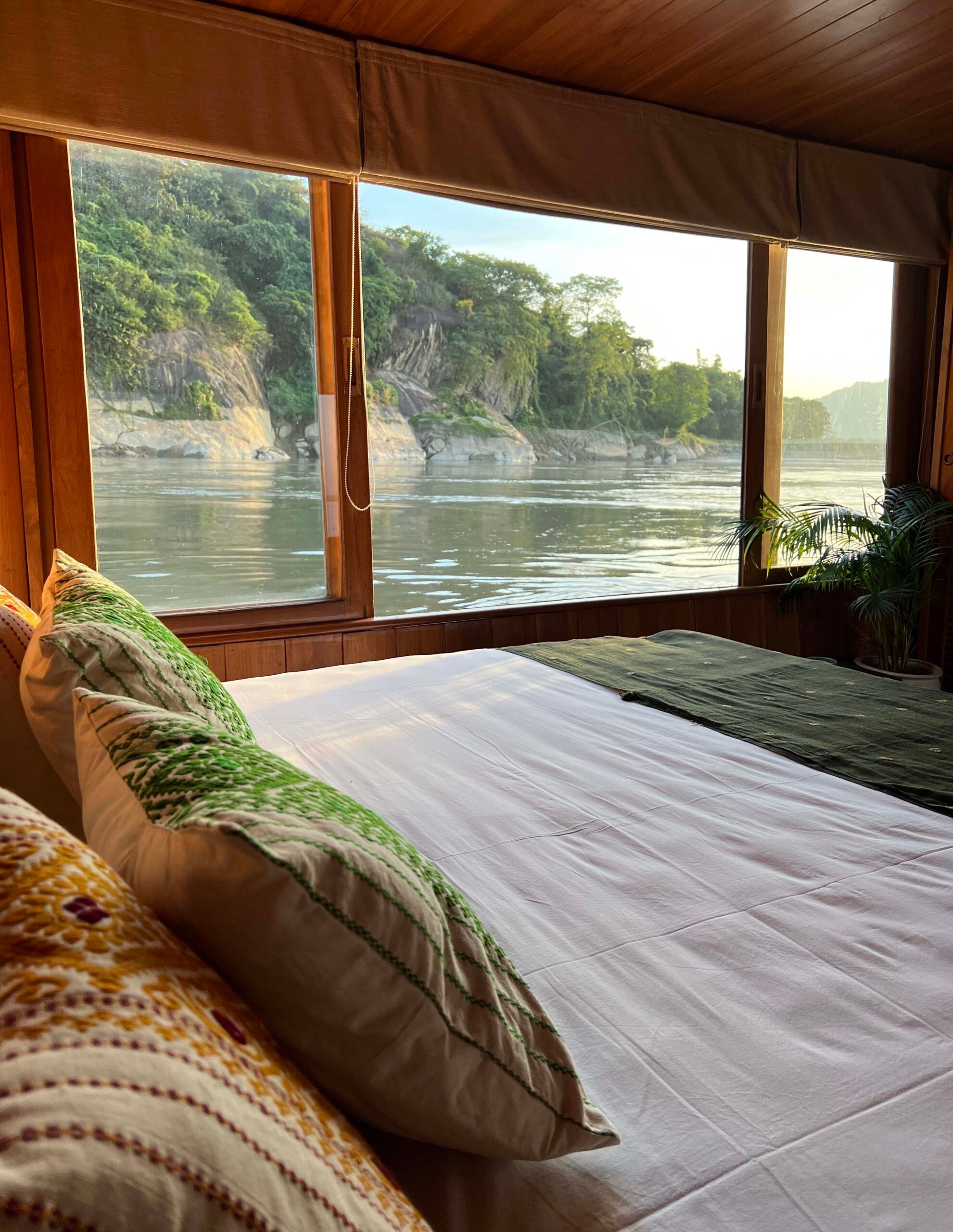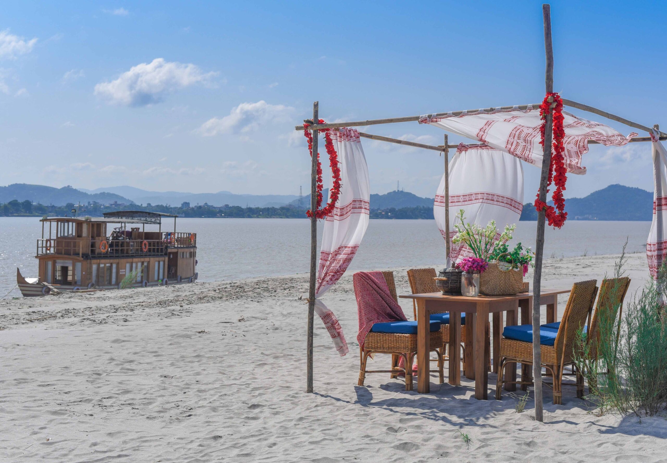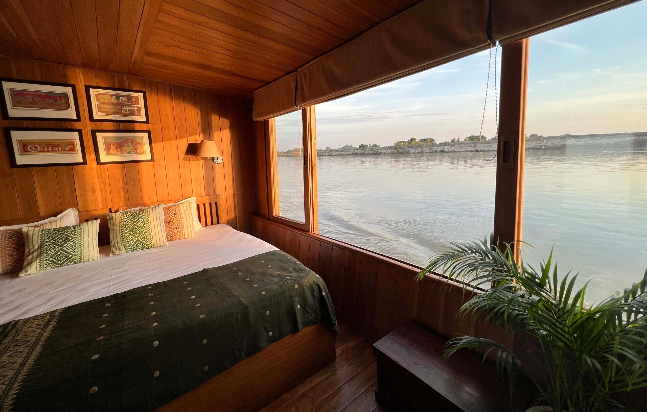 The MV Rudra Singha is a beautifully crafted traditional Assamese pansoinau, a large flat-bottomed wooden boat, perfect for exploring the rural countryside in a unique way. This sturdy and expertly built private houseboat is designed to glide effortlessly through the shallowest channels of the Brahmaputra River. Your spacious en-suite cabin features intricate detailing by local artisans and large floor-to-ceiling glass windows. From your comfortable private lounge, enjoy the views of the river and its scenic banks. Relax on the upper deck, soaking up the sun as the vessel gently drifts along the mighty river. Savor delicious meals prepared by the resident chef, served either on deck or on a secluded beach.