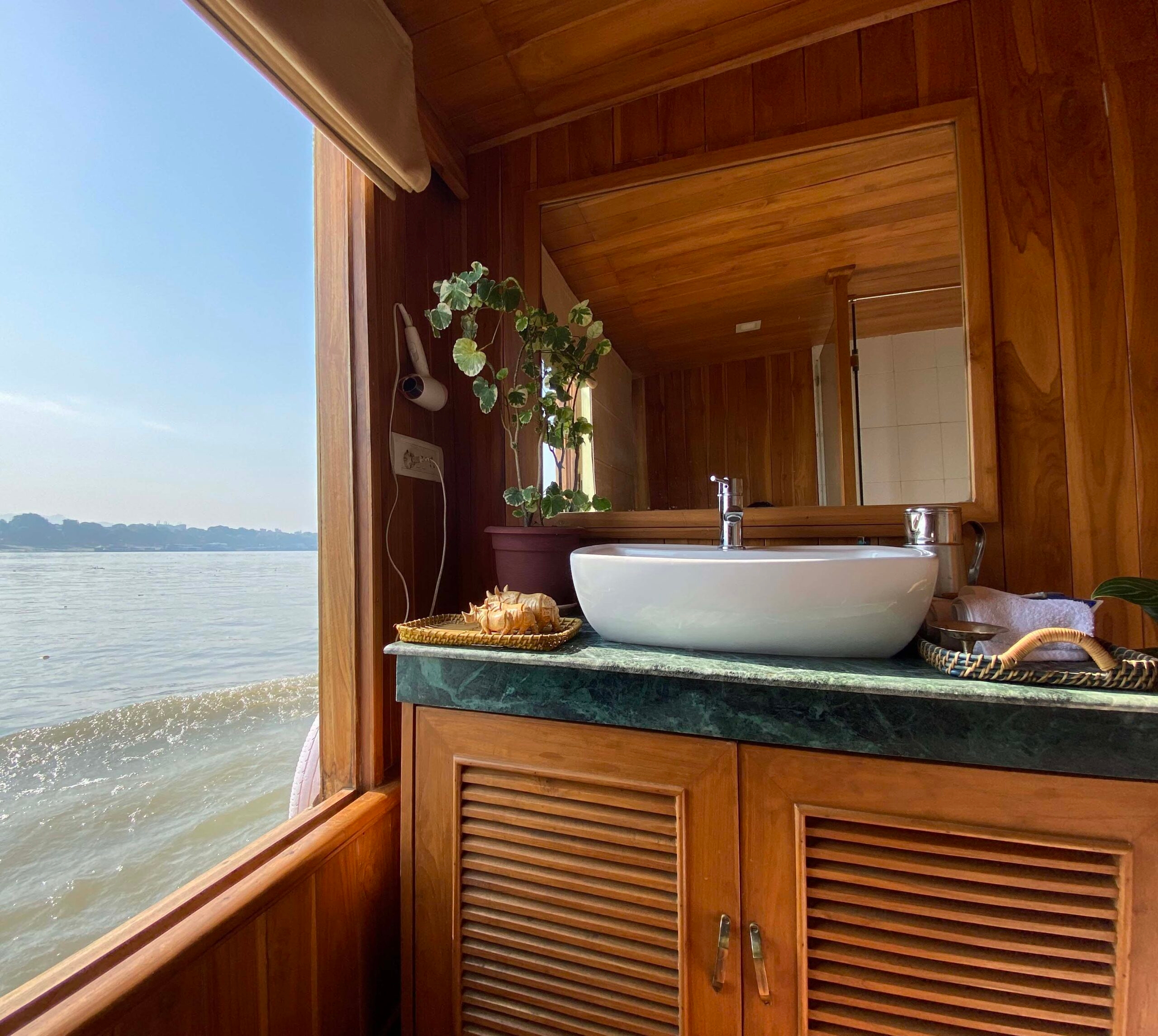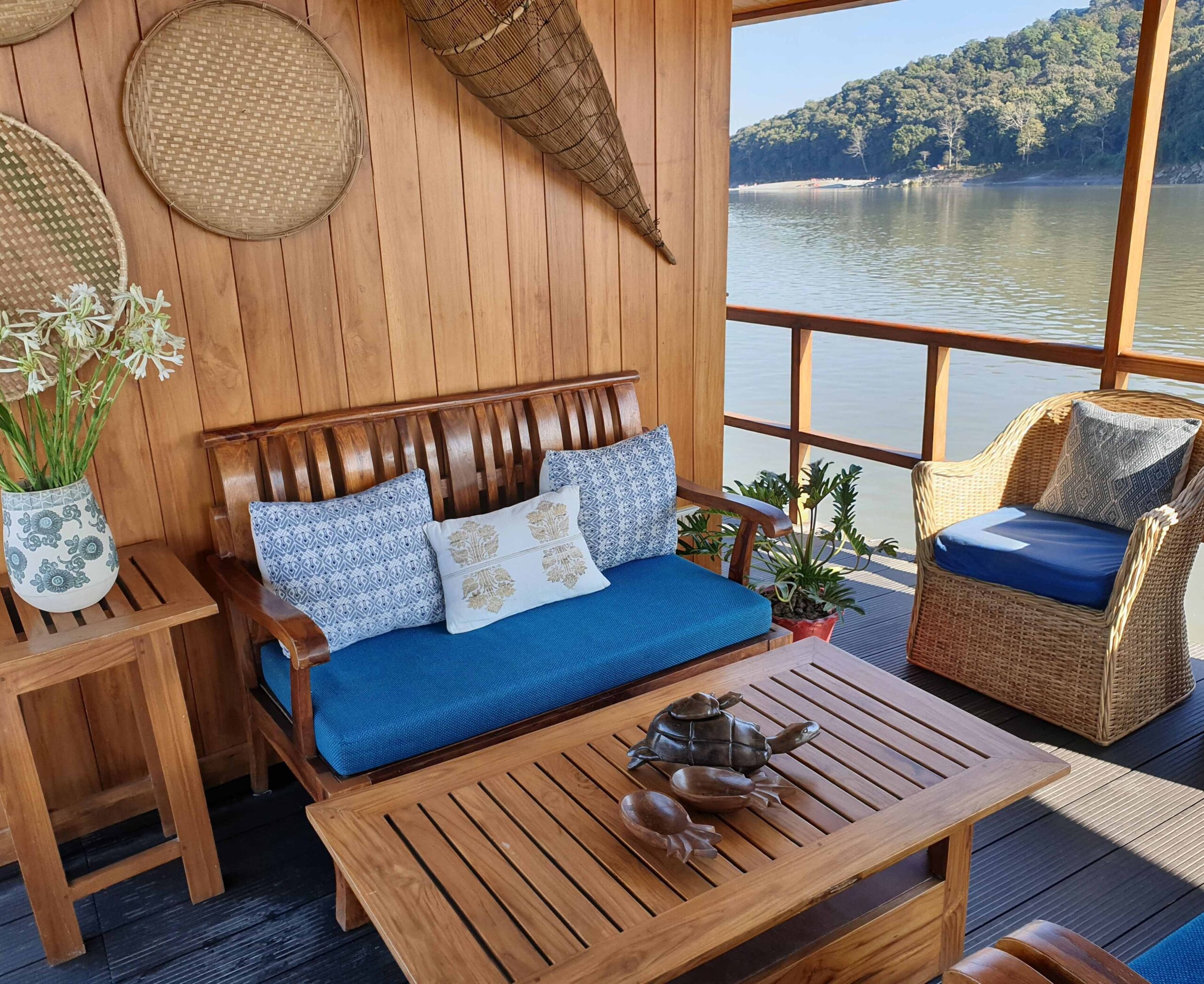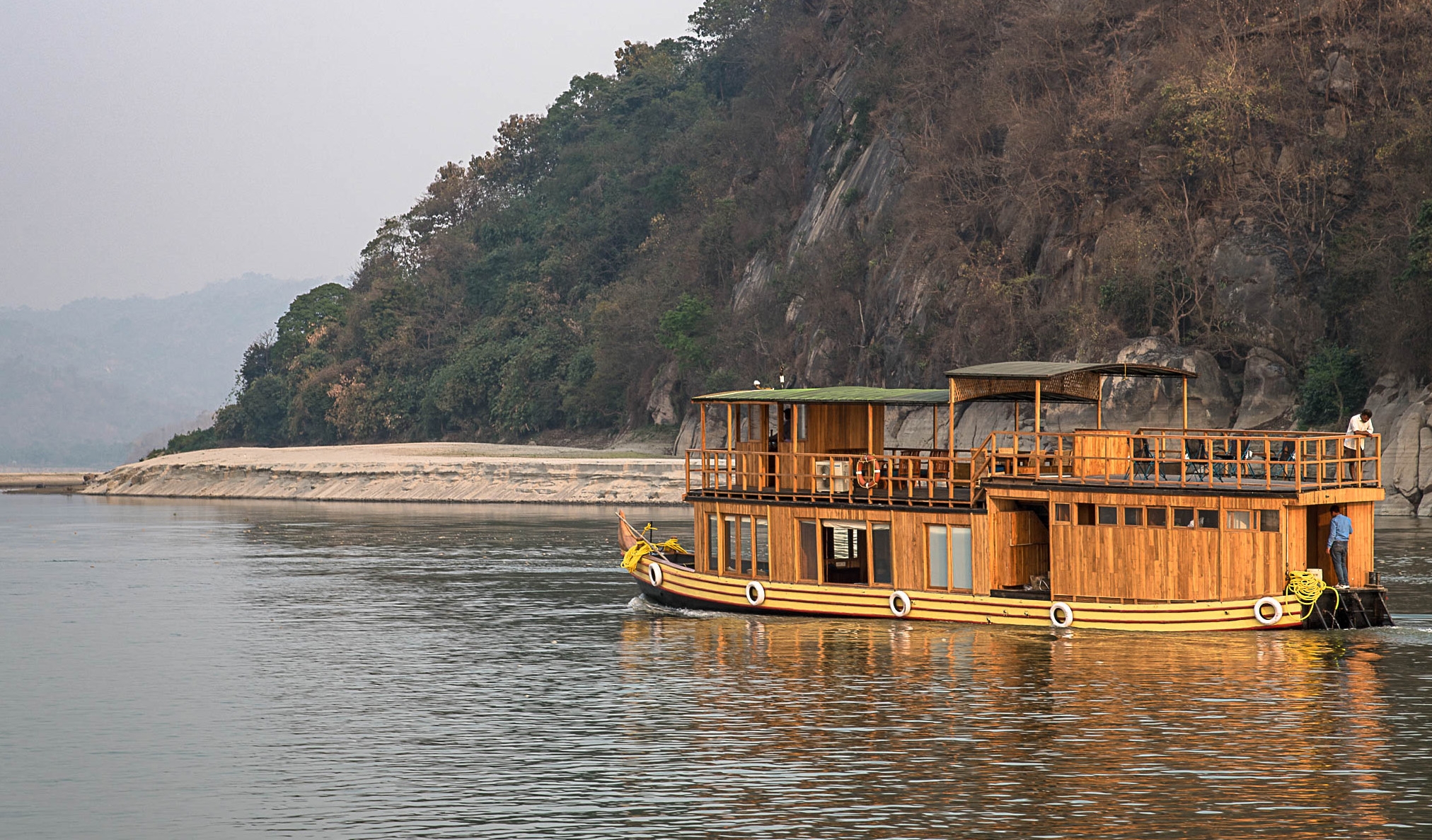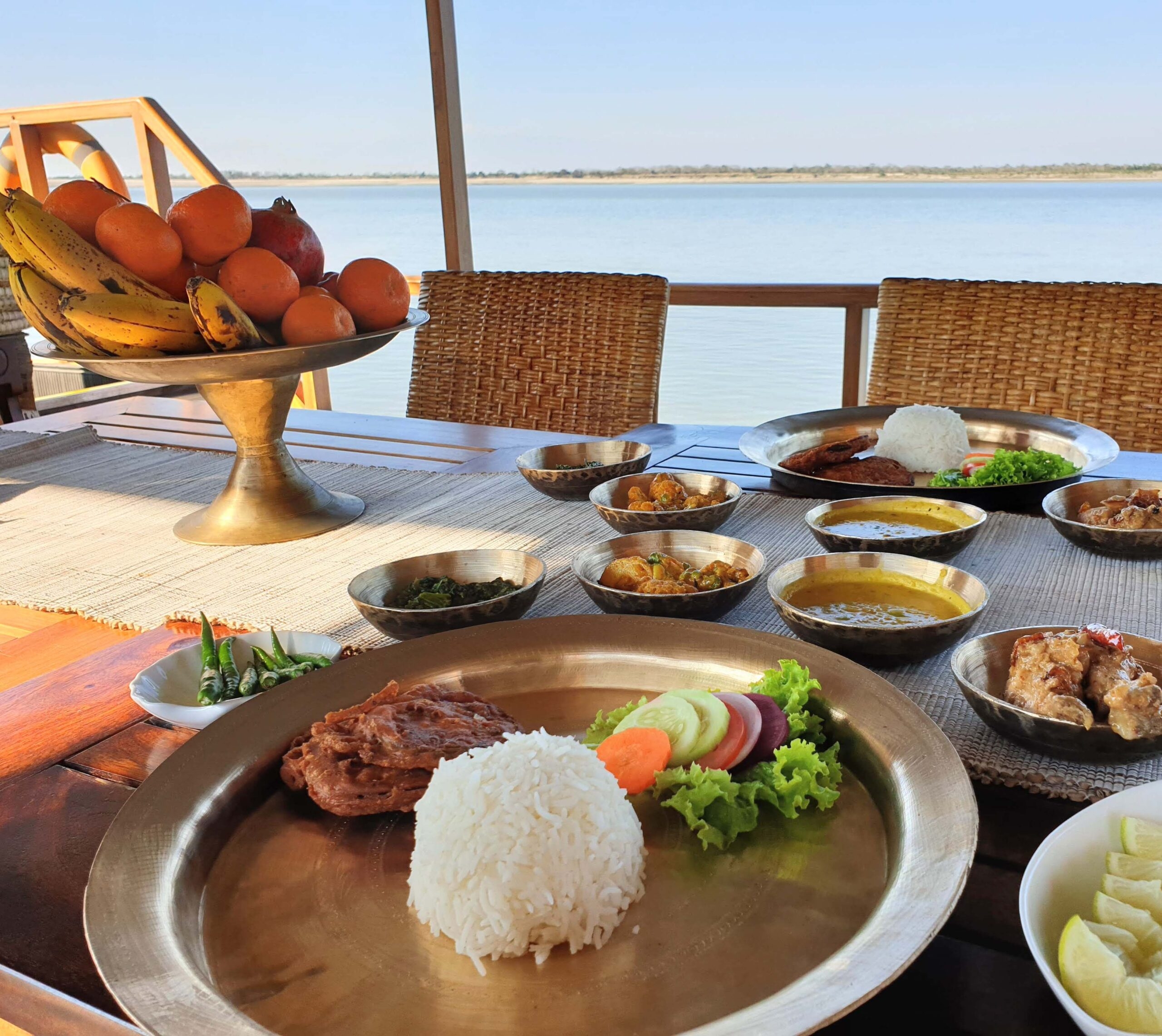 The MV Rudra Singha is a beautifully crafted traditional Assamese pansoinau, a large flat-bottomed wooden boat, perfect for exploring the rural countryside in a unique way. This sturdy and expertly built private houseboat is designed to glide effortlessly through the shallowest channels of the Brahmaputra River. Your spacious en-suite cabin features intricate detailing by local artisans and large floor-to-ceiling glass windows. From your comfortable private lounge, enjoy the views of the river and its scenic banks. Relax on the upper deck, soaking up the sun as the vessel gently drifts along the mighty river. Savor delicious meals prepared by the resident chef, served either on deck or on a secluded beach.