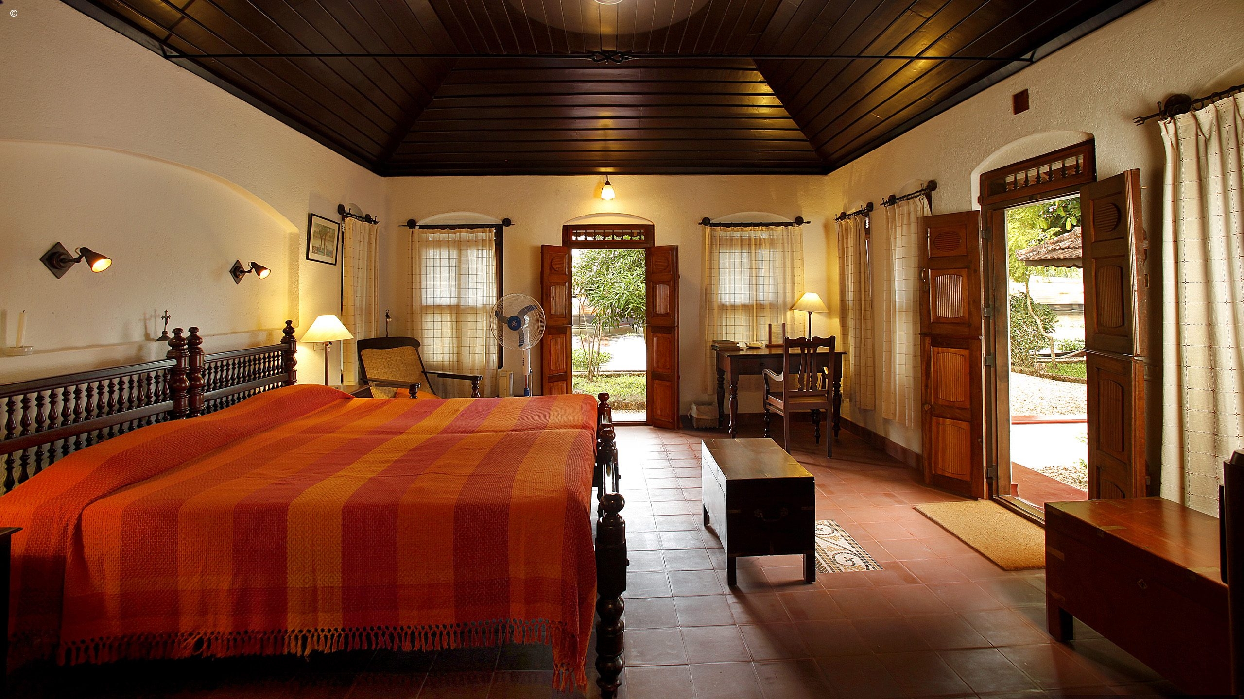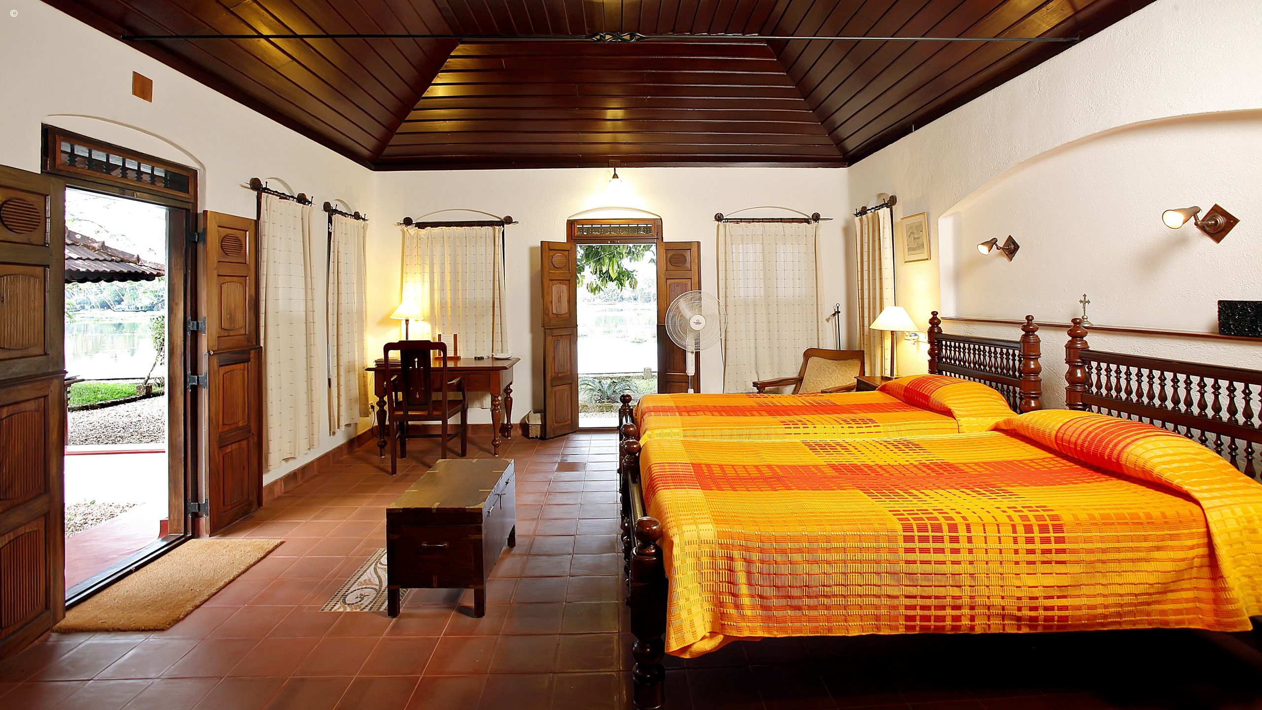 Each of the six spacious villas are named after local plants, trees and birds and look out over the peaceful backwaters. Decor is simple but homely with tiled floors, wooden ceilings and antique furniture. Windows and doors flood the villas with natural light and a verandah is the perfect spot from which to sit back and watch life on the river.