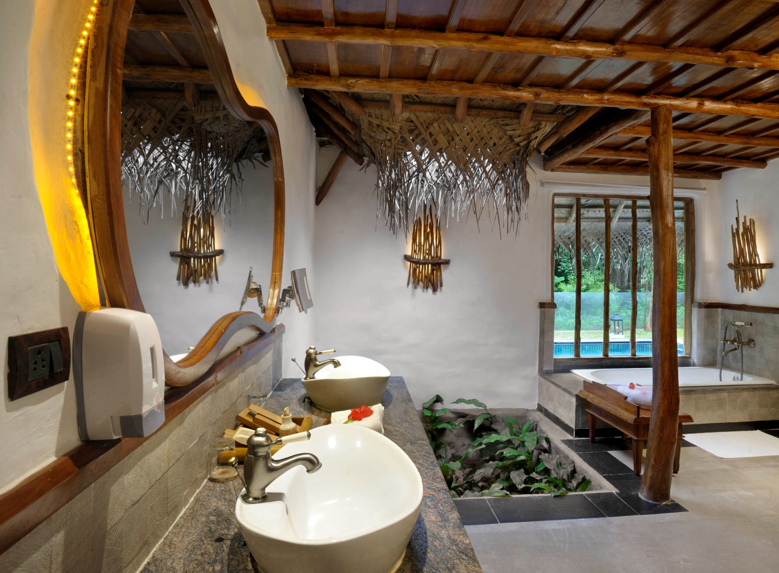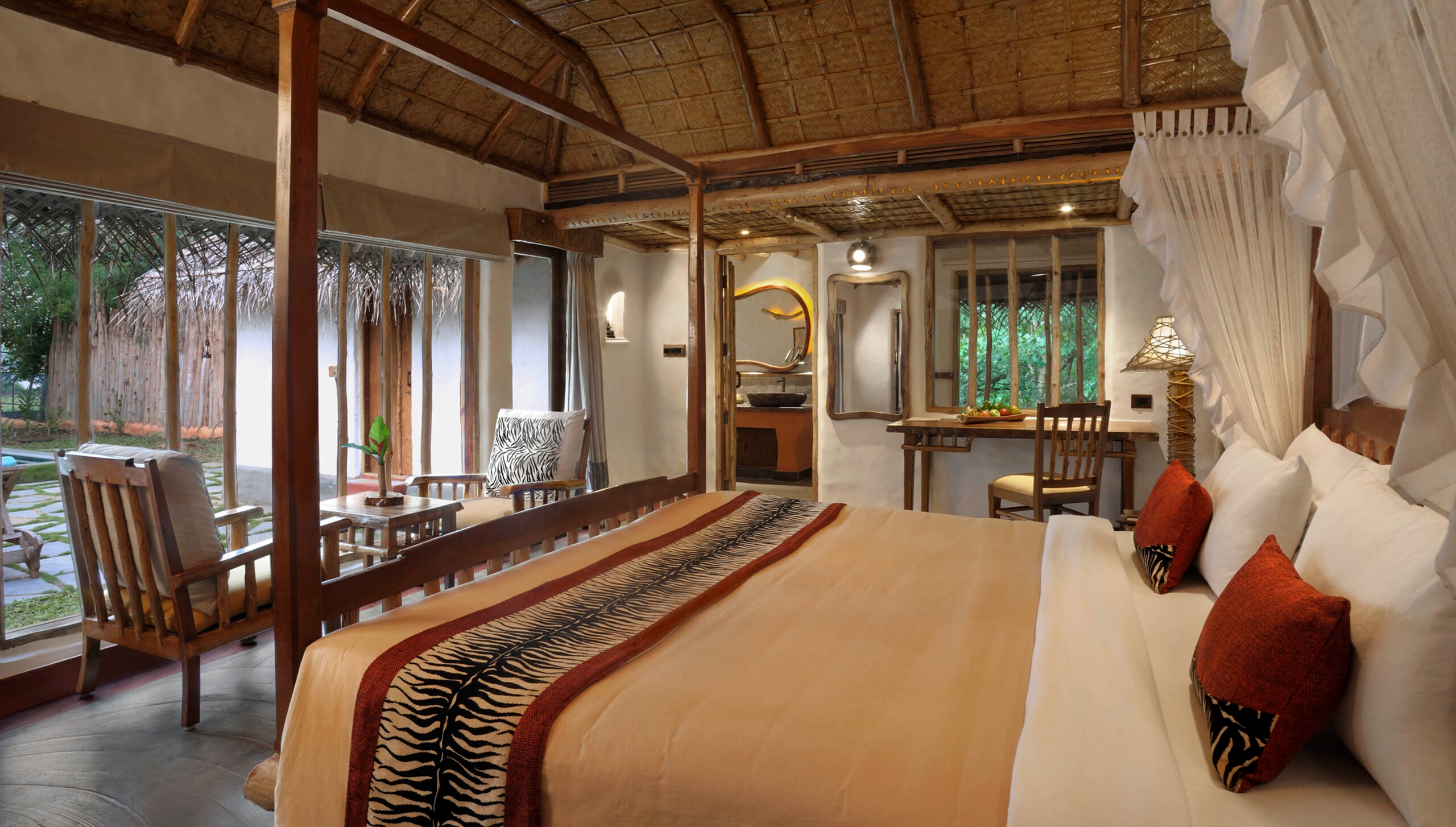 Although each room has minor design variations, all share the same elegant and comfortable features. The Safari Hut includes separate living and dining areas, an en-suite bedroom, and a private courtyard with a shallow water-jet pool, providing a perfect retreat for privacy. Drawing inspiration from the traditional Kuruba homes, the Pool Huts are ideal for peace and tranquility. The Pool Reserve features spacious living and dining areas, a private courtyard with a heated pool, and a unique Star Bed for stargazing under the clear Kabini night sky.
