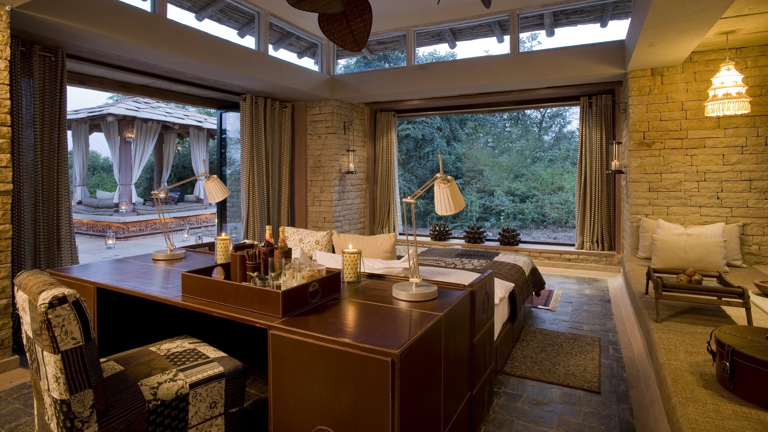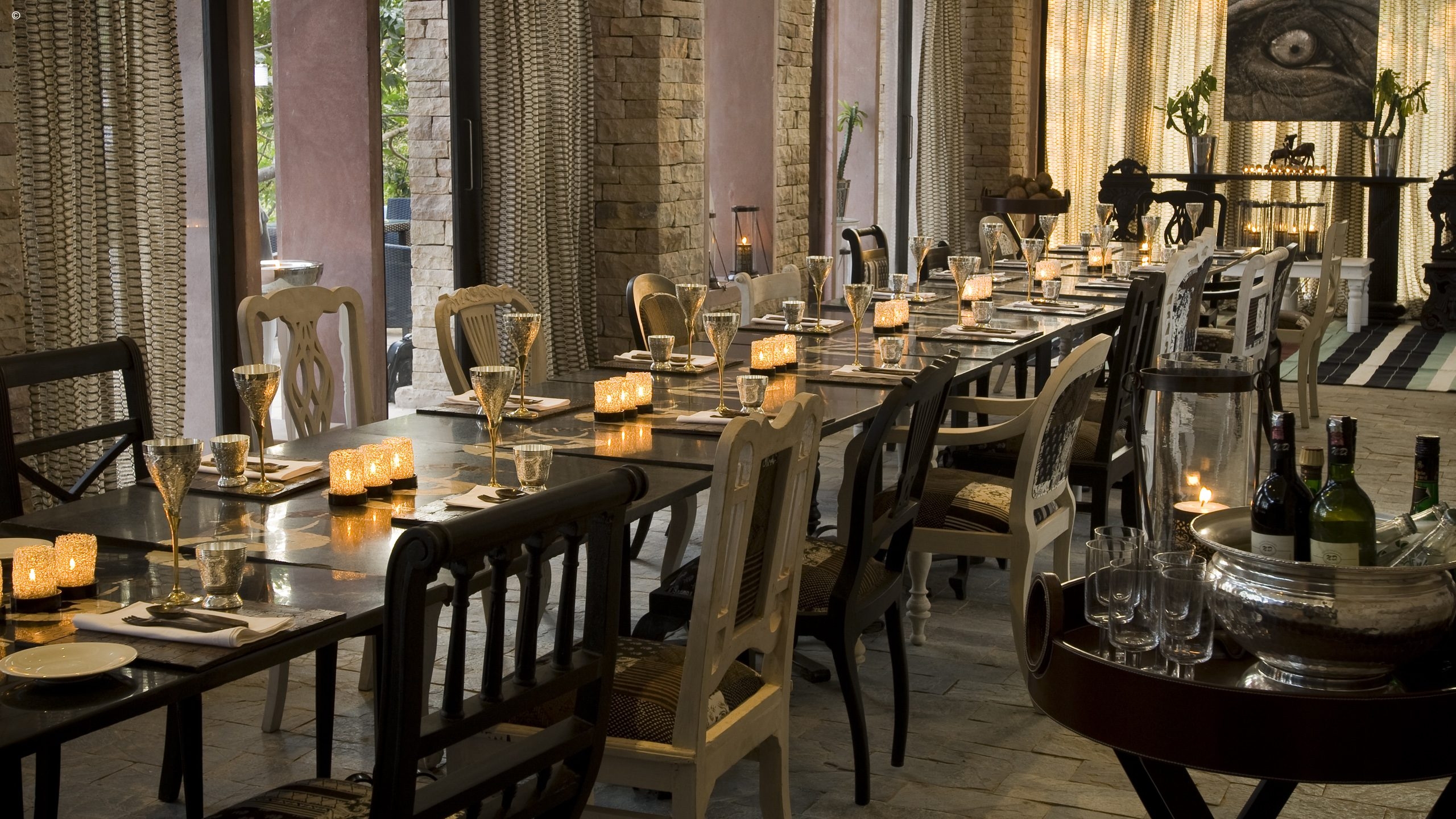 The lounge is bright and spacious and features a covered decking that looks out over the Vindhya Hills. Breakfast is served while out on your game drive and come evening you can choose to dine privately atop a beautifully restored ox wagon or under the twinkling stars of the night sky.