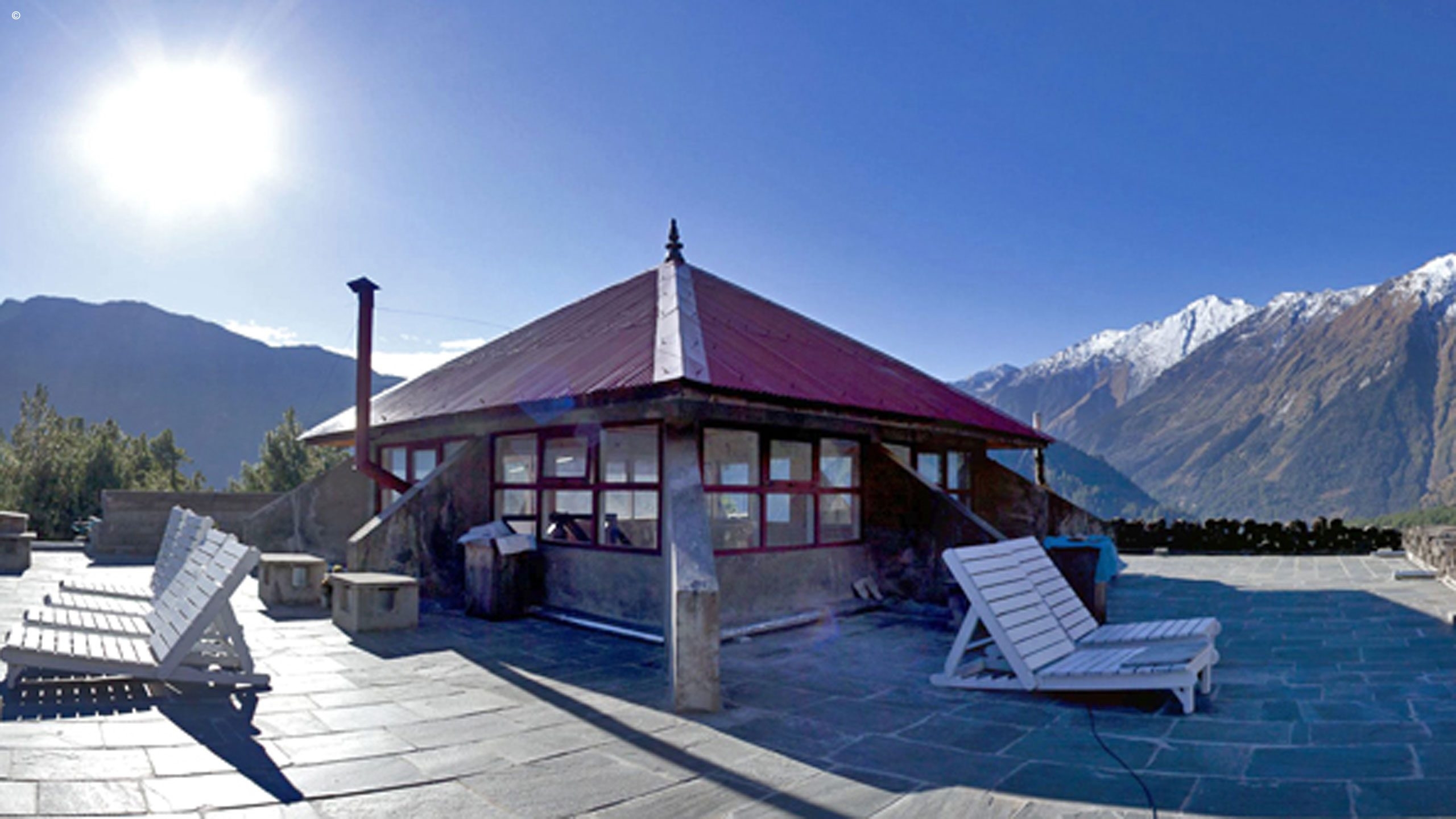 Remote trekking lodge surrounded by spectacular mountains